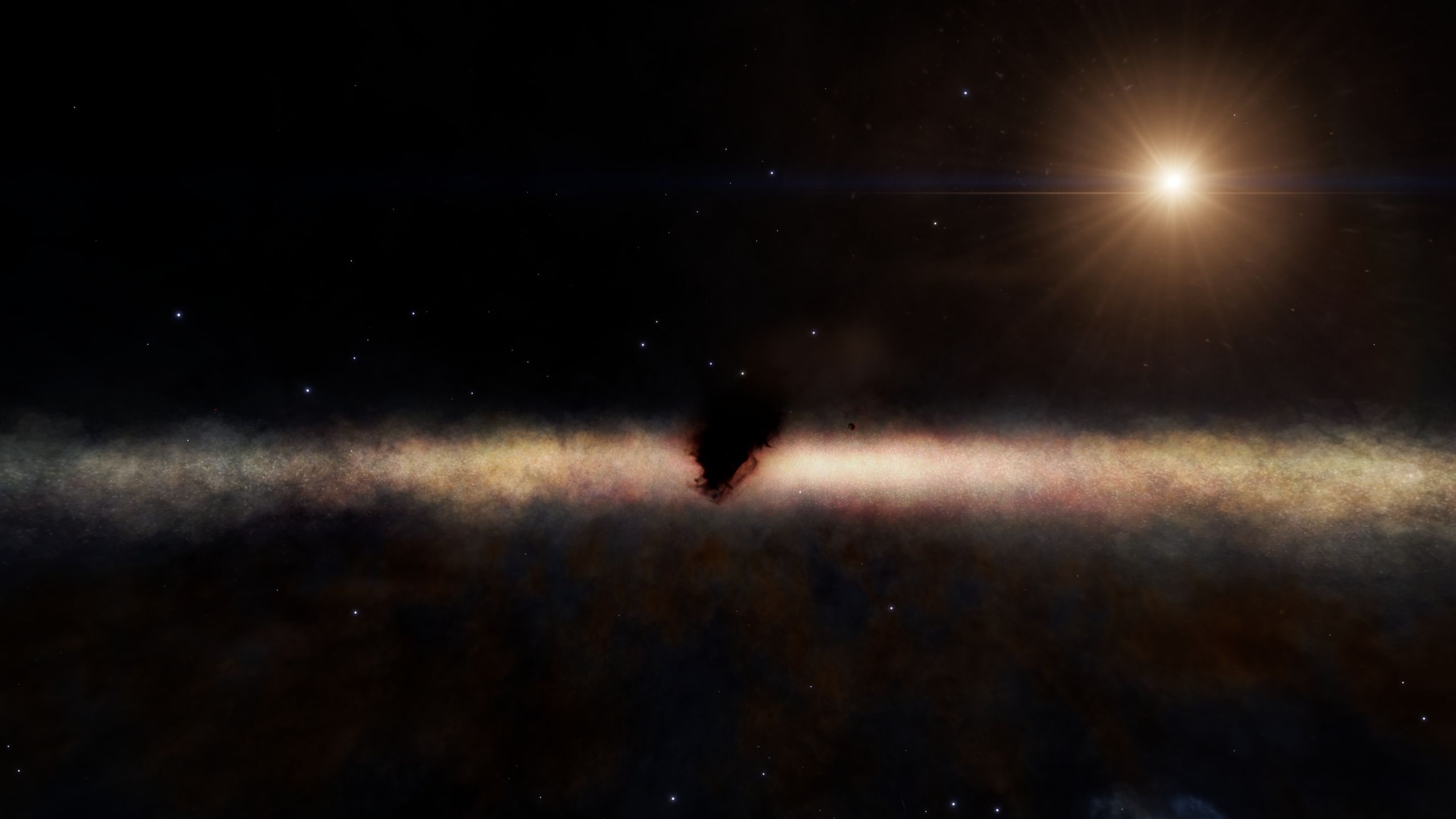Description: The Crooki AA-A h1 nebula, nicknamed the Lonely Lantern nebula, is the westernmost one in the galaxy. It's a dark cloud that's not much larger than most planetary nebulae though. There are no stars inside of it, so it can only be viewed from the outside. However, as it's a dark cloud that's 700 ly above the galactic plane, it's usually only visible if it's viewed with the Milky Way behind it. Being this far up above the Perseus Arm offers some good views of the galaxy instead. Intrepid pilots flying ships with high jump ranges can travel as far as 1,600 ly above to get an even better view. Image credit: main image by GMP, the other by CMDR Marx | |