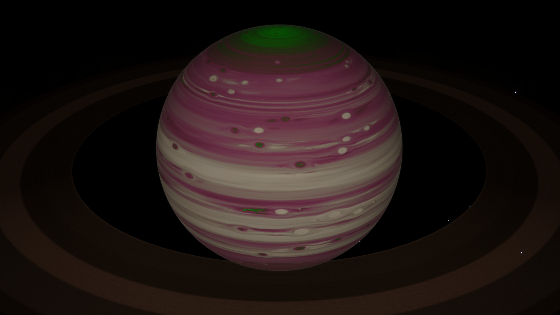 Summary: Planet 2 in this system is a stunning pink and white ringed Class I giant capped by vivid green poles. | |