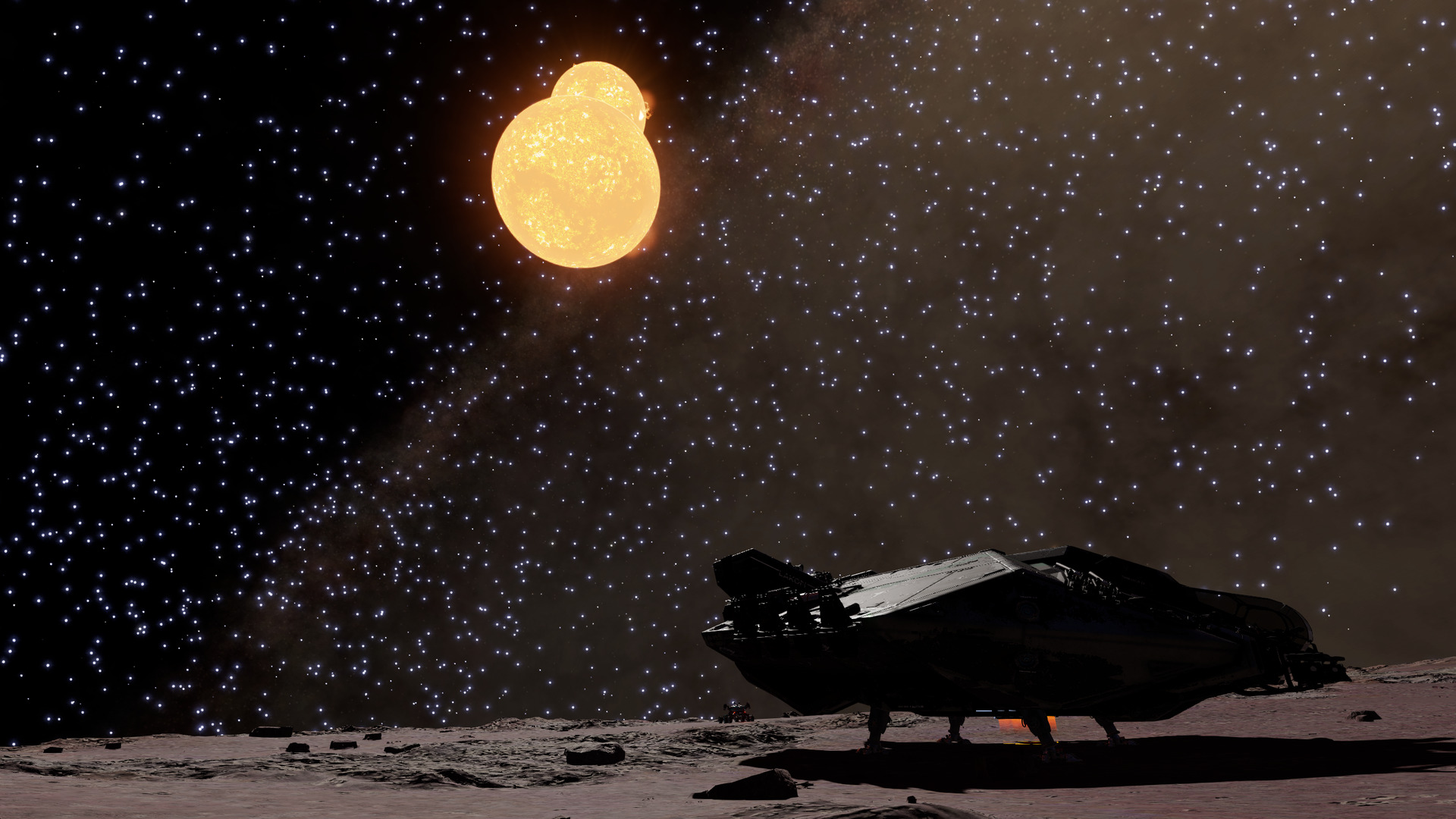 Description: The two class M giant are somewhat close to each other (594 ls) and have 5 landables bodies orbiting both of them: From their surfaces, the view of the other planets is quite impressive, especially when you have the two stars visible as well. View from AB 3: View from AB 1: | |