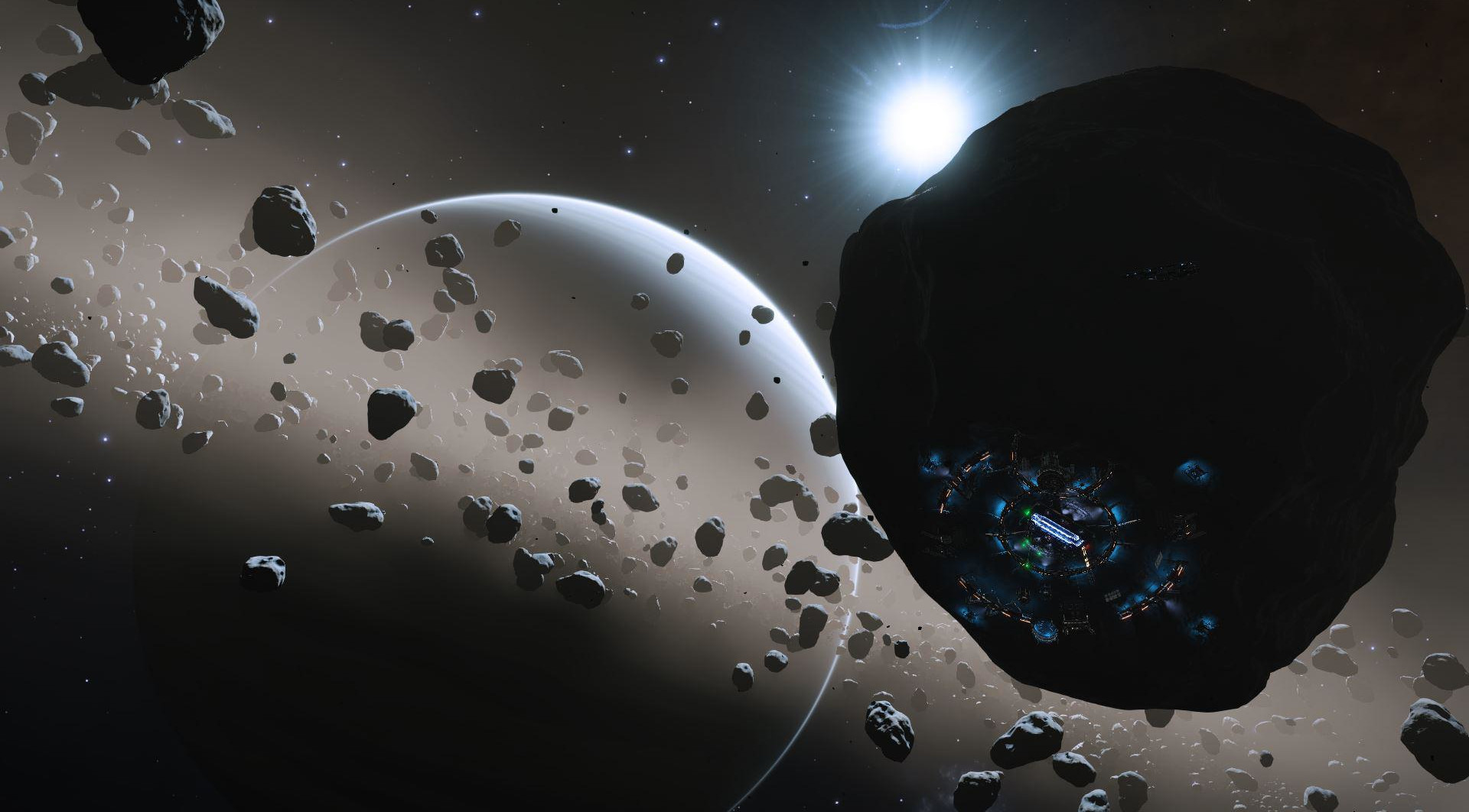 Description: The Trifid Nebula (not to be confused with the Trifid of the North nebula) is located 5,200 ly from Sol, and has a number of sights worth seeing. It is easily accessible, and a frequented stop for explorers headed towards Colonia, and the Colonia Bridge has a megaship named "CB-14 Ashwin's Delight" in the Trifid Sector GW-W d1-220 system. Additional amenities, though not a shipyard, can be found aboard the Observation Post Epsilon asteroid base in the nearby Trifid Sector IR-W d1-52 system. However, there is life in space in the systems nearby. The Trifid nebula houses Collared Pods, which are unique to this area. These large fauna are named after their distinctive collars, through which they absorb energy from starlight. When approached, they are rather harmless, and Commanders can gather tissue samples from them via a Research Limpet Controller. (These samples have no current use, save for selling for a few thousand credits.) Regardless of what the recon company might be observing, in later years a number dozens of surface settlements have been built in this system, most of them being mining (or related) installations. Image credits: nebula image by CMDR CallMeIke, asteroid base image by asd1o1, Collared Pod image by Canonn | |