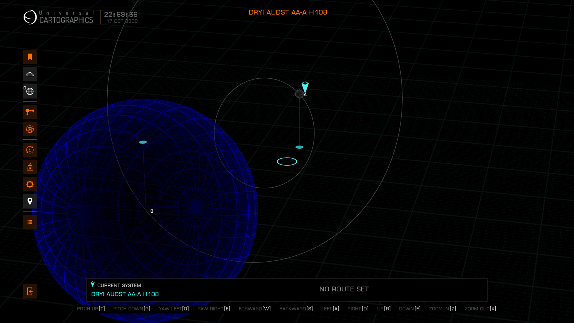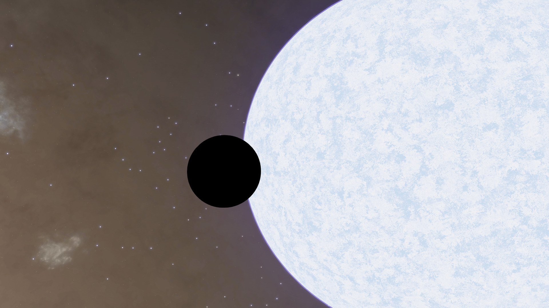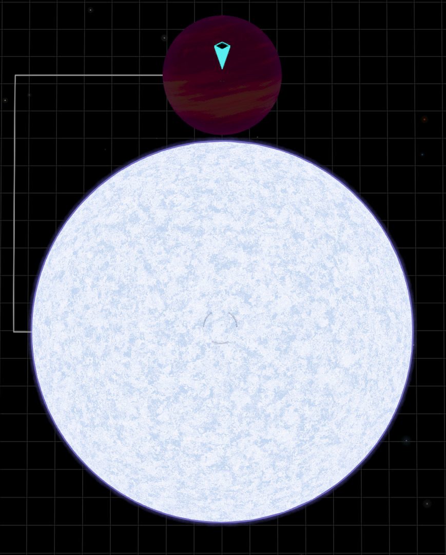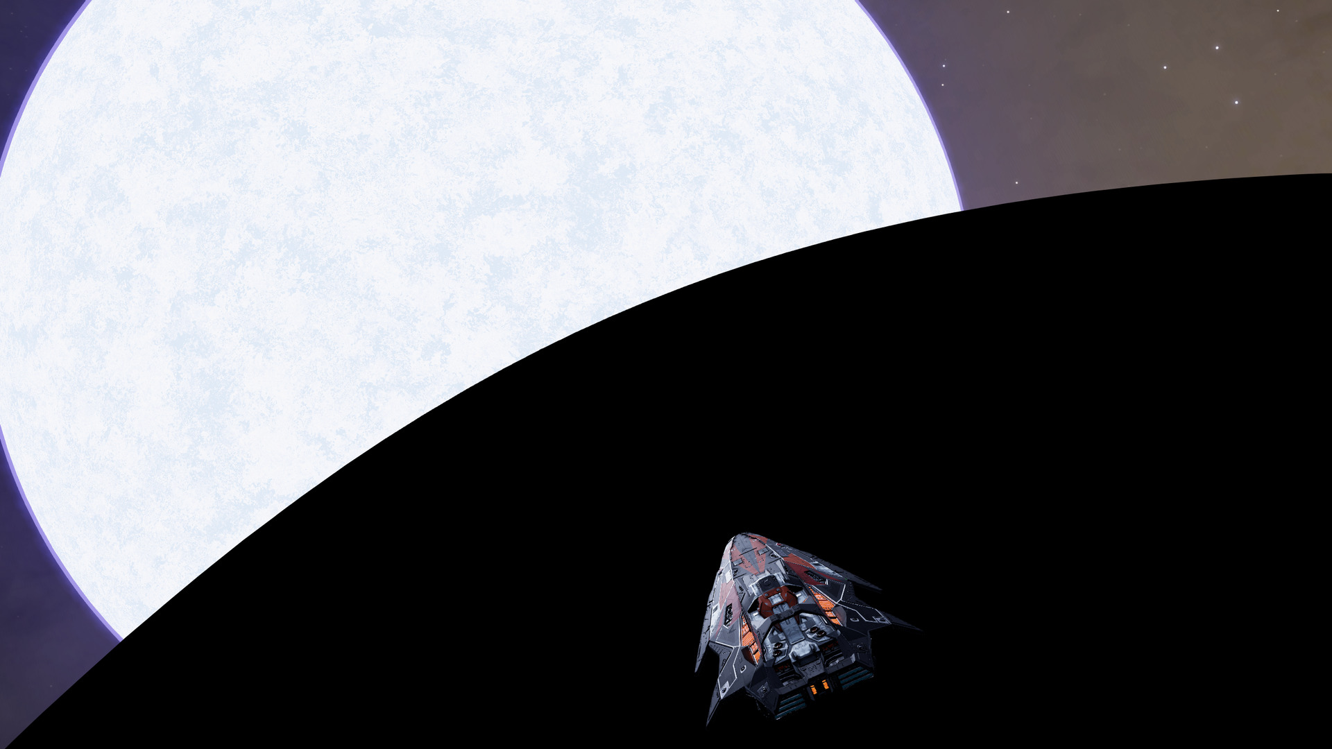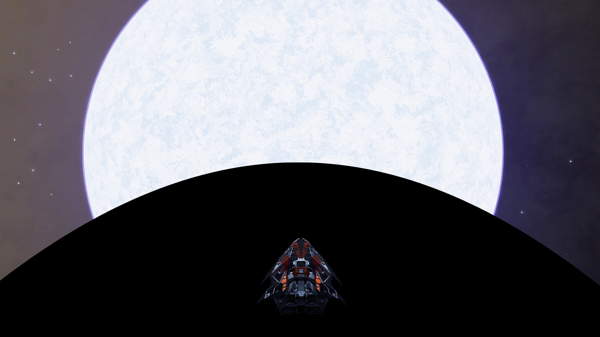 Description: Found on the border between Odin's Hold and the Empyrean Straits, Dryi Audst AA-A h108 is a binary system between a near absolute-zero Wolf-Rayet star, and a giant Class O star of nearly 204 solar radiuses. h108 A, the Wolf-Rayet, barely has a surface temperature of merely 2 Kelvin, which translates to negative 271.85 degrees Celsius, while h109 B has a common temperature of 34,964 Kelvin. Whilst comparable to the previously found “Dark Star” POI, the temperatures on h108 A's surface are currently the lowest on record in the entire galaxy. This puts into question if this might be a more widespread phenomenon, and if this type of Wolf-Rayet star could be put into its own category due to the extremely low surface temperatures. Behind h108 A rests h108 B, the previously mentioned giant Class O star. With a radius of 204 solar radii, it dominates the view no matter what angle, and is clearly visible from the nearby h108 A star. Despite h108 A's extremely cold surface temperature, it is still seemingly capable of fusion, with ionized oxygen lines invisibly spreading across its surface. Thanks to the nearly 112 Suns' worth of mass, it is very likely that h108 A will collapse into a hypernova alongside h108 B, which too has a large enough mass (of nearly 38 solar masses) to start this process. Even when fully illuminated by h108 B, the stark contrast between both stars is immense, to the point where one might even mistake h108 A for a black hole. The two stars form a binary pair, with an orbital period of 71.4 days. h108 B's immense size means that h108 A's path would take it through the other star, but since the pair orbits opposite of each other, they aren't going to collide. Explorers wishing to visit this system should heed the following warnings, to prevent an unfortunate loss of their own ship: