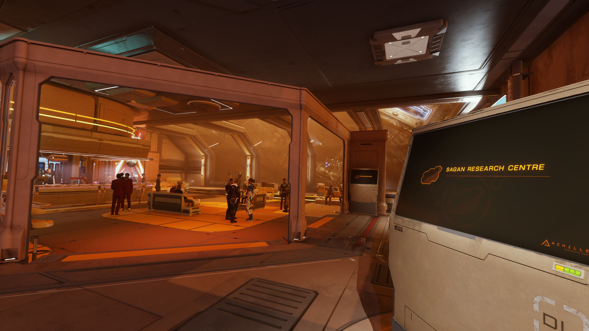 Description: Named after astronomer, author, and science communicator Carl Sagan, the Sagan Research Centre is an asteroid base located in a system with one star and two planets, one of them a gas giant with ammonia-based life. The station is not only located in the immediate vicinity of the Thor's Helmet nebula, it has also a clear view of the Seagull nebula, which is only some 280 ly away. The base is operated by Thor Biometrics and houses around 2,500 personnel. Due to the somewhat larger distance to Sol (some 3,600 ly), only limited station services are available, and the commodity market provides only a bare minimum of goods. These limitations result in tourists or travellers being not a common sight at the research centre. However, the Hell Port asteroid base in the nearby Seagull nebula does have more amenities, including a shipyard. | |
