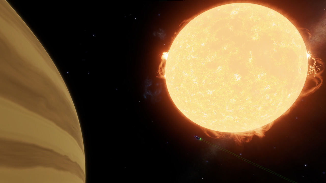 Description: There are three stars in this system and only one planet, a class V gas giant. Like many other such gas giants, it orbits its parent star close: its distance from the main star is only 5 ls (1,503,798 km from the center of the star). It is also quite hot, with a surface temperature of 2,217 K. | |