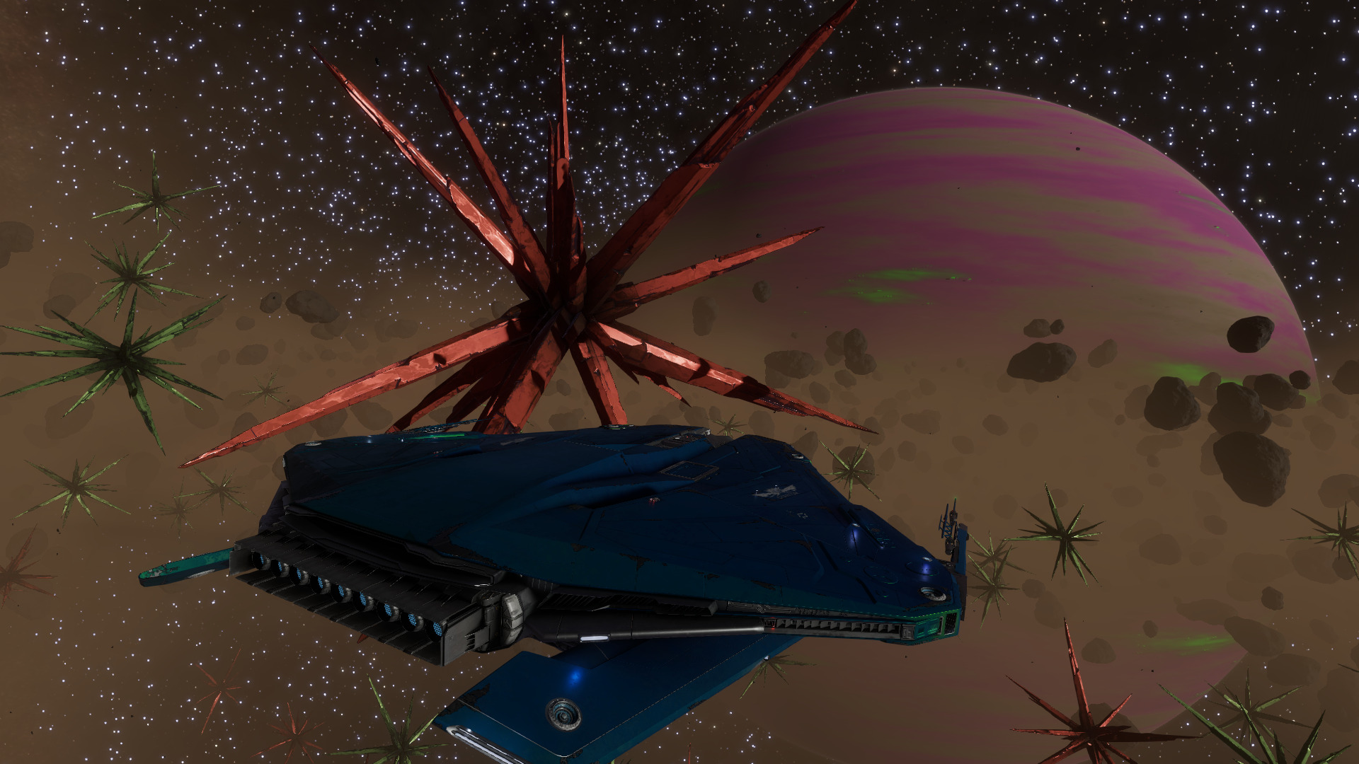 Description: Body A 4 in this system is a Class III Green Gas Giant within the Galactic Centre region. The planet is predominantly pink in color with a dark tan base cloud layer. Wrapping the gas giant about its equator, as well as in other regions as small patches, are brilliant bioluminescent green clouds. Since this system in the Galactic Centre region, K10-Type Anomalies can be found here in the three Notable Stellar Phenomena signals located within the planet's rings. The Green Gas Giant has four moons directly orbiting it, and body A 4 d has its own nested moon - making five moons total. Of the three that are landable, only A 4 a and A 4 d a are geologically active. A 4 a also orbits close to the planet's outer ring, and completes an orbit in under 20 hours. This discovery is also significant as this was the first time a second Green Gas Giant has been found within the same sector. The other Green Gas Giant, also Class III, is located just 895.55 ly away in the Byoomao JC-B d1-3681 system. Elsewhere in system are three atmospheric landable moons, A 6 a, A 6 b and A 6 c. All three have thin ammonia atmospheres and surface life signatures. | |