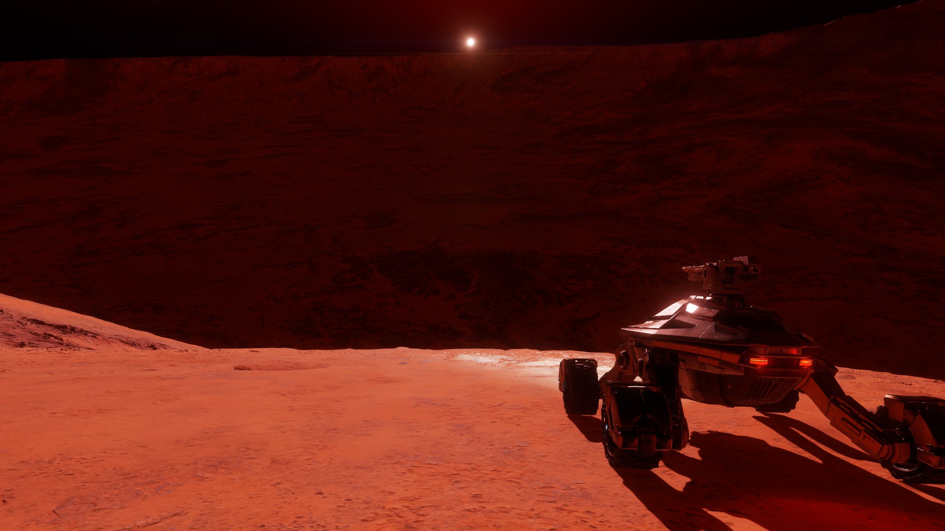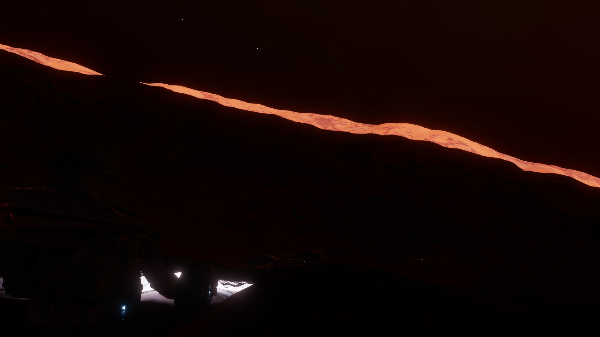 Description: This system houses impressive geological formations on the sixth planet ( Oochost MR-C d0 6), a High Metal Content world with a thin ammonia atmosphere. It's not yet known how exactly these were formed. To quote the journals of cmdrads, who was the first to document this Point of Interest: "I came across this crater while out in the black, searching for high value exobiology targets. When I came across it, it was just about evening at that position on the planet, so the lighting looked very interesting, and highlighted how tremendously deep this crater was. Upon landing my ship at the edge of the crescent, I began to realize how deep this formation really went, and it took me around fifteen minutes of precarious driving in my Scorpion to make it to the bottom, with only a few scratches." This crater is particularly beautiful in the late evening, just as the sun begins to set. From the bottom of the crater, one can slowly see the light fading until this crater becomes exactly what it is named: a Crescent Abyss. | |