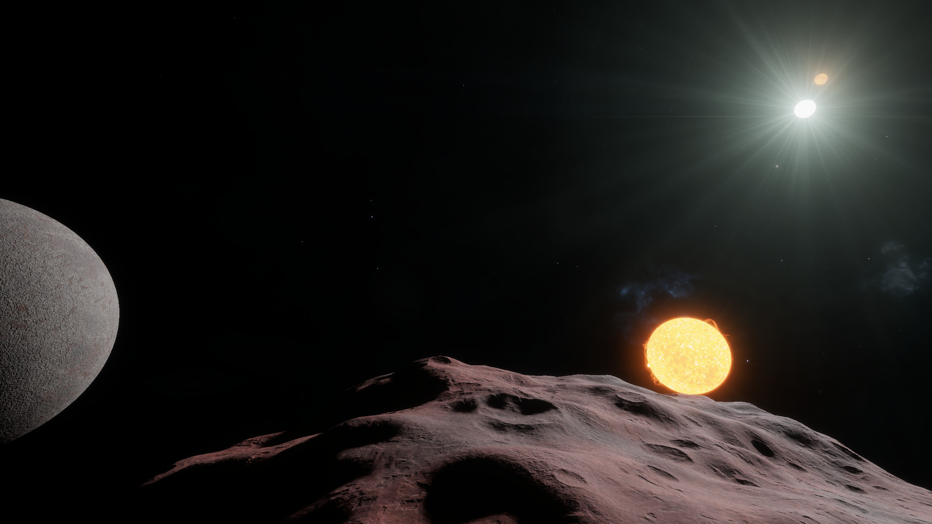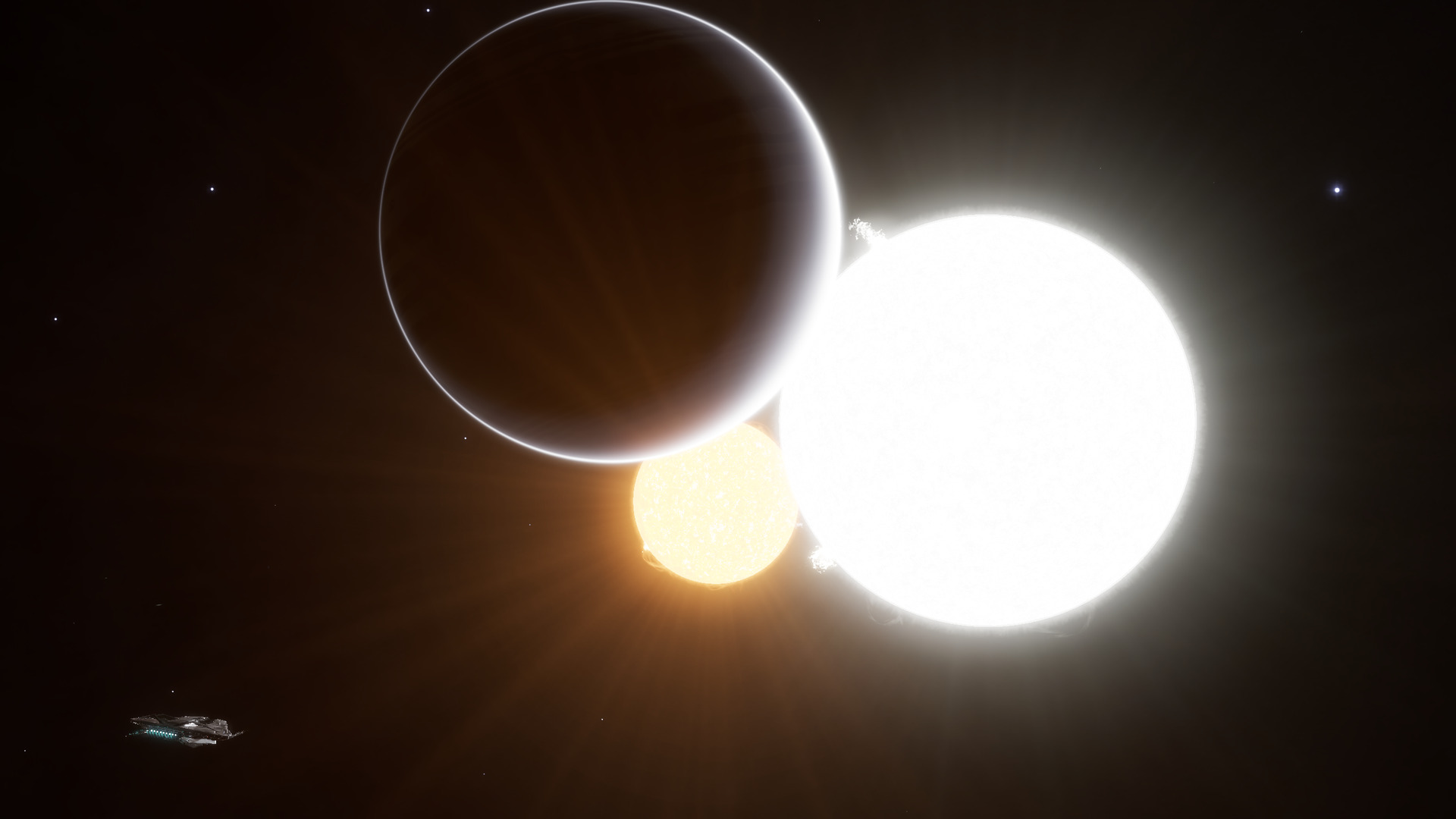 Description: This system has a number of remarkable features, including a Sudarsky Class V gas giant that orbits its binary parent stars at a distance of about 12 light-seconds. But the most interesting feature of this system is body C 1 a, a moon with a radius of just 154 km. By comparison, the smallest discovered moons in the galaxy, have radii that are only 15 km smaller. (The record holder as of 3309/02/17 is Pria Thoi ZP-G d10-37 AB 4 a, with a radius of 137.38 km.) The primary stars in this system are a class A and a class K star, with a Sudarsky Class V gas giant orbiting them just 12 light-seconds from their common barycenter. The third star has only one planet and one moon, which's irregular shape and iron-nickel composition make it look like a meatball. The body is four times smaller than its parent planet, and 70 times less massive, with a surface gravity only 0.04 g. There is active volcanism on the moon: tidal forces from the C star and the parent planet heat its interior, producing silicate fumaroles and gas vents across the moon's surface. | |