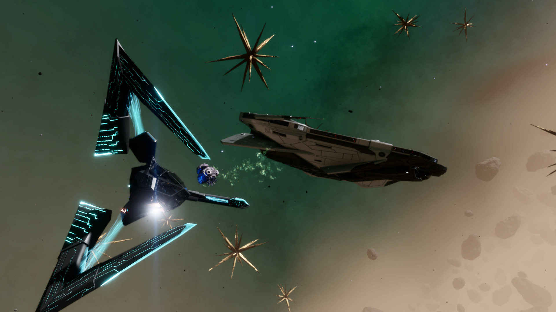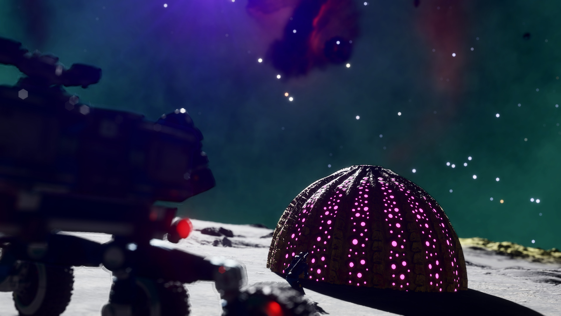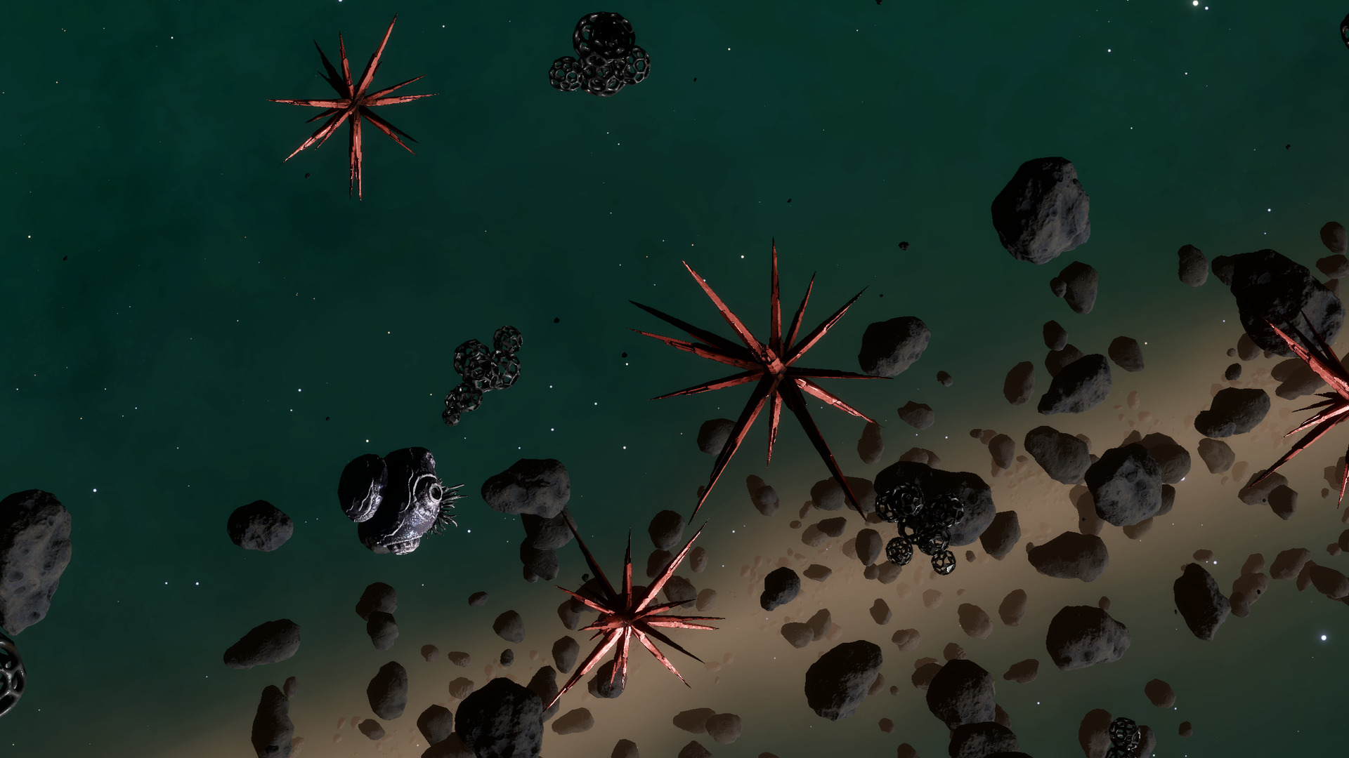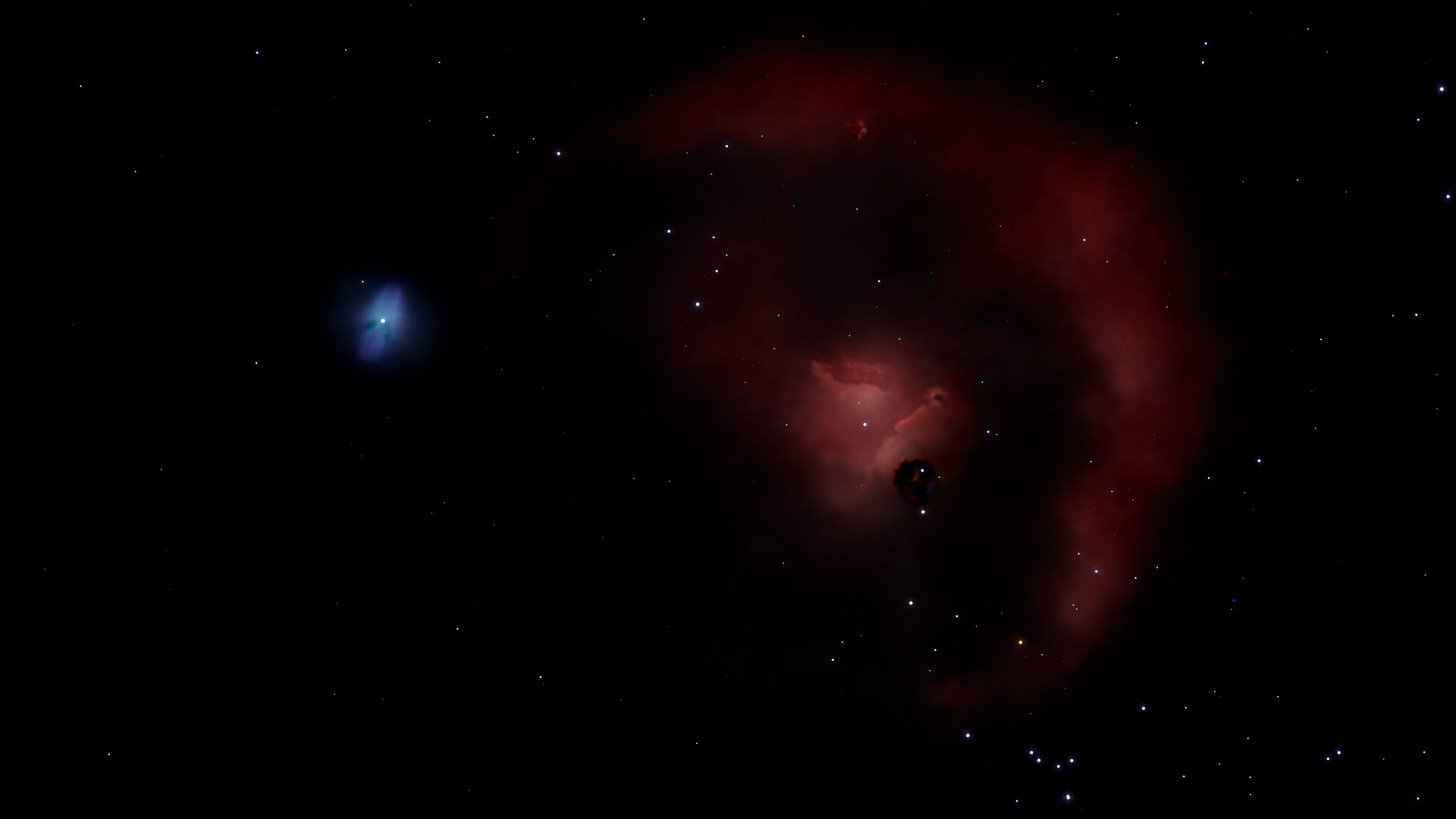 Description: The Spirograph Nebula (IC 418) at BD-12 1172 is a planetary nebula 1,100 light-years from Sol in the direction of Barnard's Loop and the Orion Nebula. Only a few million years ago, the central star BD-12 1172 (also known as HD 35914) was probably a common red giant star. After running out of hydrogen, the outer envelope has expanded rapidly, leaving behind a hot remnant core destined to become a white dwarf. The nebula has strong green colors, which combine with the blue-white of the O-class primary star to create stunning visuals on several rocky planets. Navigating to the Spirograph Nebula (seen above from Spirograph Sector PD-S b4-0, 6.31 light-years away) can be complicated due to the permit-locked Col 70 Sector. An easy way to route around Col 70 is to plot a course for Shenve in the Witch Head Nebula, and from there plot again to BD-12 1172. Both the second and the tenth planets hold Notable Stellar Phenomena (NSPs) in their rings. The former's metal-rich rings contain a high level of dust particles, allowing the crystalline structures inside to create crepuscular rays when silhouetted against the primary star. Viride Gourd Molluscs form the NSPs, though their small size requires pilots to track down their flickering radar tracks. The molluscs react to ship headlights, sometimes engaging in behavior that resembles a game of tag. Explorers can also find Lattice Mineral Spheres at the NSPs in the tenth planet's rings, along with Rubeum Metallic Crystals. Prasinum Bioluminescent Anemones can be found on the surfaces of several bodies in the system, including planet 2 and the 10 a moon. Pilots attempting to land on the second planet should be advised to fly cautiously, as the planet's gravity is 1.75 g. However, those who do make the landing safely will be treated to spectacular views of the ring against the blue-green sky inside the Spirograph nebula. | |