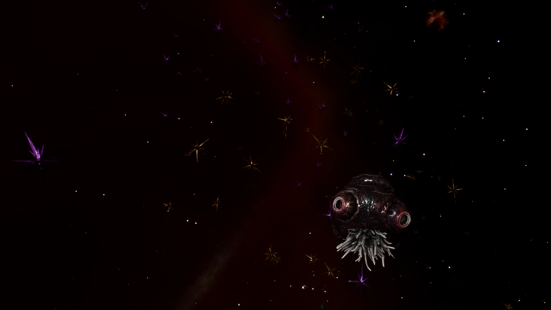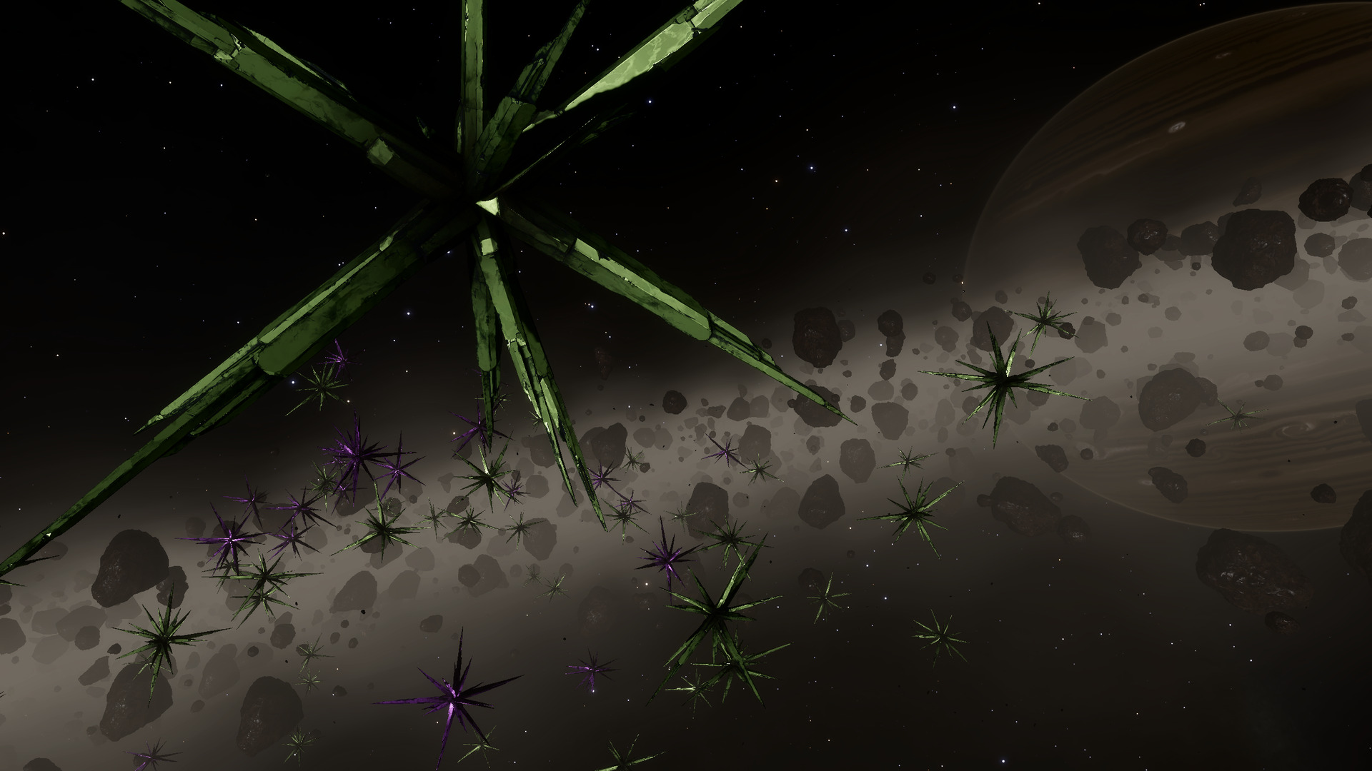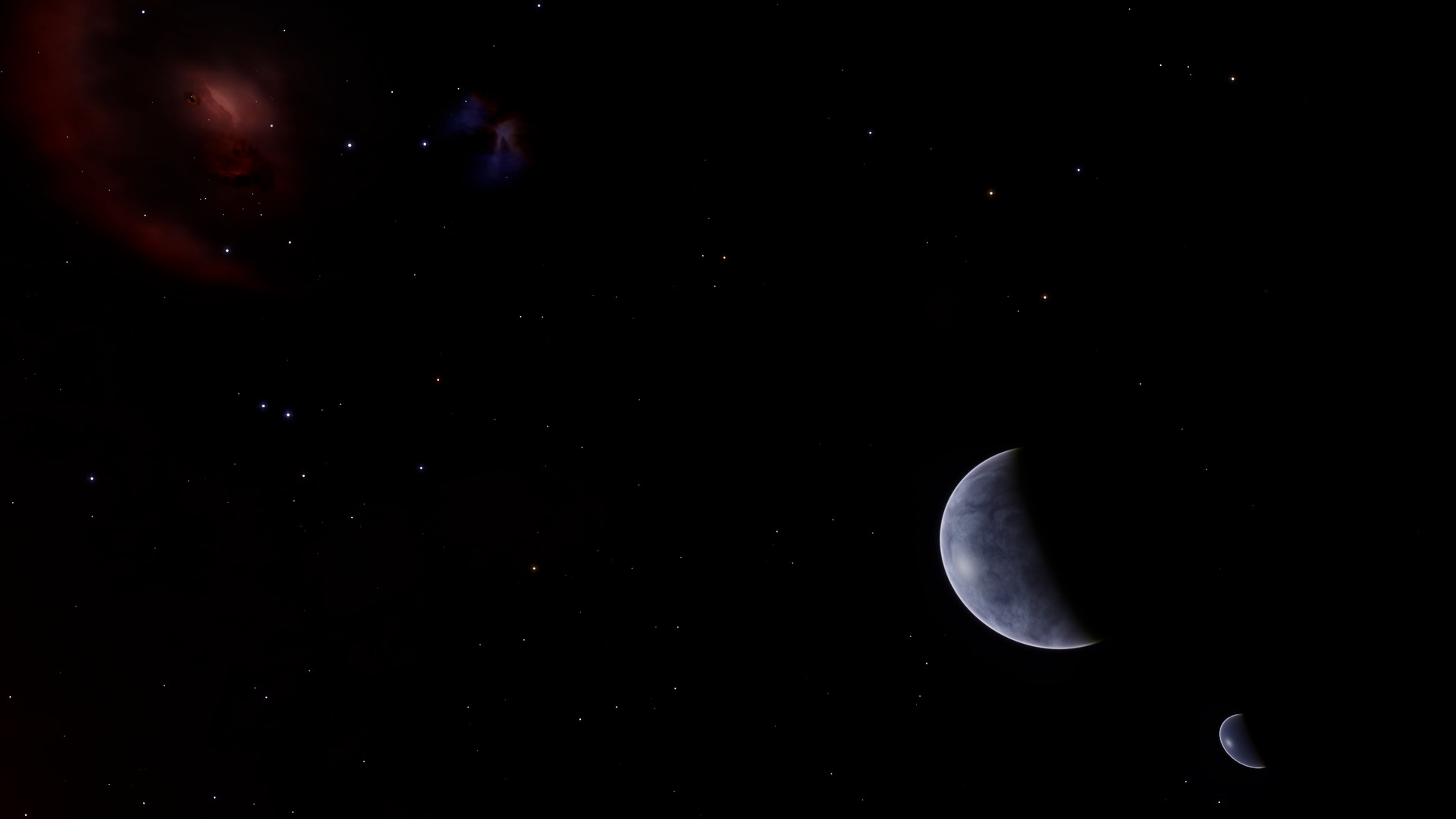Description: Synuefe PB-G c13-5 is located about 250 light-years from the Witch Head Nebula, on the path between the Witch Head and the Core Systems. Visitors to the system will note three water worlds, including a close-orbiting water world pair (planets A 5 and A 6) and a third water world with a close-orbiting moon (planet A 8). The Witch Head Nebula and Barnard's Loop are both prominent in the sky. The common Albulum Gourd Molluscs inhabit each of the three Notable Stellar Phenomena in the system. One NSP sits within the B ring of planet A 9, containing Prasinum and Purpureum Metallic Crystals alongside the Gourd Molluscs. Two other NSPs have Purpureum and Flavum Metallic Crystals accompanying the molluscs. Four moons in the system have surface life. A 8 a is home to red Bacteria Vesicula. A 9 c has lime Bacteria Vesicula, and emerald Fonticulua Campestris. The A 11 g moon has red Bacteria Bullaris and emerald Fonticulua Campestris, which tend to be found along the bottom of foothills. The A 14 e moon has the highest concentration of lifeforms in this system, and arguably the best views, with red Bacteria Vesicula, emerald Fonticulua Campestris, and relatively uncommon lime Fumerola Nitris. | |