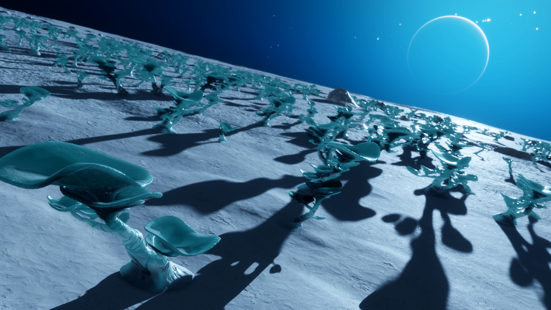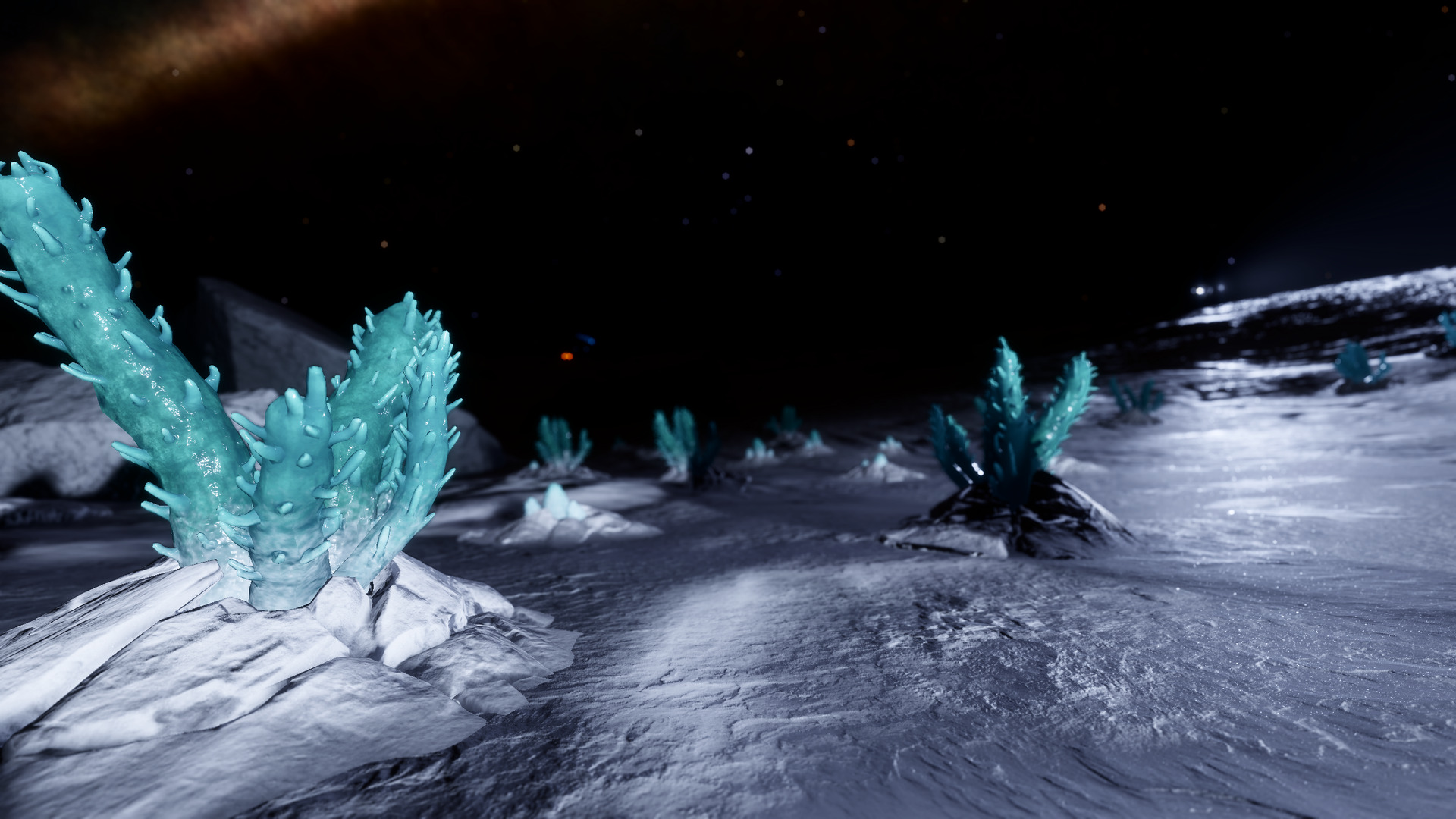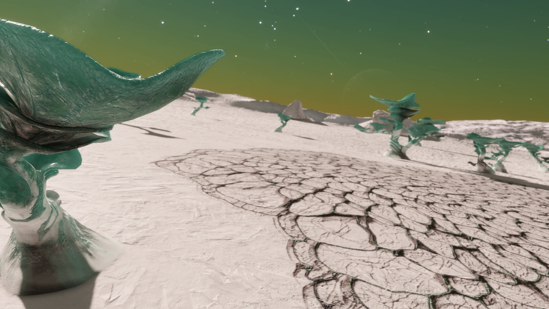 Description: Synuefe PB-G c13-5 is located about 250 light-years from the Witch Head Nebula, on the path between the Witch Head and the Core Systems. Visitors to the system will note three water worlds, including a close-orbiting water world pair (planets A 5 and A 6) and a third water world with a close-orbiting moon (planet A 8). The Witch Head Nebula and Barnard's Loop are both prominent in the sky. The common Albulum Gourd Molluscs inhabit each of the three Notable Stellar Phenomena in the system. One NSP sits within the B ring of planet A 9, containing Prasinum and Purpureum Metallic Crystals alongside the Gourd Molluscs. Two other NSPs have Purpureum and Flavum Metallic Crystals accompanying the molluscs. Four moons in the system have surface life. A 8 a is home to red Bacteria Vesicula. A 9 c has lime Bacteria Vesicula, and emerald Fonticulua Campestris. The A 11 g moon has red Bacteria Bullaris and emerald Fonticulua Campestris, which tend to be found along the bottom of foothills. The A 14 e moon has the highest concentration of lifeforms in this system, and arguably the best views, with red Bacteria Vesicula, emerald Fonticulua Campestris, and relatively uncommon lime Fumerola Nitris. | |