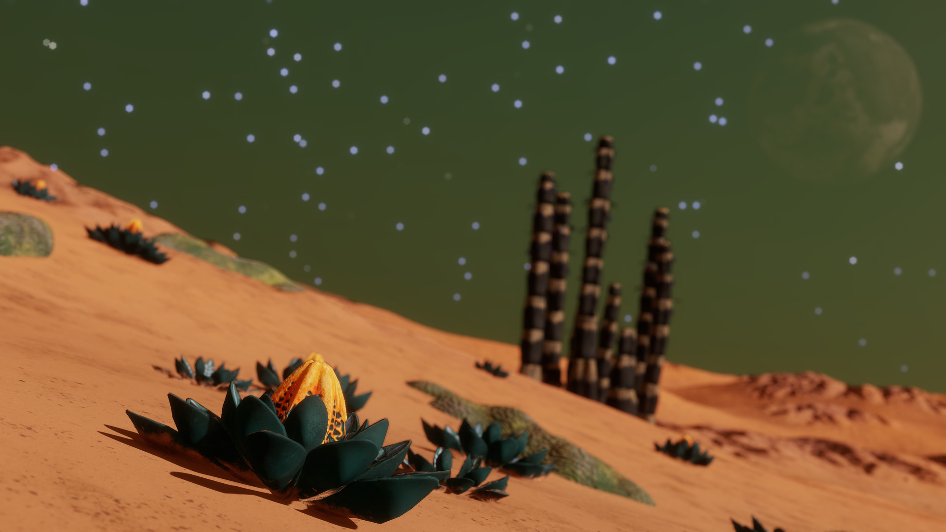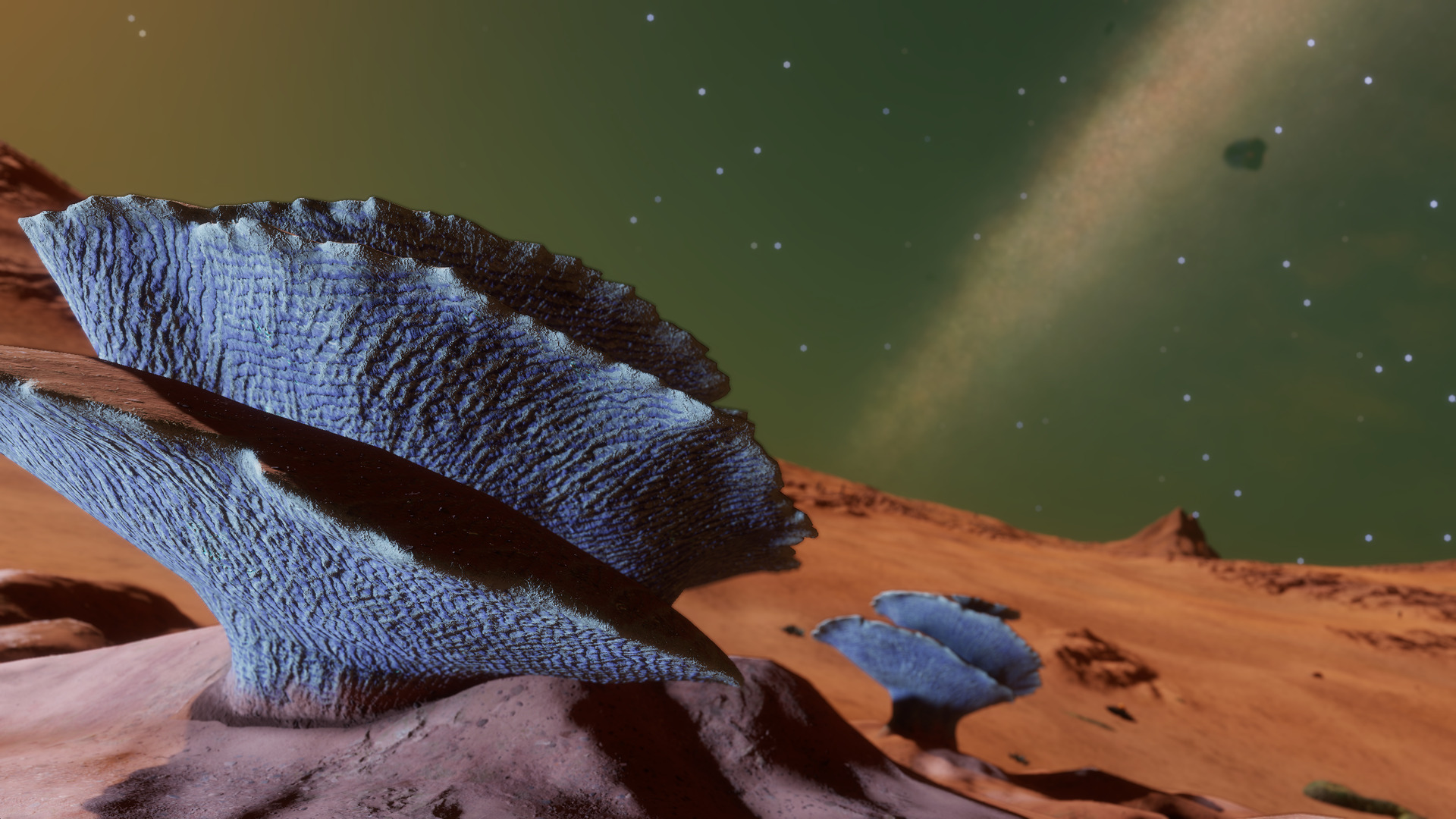 Description: This system, located near the Crookaae AA-A h129 Nebula, nicknamed the Dragon's Tail Nebula, is home to more than a dozen species of exobiological flora. Body 4 a is the closest moon to the central star with exobiology, in the form of Bark Mounds. These large fungal cones grow up to 4 meters in height and can often be found with mineral deposits growing near their tops. Body 8 f is a rocky moon with a thin ammonia atmosphere that's home to 10 families of alien plants, ranging in size from Bacterium Alcyoneum colonies to Tubus Rosarium. Close examination of the Tubus shows indigo-colored fruit toward the top of its stalks. Osseus Spiralis are somewhat more rare, growing along the rocky outcrops above the otherwise sandy terrain of the moon. The sands are home to most of the other vegetation that grows here, including Stratum Paleas, Fungoida Setisis, Cactoida Peperatis, Tussock Catena, and Frutexa Flammasis. The Concha Aureolas prefer more solid ground, growing where their roots can establish themselves in the soil. Finally, Body 10 e contains four distinct species of plants, including Tussock Propagito, Tubus Cavas, Stratum Limaxus and Bacterium Aurasus. | |