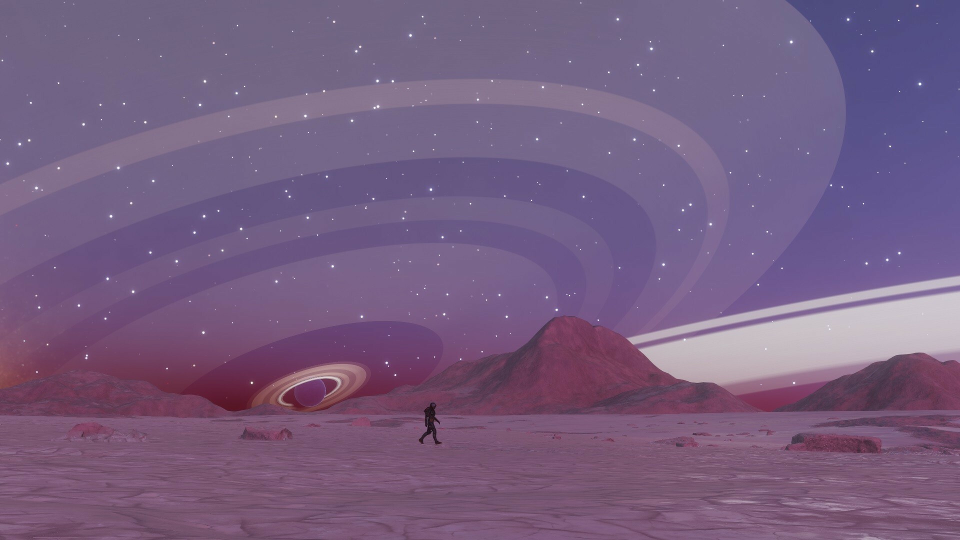 Description: Body A 6 b is a ringed icy moon orbiting a Class III Gas Giant that has a wide outer ring. They cover much of the moon's sky, due to the inclined orbit. The thin oxygen atmosphere gives the rings a purplish, somewhat magical hue reminscent of Tyrian Purple, a famed natural dye that has been made on Earth for more than 4,000 years. Walking on purple ice with the gas giant's rings prominently in the background: Another view from the surface: View from orbit: | |