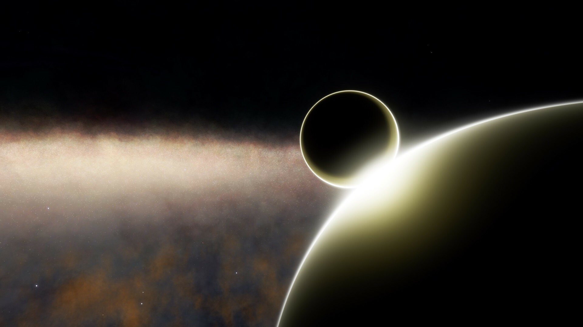 Description: The first two planets of this system are Class III Gas Giants forming a close binary pair. They complete an orbit around their common barycentre in one day. As this system is located 1,400 ly above the galactic plane, the galaxy provides a stunning backdrop to the pair's graceful dance around each other. Reflecting their tumultuous atmospheres, their names are derived from two giants in Nordic mythology: Kari (Tempest) and Beli (Storm). View of both giants: The gas giants eclipsing the main star: | |