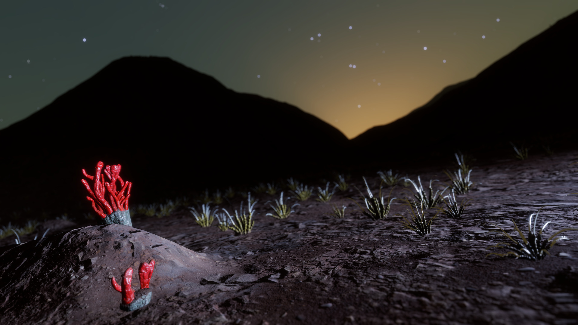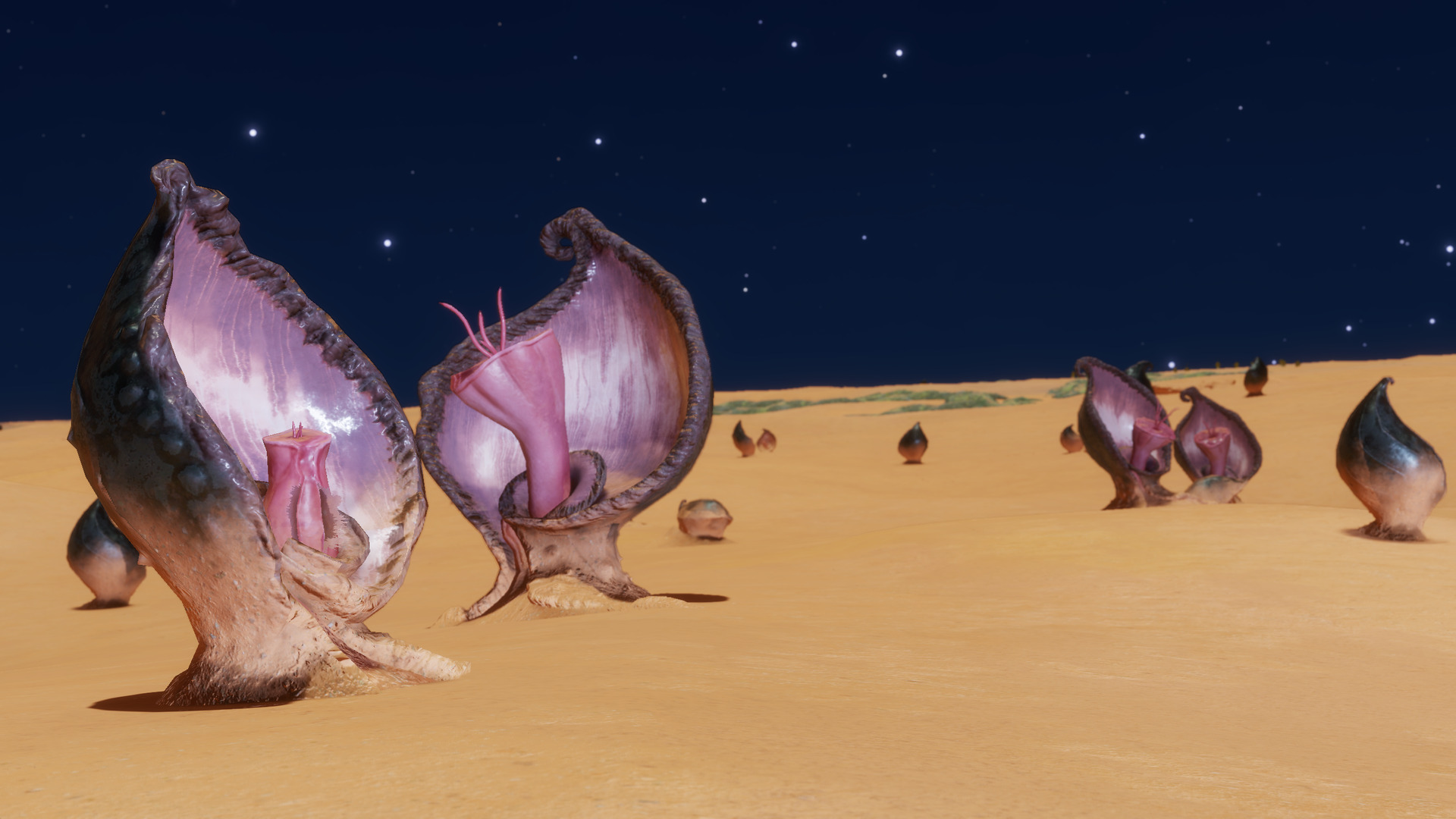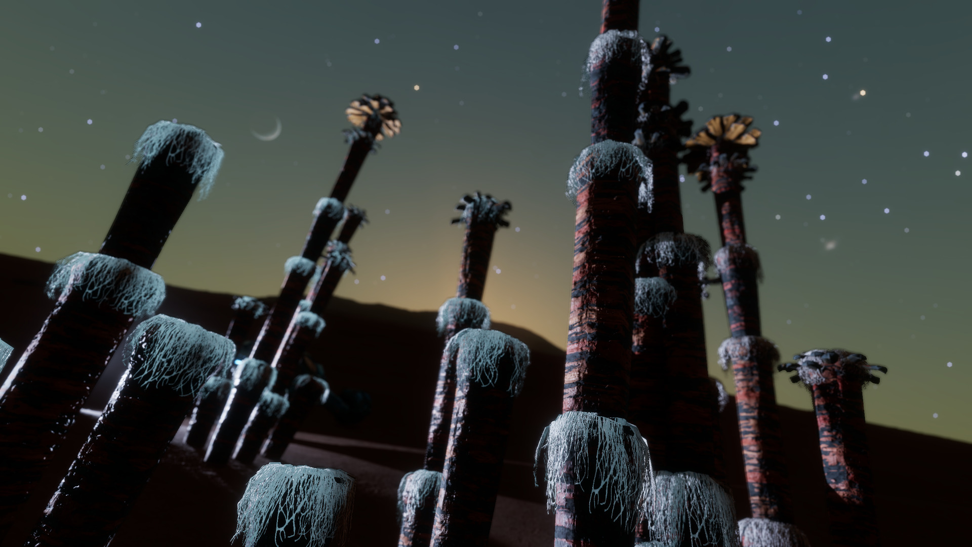 Description: This system is home to more than thirty species of exoflora, including three bodies with eight or more species of plant life. Bodies 1 a and 1 b both have thin water atmospheres, giving the worlds blue skies. The two moons have similar plant species, possibly owing to panspermia due to their proximity: they are less than 2 light-seconds apart. Both bodies are host to three high-value species of plant life, including Cactoida Vermis, Osseus Discus, Tussock Virgam, and different species of Clypeus. Body 4 e orbits a Sudarsky Class II gas giant and has an atmosphere primarily composed of carbon dioxide. About half the planet's exoflora, including Tussock Caputus and Fungoida Gelata, are confined to small patches on the moon's surface, only a few kilometers across. Data for locations of these plants is stored in Canonn's SRV Survey database. However, the Aleoida and Tubus plants grow more widely on the world and are easier to locate. Bodies 4 d and 4 f have four and three species of exoflora, respectively. | |