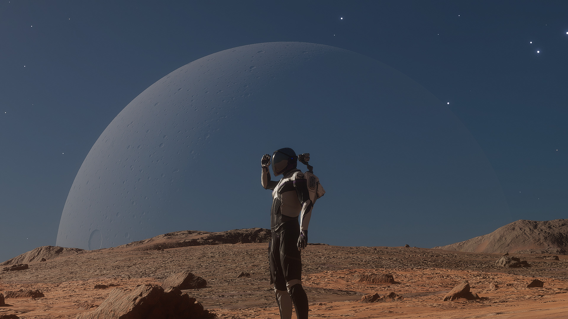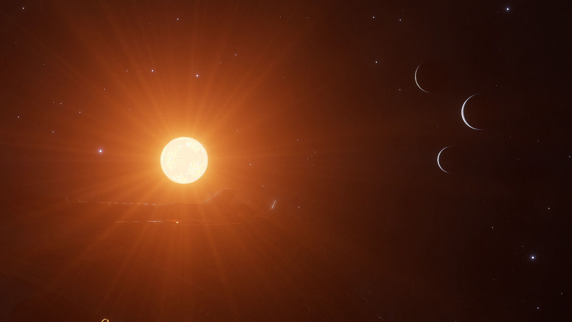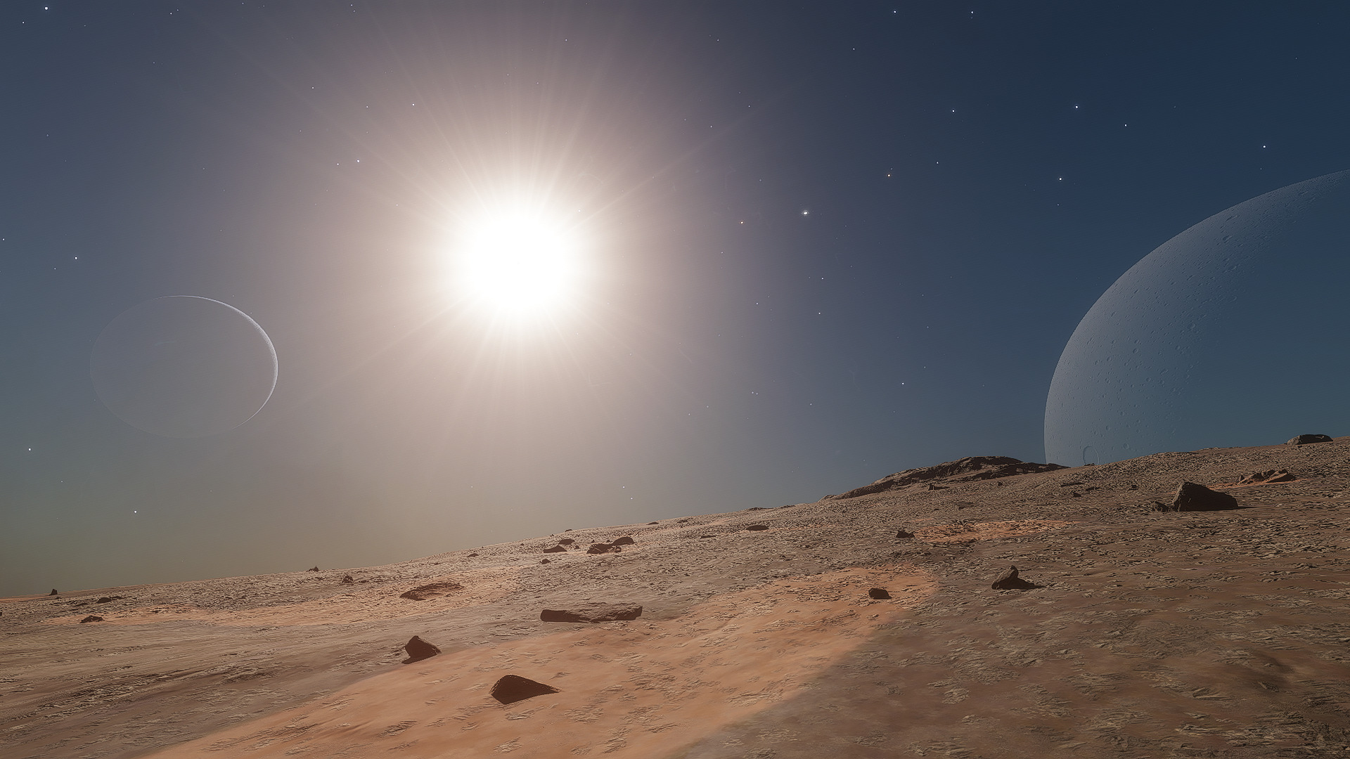 Description: TriVista Celestia in the Temple region has three planets not far from the arrival point (4,400 light seconds) providing nice surface sights. Two of the thin atmospheric planets are geoactive and have surface life, in the form of bacteria. The orbital periods of C 3 and C 4 are only 0.3 days, which means the planets do a full orbit around their barycenter in just 7 hours. View of C 4 from C 3 | |
