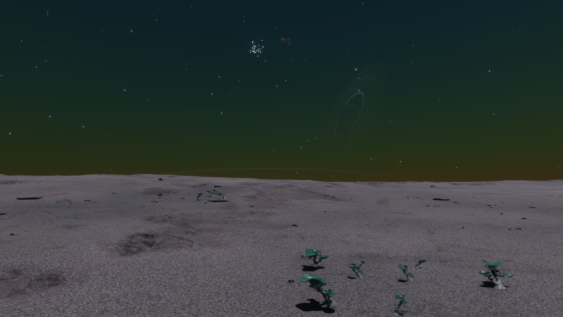 Description: This system houses two small rocky ice moons around a Class III Gas Giant, sharing a close orbit. The first one, body ABCD 1 a (nicknamed "big brother") has a radius of 649 km and a surface gravity of 0.6 g, while the second one, body ABCD 1 b ("baby brother"), has a radius of 584 km and a surface gravity of 0.7 g. They orbit a common barycenter and are so close to each other that you're still "departing" from one when you're already "arriving" at the other. The two "taters" (as named by the discoverer) are landable, and both offer good sights and opportunities for photos, especially when their parent gas giant is visible. The moons have surface geological activity - Major Silicate Vapour Geysers - but there's no atmosphere, nor surface life. Body ABCD 1 d is quite a rare sight too: it's a highly inclined, ringed, thin argon atmospheric icy world that hosts life. This rare combination grants beautiful views featuring the parent gas giant, its three other satellites and the nearby Heart Nebula star cluster - and the neighbouring Soul Nebula. | |