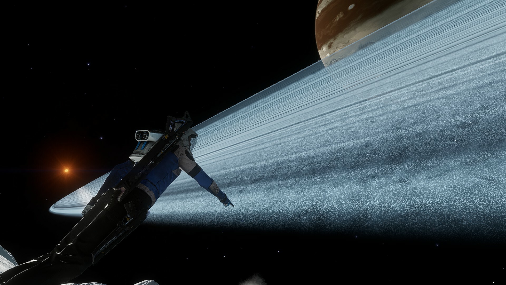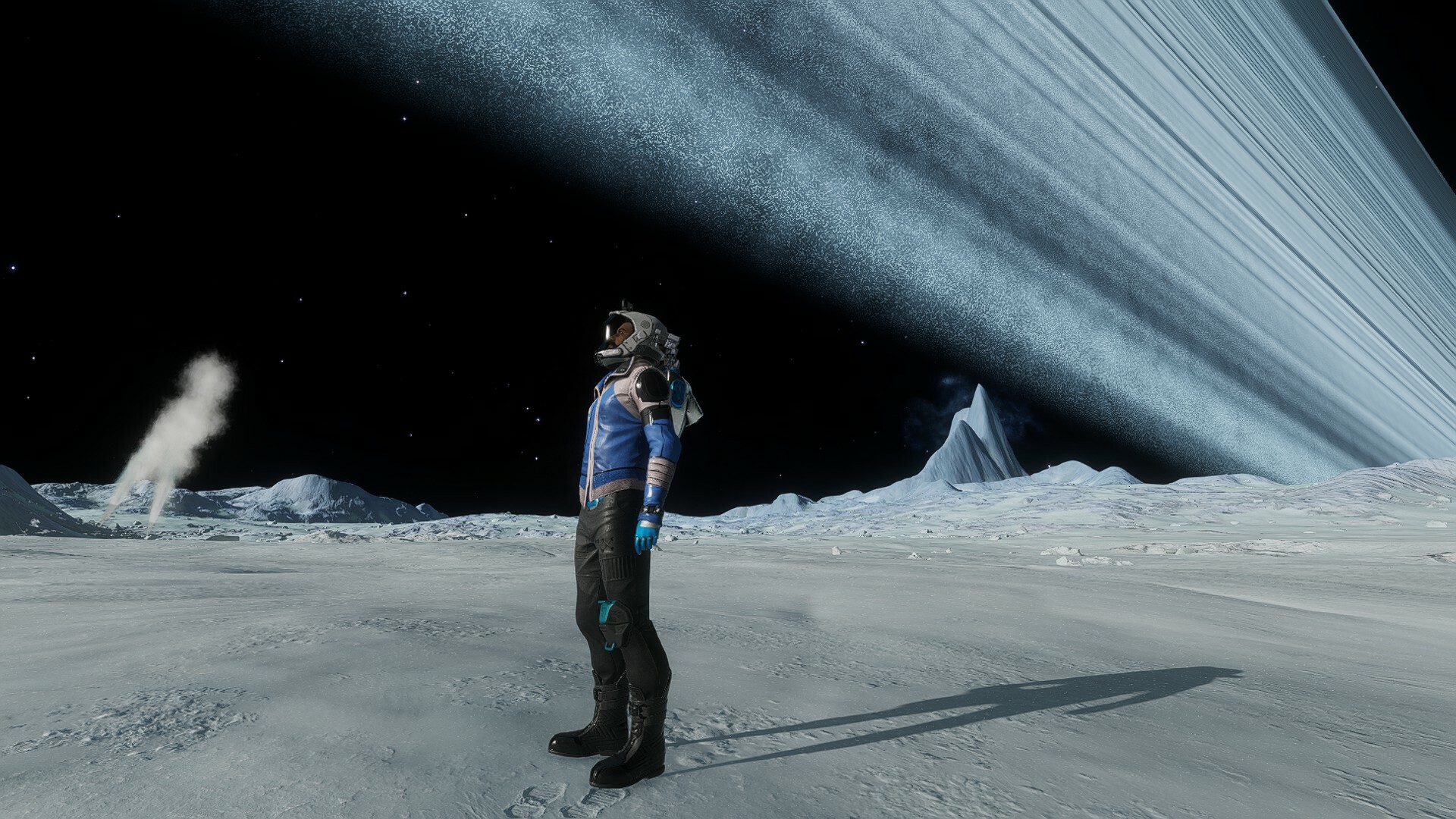 Description: Schee Eaec DY-C b5-0 1 a offers some remarkable features due to its close proximity to its parent gas giant's icy rings, which extend into the moon's orbital cruise zone. From the moon's surface, one can observe the rings slowly rotating, though in truth they are moving impossibly fast. The individual icy mineral formations that make up the rings can be seen even by the naked eye. The rings appear to be so close that one could be forgiven for imagining that they could reach out and touch the very edge. View a video of the rotation as seen from the surface. Due to the gravitational forces at play, dropping out of supercruise near the rings while still in the orbital cruise range of the moon often results in the pilot remaining in the moon's gravity well. At this distance, this causes the rings to pass by remarkably fast, as can be seen in this video footage. However, if the pilot manages to enter the rings' gravitational pull, they will be treated to the sight of the moon rotating and orbiting past at an atypically quick rate. The rings of the parent gas giant contain several mining hotspots which include a variety of Void Opals, Grandidierite, Alexandrite, and even Tritium. | |