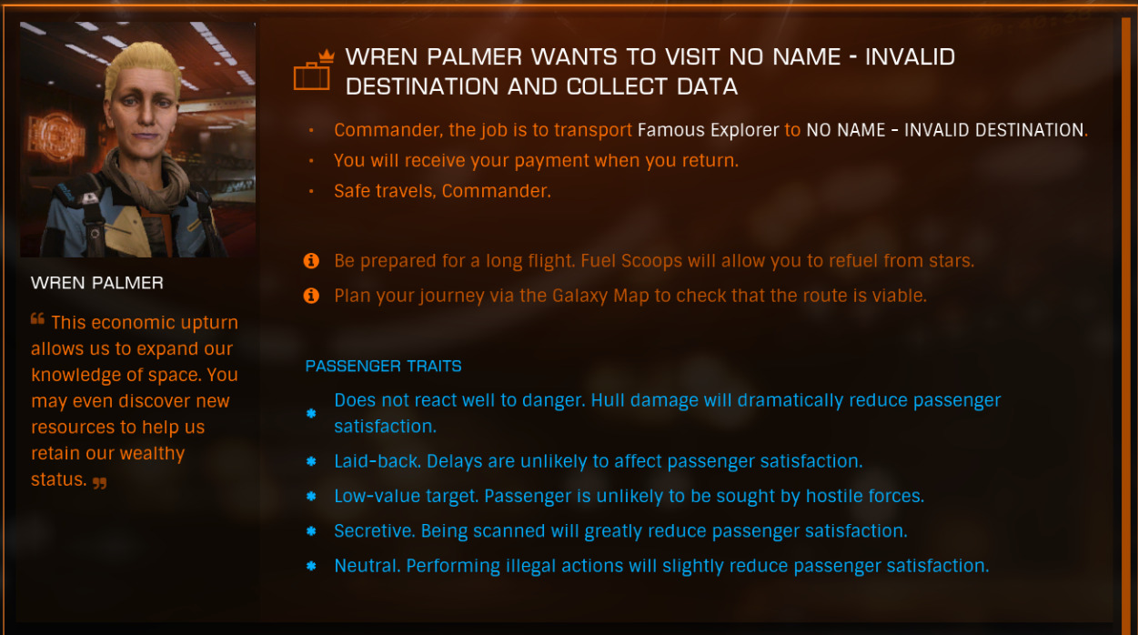 It is unknown whether this message is cut short, or if it's the entire intended message. The other tourist beacons which were deployed in the same sequence have messages crediting the Commanders who suggested their destinations, but this one doesn't include any such text. Despite the "invalid destination" part of the name, this beacon does appear to be a valid destination for tourism, as it can be seen on passenger boards, and the missions can be completed normally. Unfortunately, this beacon glitch is all that is interesting about this system. There are three tiny landable planets, the kind which many tend to refer to as "potatoes", but none of them have anything remarkable on their surfaces. The reference to clear views of the Elephant's Trunk is somewhat ironic though, as the beacon is in a low enough orbit that the planet often obscures the view. Commanders will have to supercruise away to see the nebula. There is a bit more to tourism here: the nearby asteroid base in GM Cephei is a popular place to take on passengers, including ones who wish to travel back to the bubble. | |