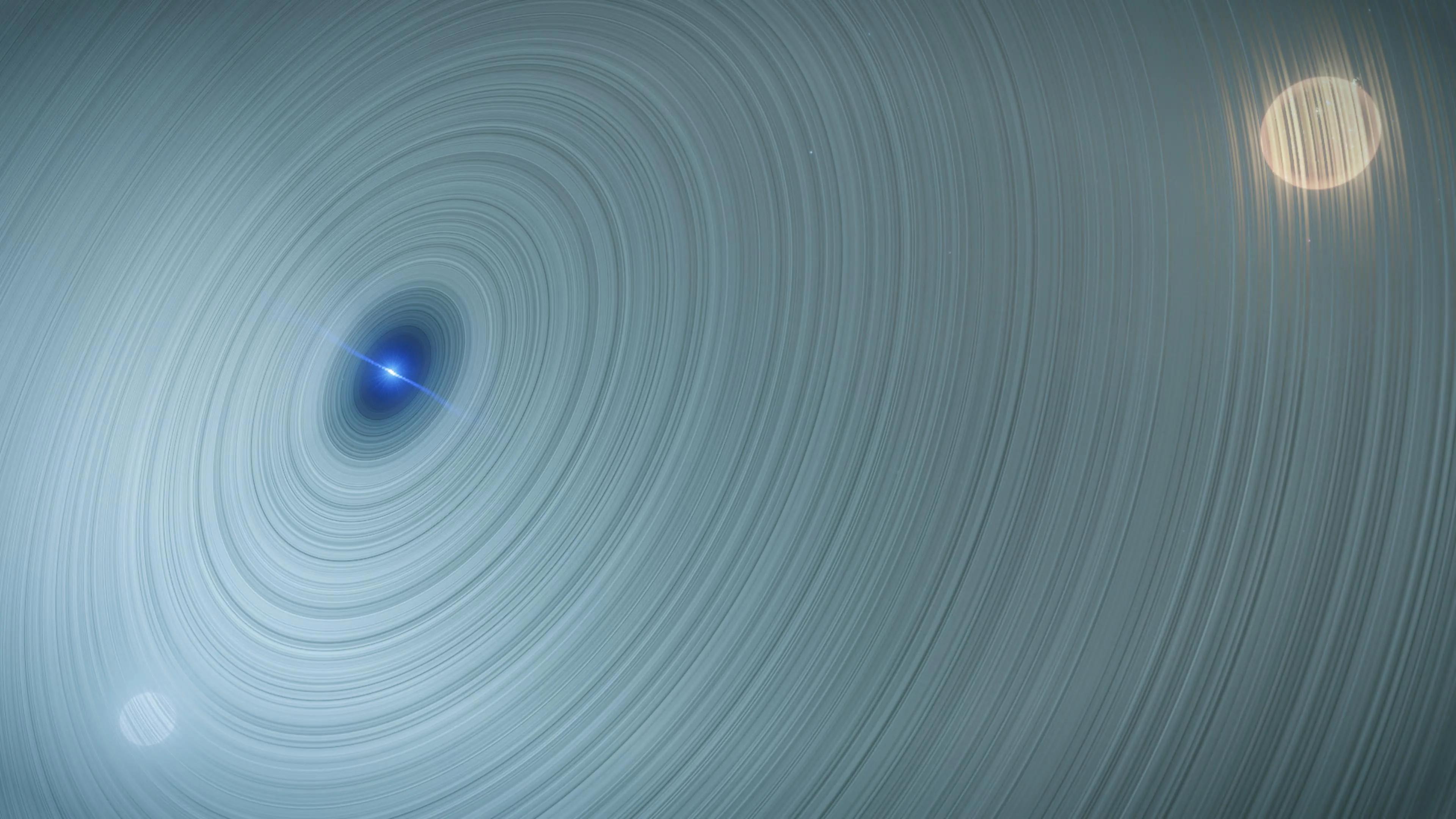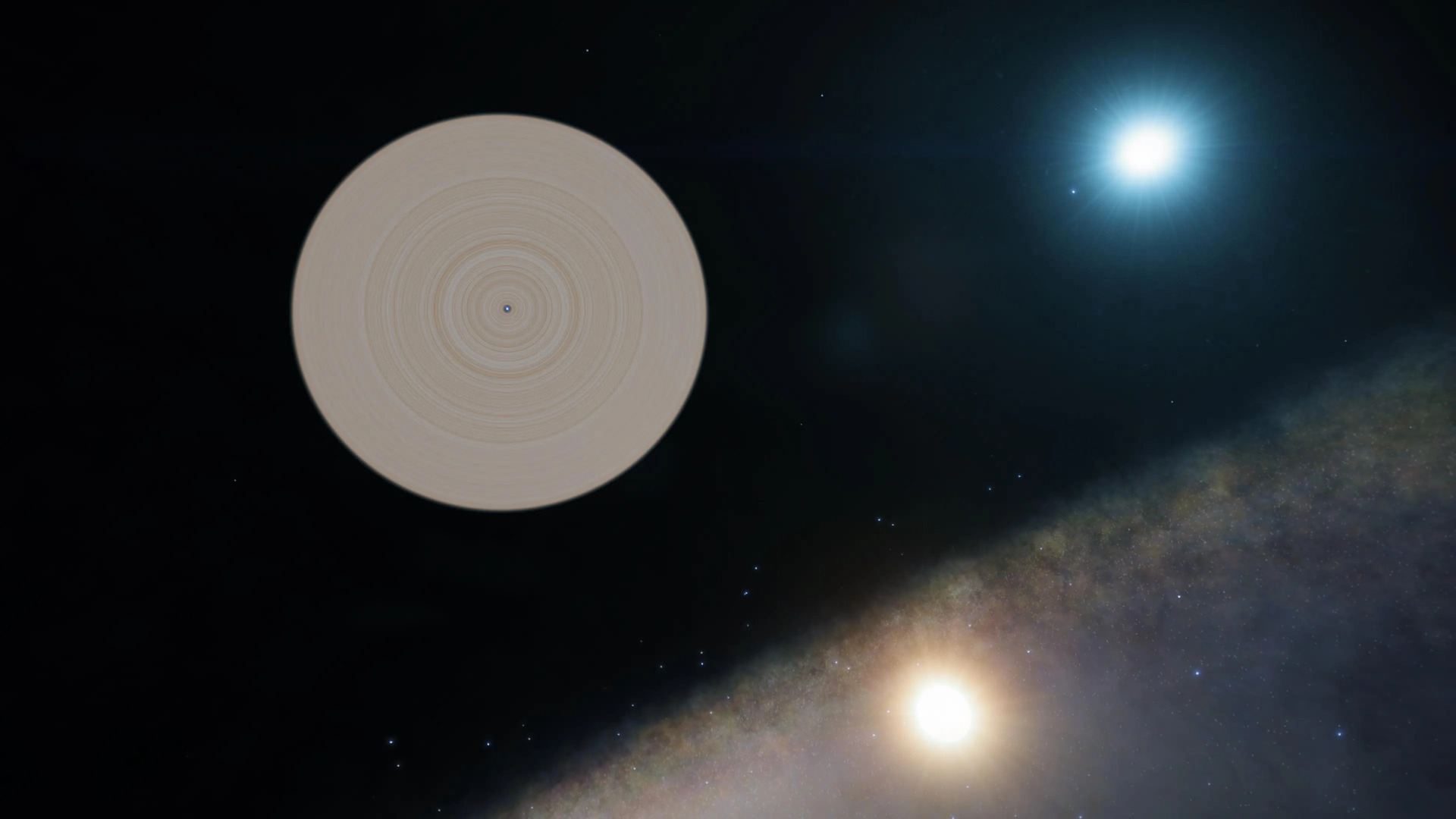 Description: This system houses several stars in rare combinations. The main stars are a pair of black holes, and a variety of bodies orbit them. One of these is a ringed neutron star, which is in a binary orbit with a class A star. There is also a class K yellow-orange giant star orbiting the binary black hole pair as their satellite. As of 3310/07/02, this phenomenon has only been seen in two systems, this one and Rothie AA-A h482. A far view of the system, with the three rare star types: A closer view of the ringed Neutron Star. Note the sizes of the class K giant star and the class A star: | |
