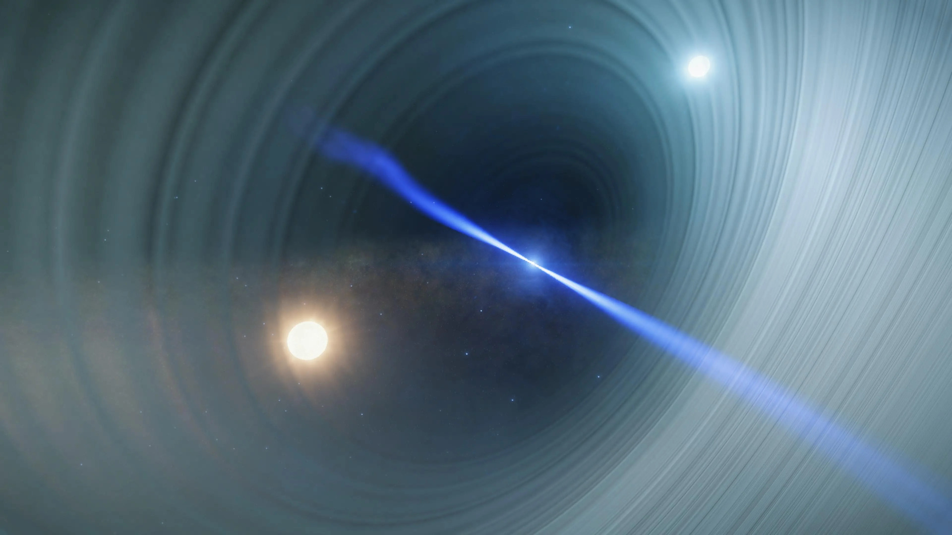 Summary: A rare configuration of three stars orbiting a black hole binary pair: a binary pair of a ringed neutron star and a class A star, and also a K class orange giant star. | |