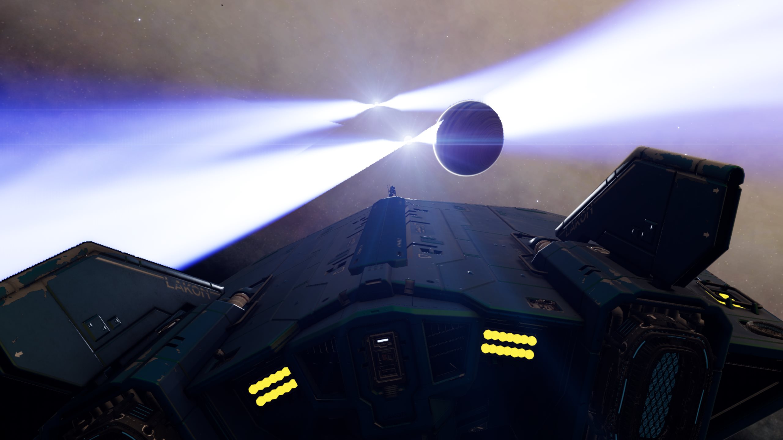 Description: This system houses a spectacular sight: a Class V gas giant (B 1) orbits a white dwarf at a close distance of only 0.45 light-seconds, completing a full orbit in just under 19 minutes. Upon entering the system, travelers arrive near the primary black hole. At first glance, the system may seem unremarkable, but a thorough scan will reveal the two white dwarf stars farther into the system. The B 1 gas giant is around 9,200 ls away from the arrival point. The contrast between the brilliant white dwarfs and the dark expanse of the black hole, along with the swift-moving gas giant, offers spectacular views. Mapping the gas giant can be an interesting challenge too, due to its proximity to its parent star. The system also has an assortment of bodies, many of them with thick atmospheres. The fourth star is a class K yellow-orange star, so fuel scooping is possible here. | |