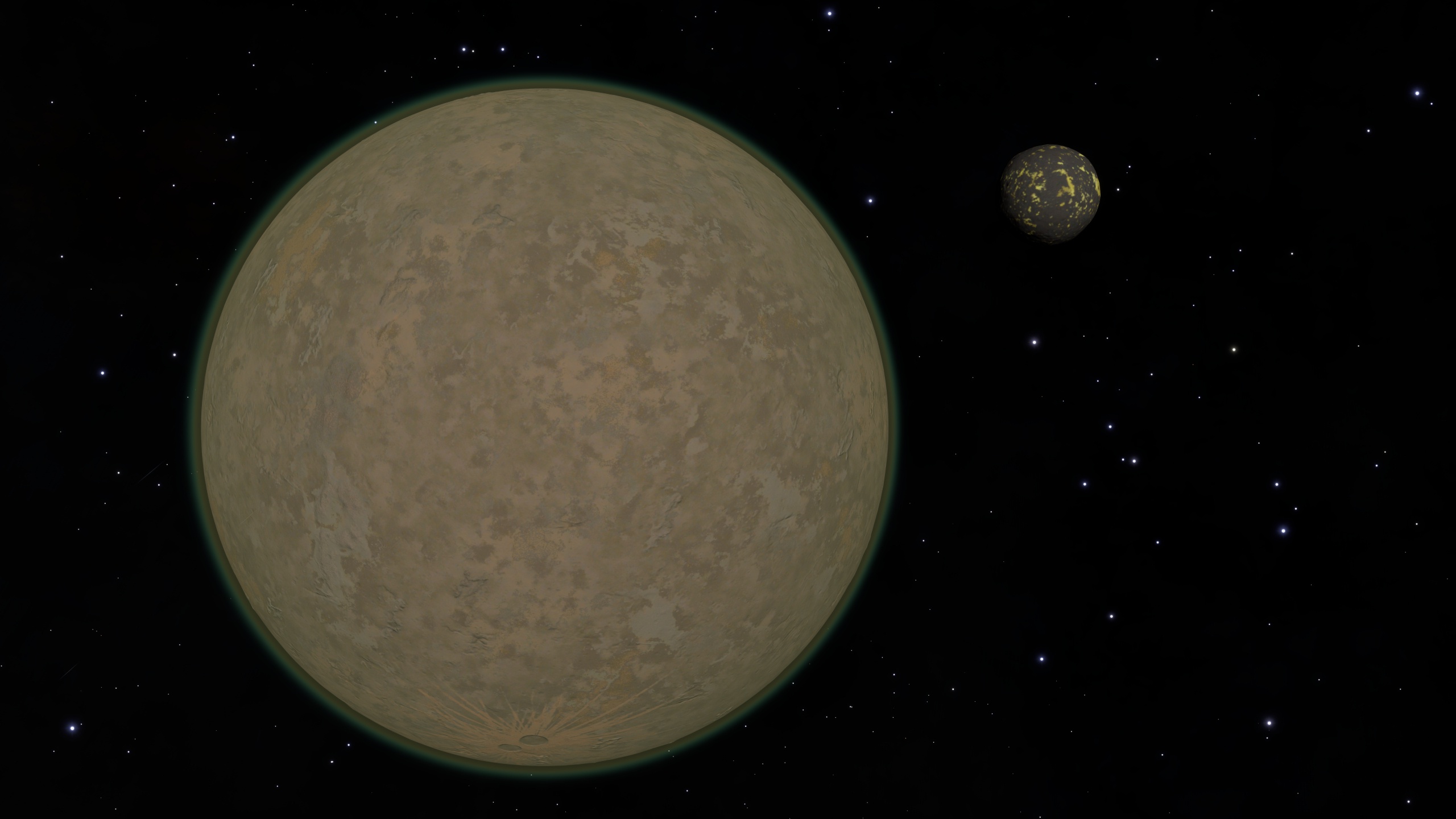 Description: The ninth planet in this system is a ringed Green Gas Giant, which was discovered during the Elite Deep-Space Explorers Network scouting activity of the region. However, upon closer inspection, some tiny green clouds can be seen, surrounded by pink streaks. The system also hosts a variety of bodies, including a water giant with landable icy moons. There is one moon with a thin ammonia atmosphere, which holds 5 biological signals: Bacterium Alcyoneum - Lime Across the wide variety of landable bodies, all surface materials can be found, including everything needed to synthesize jump boosts. | |