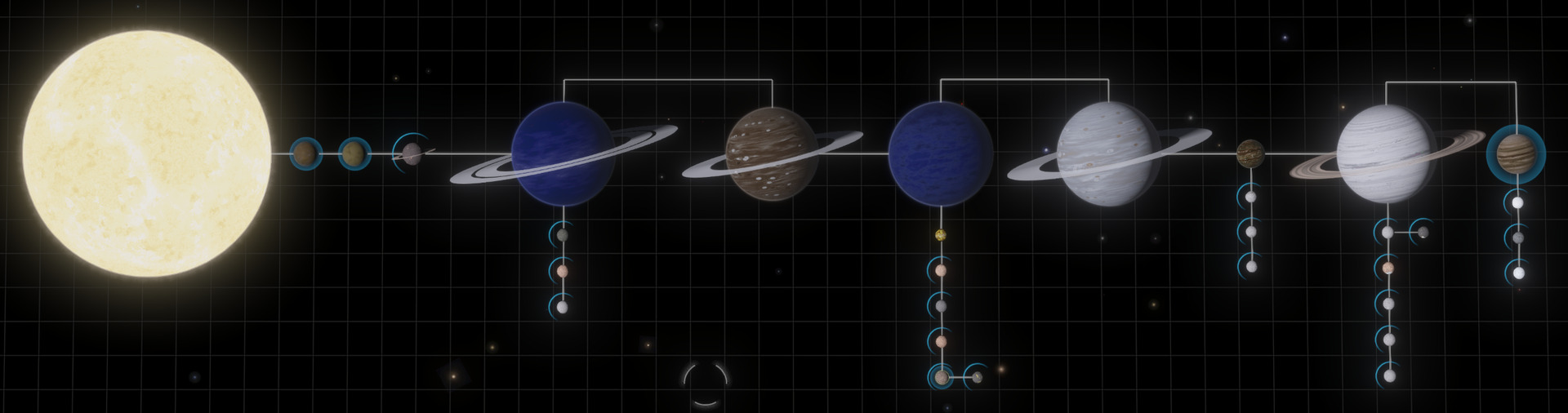 Summary: A ringed Class II Green Gas Giant with several thin clouds of pink and green. A variety of landable bodies, with all surface materials present in the system. | |