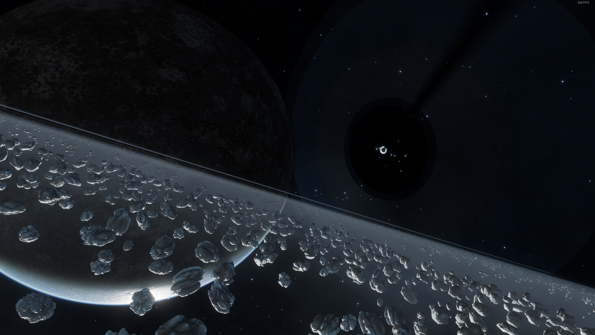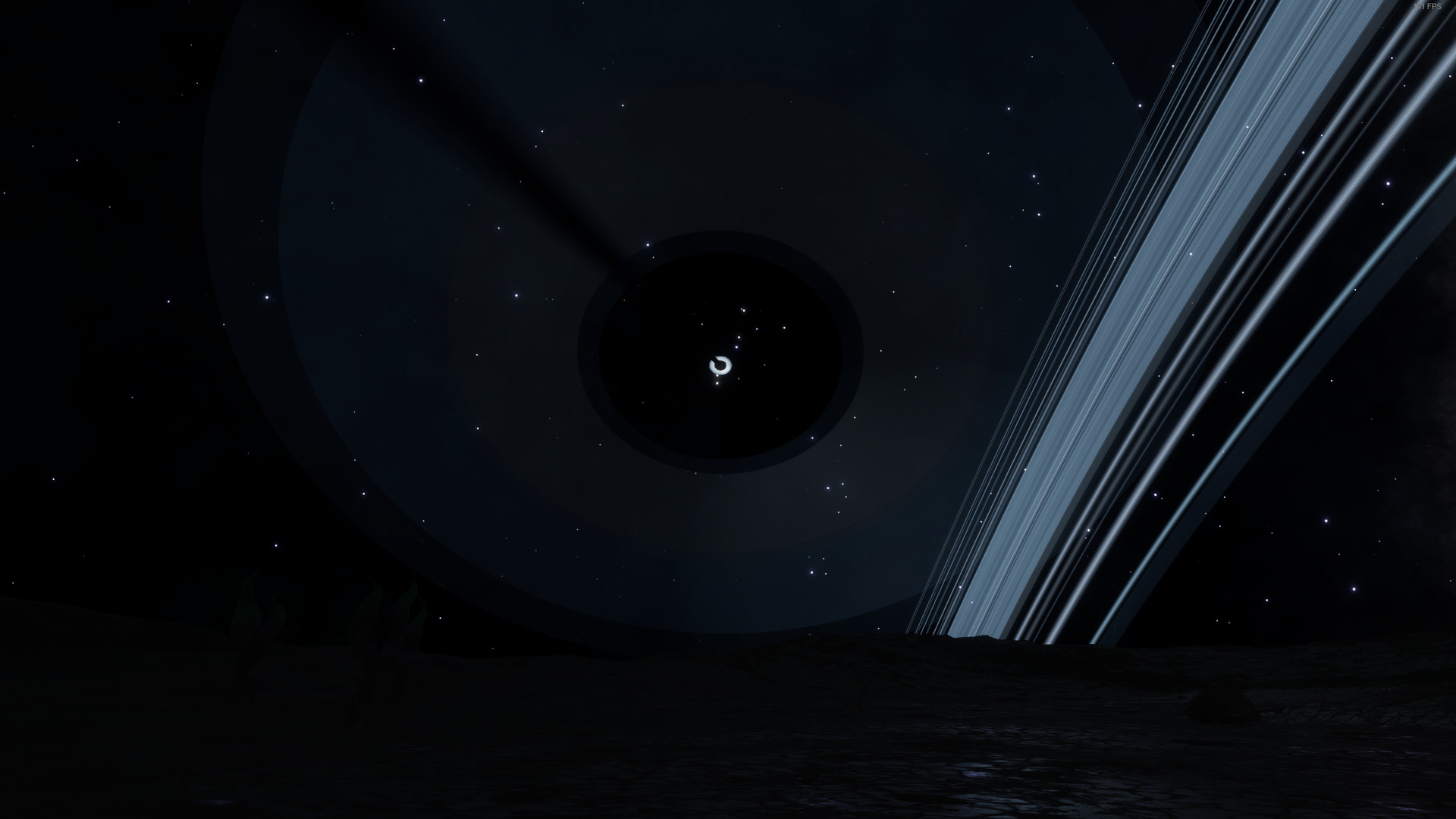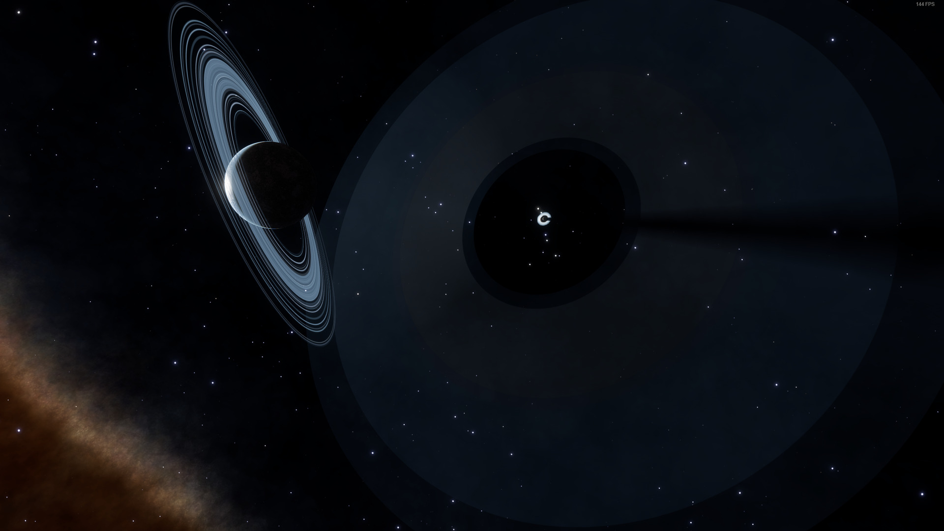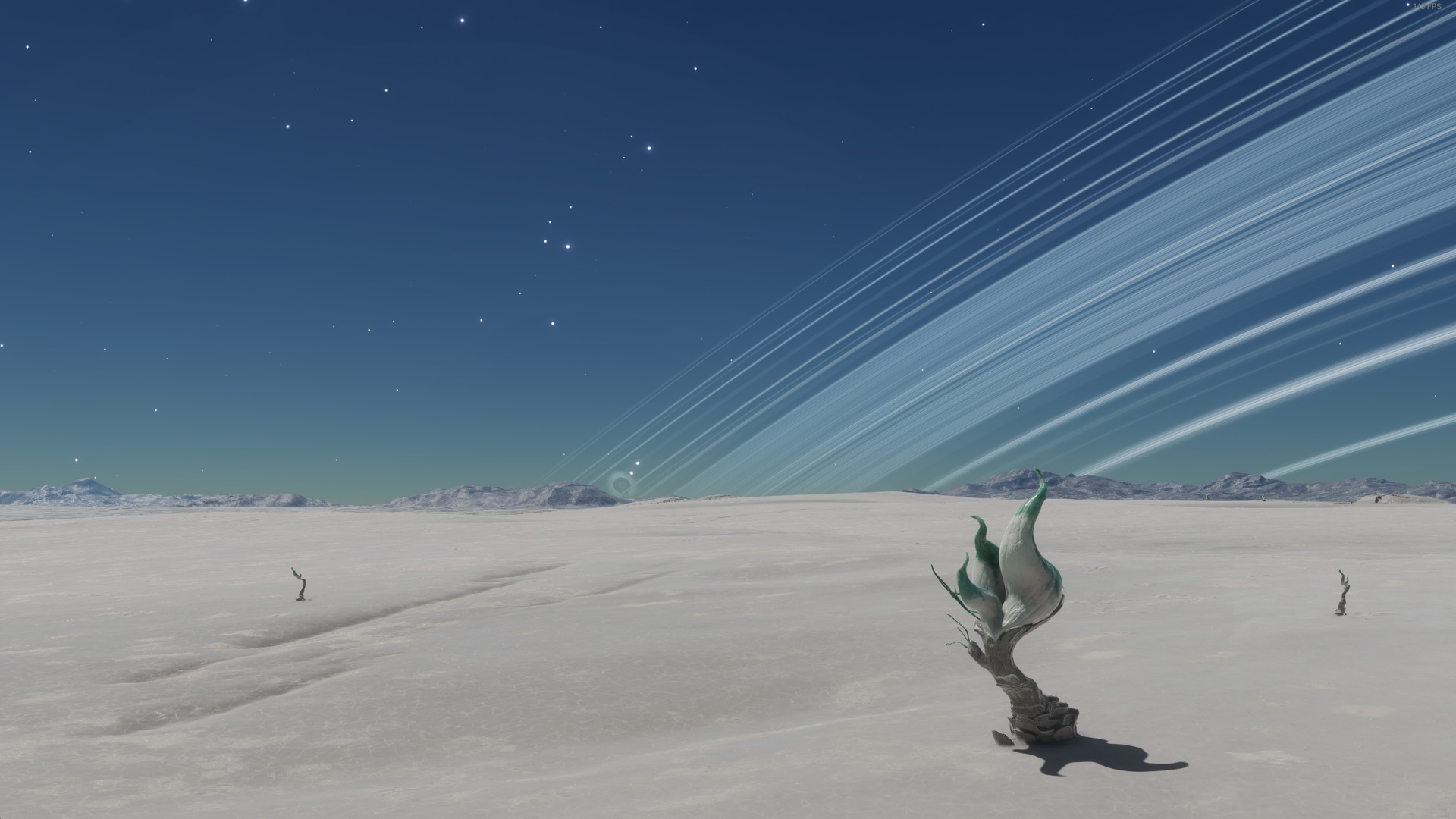 Description: The fourth planet in this system is a Class I Gas Giant with an exceptionally wide outermost ring, coming in at 4.4 million kilometers in radius. The system's main attraction is the gas giant's seventh moon (4 g). It is a ringed icy moon with a thin nitrogen atmosphere, with a high inclined (67 degrees) and close (0.05 AU) orbit around its gas giant. Thanks to these, the resulting views are stunning. From the surface of the planet, the giant's outer ring can be seen faintly through the planet's atmosphere during the day. However, during the night it is starkly visible, and along the moon's terminator it remains visible through the twilight. In addition to this moon, the giant also hosts a total of six shepherd moons between its second and third rings, with two pairs of moons in close and fast binary orbits. Powerful geysers can be found on the surfaces of the 4 b and 4 d moons. The system also hosts a large Ammonia World with wispy clouds. | |