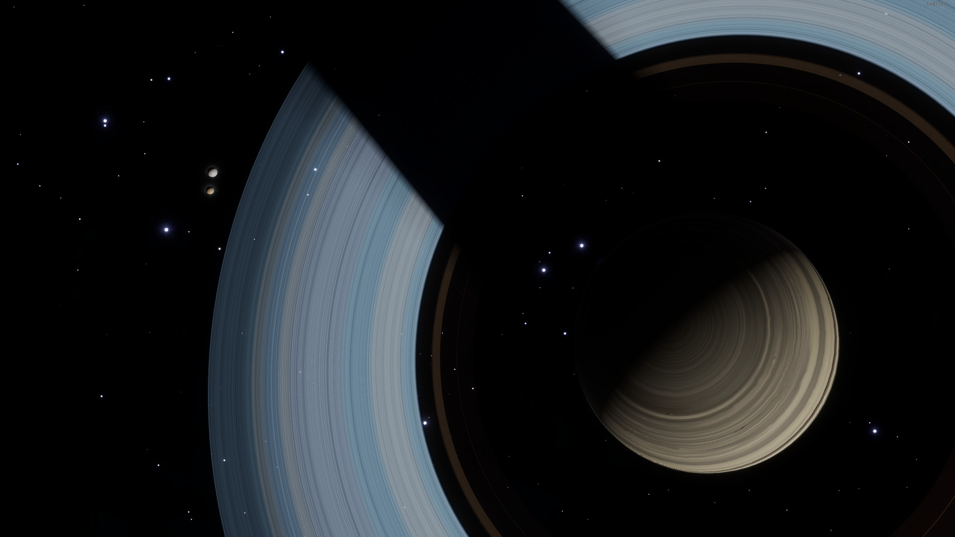 Summary: An atmospheric ringed icy moon on an inclined orbit around a gas giant that has extremely wide rings, and six shepherd moons. | |