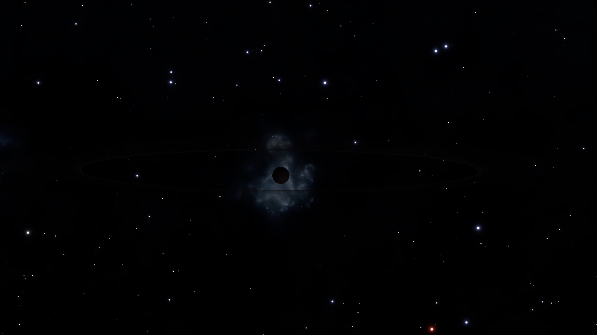 Description: This system contains the only known ringed neutron stars in the Trojan Belt - a pair of them, one in light, and one in shadow. In ancient Greek mythology, Scylla and Charybdis were monsters in the Strait of Messina, who together posed an inescapable threat to passing sailors. To avoid Scylla would place you too close to Charybdis; to avoid Charybdis, too close to Scylla. When sailing through, a choice needed to be made to decide the lesser evil. Named for the vicious, six-headed beast who boldly plucked sailors off of passing ships, caring nothing for stealth or finesse, Scylla (AB 2) sits brightly in the sky, illuminated by a nearby M class star. Its outer rocky ring is over three million kilometers in radius, and can clearly be resolved against the backdrop of space from nearly 1,000 ls away. The inner ring is much smaller, and rotates around Scylla at a quickened pace - with an orbital period of only 15 minutes, you can sit inside the ring and ride it like a carousel, the starscape visibly spinning around. Charybdis (AB 3), its sibling, lies roughly 4,900 ls distant. In the same way that this ancient personification of a whirlpool "sucked black seawater down", this star and its spiraling ring receive no light from any other external source, leaving the ring in treacherous, nearly invisible shadow. Positioning the galactic disc in the background just right will allow you to see its silhouette. Approaching this ring is far more dangerous than approaching the ring of Scylla. It is very difficult to gauge how close you are to its drop zone, and going more than barely above minimum throttle is enough to cause an emergency drop, hull and module damage. Once inside, despite the piercing light of the nearby neutron star, the scene remains in stubborn, supernatural darkness. Charybdis has a voyeur - a landable body (AB 3 a), ringed in itself, every bit as dark and mysterious as its parent star. Also like its parent star, you can catch a glimpse of the body and its ring by casting it against a bright backdrop. Flying around and through the system, you will experience distortions of space around you, caused by the two black holes in the vicinity of these creatures, which lend further eeriness to this already strange place. | |