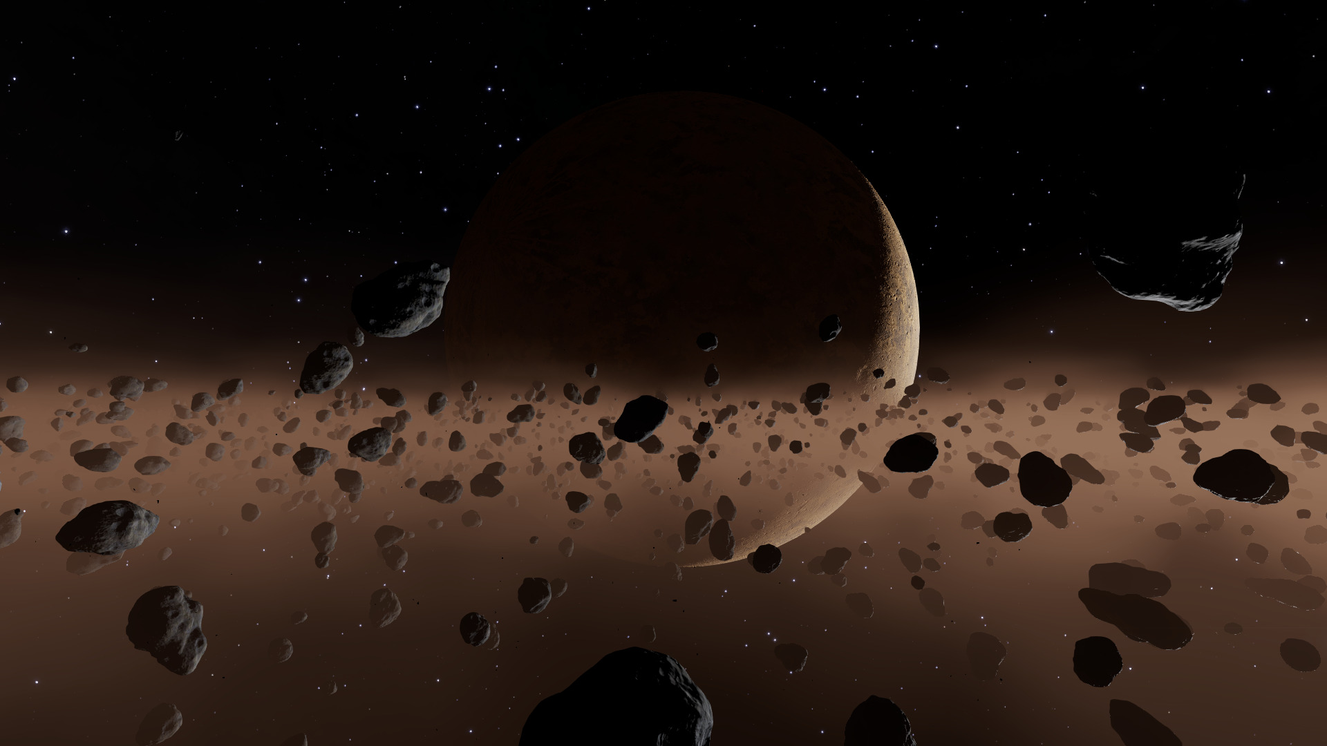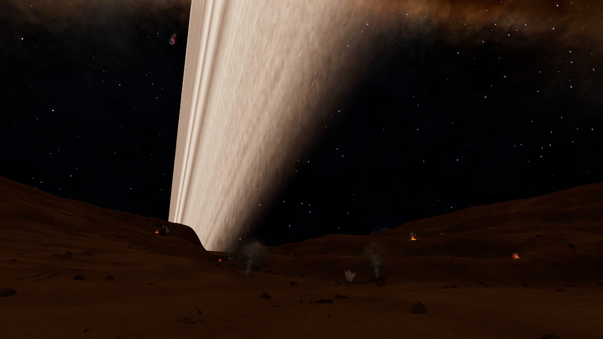 Description: The third body in the Gru Drye LX-A d1-41 system is a Gas Giant with Water-based Life and two moons. The first moon (3 a) is only 155 km away from the giant's rings. Due to this proximity, a Commander who disembarks on the surface can see individual asteroids moving across the rings. The gas giant has two rocky rings; the largest of them has an outer radius of 206,730 km and an inner radius of 115,230 km. The moon has volcanism (Major Silicate Vapour Geysers) and a gravity of only 0.11 g. Additionally, this tidally locked moon has a rotation period of 0.7 days. Because of this, one can observe within a day how the moon completes an orbit around its parent planet and its rings. | |