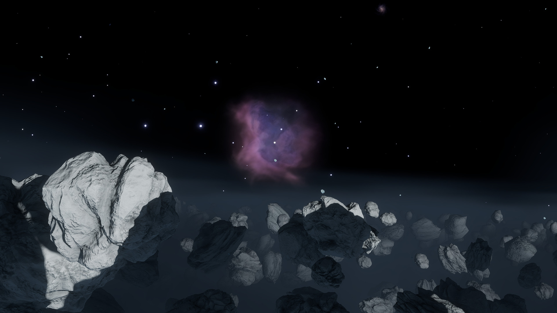 Description: This is one of two systems containing Stolon Trees and pods. Its twin Alastor is in the nearby nebula and is the home of the DSSA Solsen's Alastor, which occasionally will make the short hop between the systems. The system hosts several scenic views featuring the nearby nebula. There are two Notable Stellar Phenomena in the system. The nearest to the main star has a Viride Lagrange Cloud, which when lit by the star can appear in a vibrant yellow. The Stolon Trees are very much larger than even a ship like the Anaconda. They have multiple arms with a hinged container for the pod. The pods may be found floating free, with or without the container. They have several distinct states: they may be open or closed, and they might carry a "pearl" or be empty. (See a video here.) Research limpets can also be used to retrieve samples from these seed pods. The second Notable Stellar Phenomena signal is inside the rings of planet A 7 and contains an unidentifiable Ice Crystal that can cause a temperature drop if closely approached. When composition scanned, no identification is presented and no entry logged to the ship's computer. The crystal is similar to the Purpureum Ice Crystal, but has many extra spikes compared to it. Planet B 5 contains surface life in the form of Crystalline Shards, which can be shot to release Antimony. In fact, Asterius is a so-called "green" system, meaning all materials can be prospected from the surface of the bodies here. Many of the materials can be found around volcanic features, making them easy to collect. The shards are challenging to locate, but can be found near latitude 3.48163, longitude 12.79011 | |