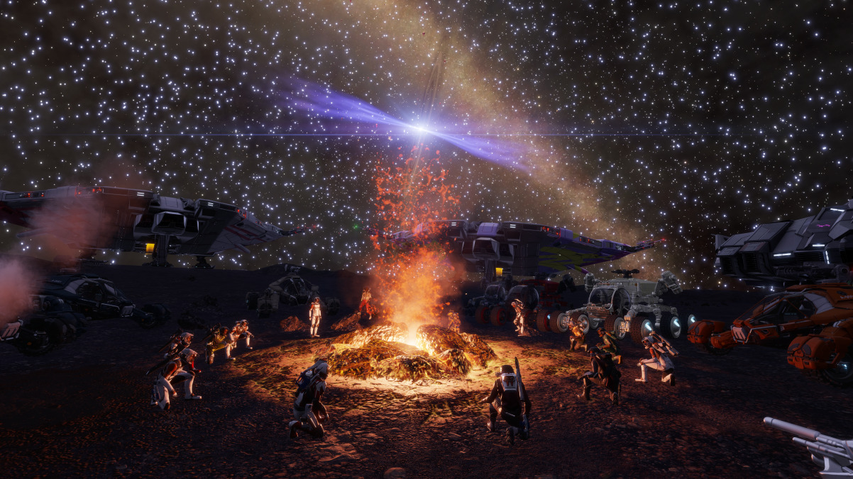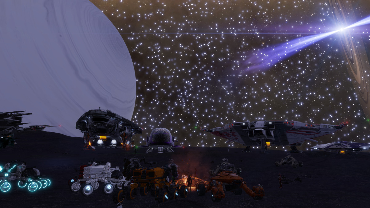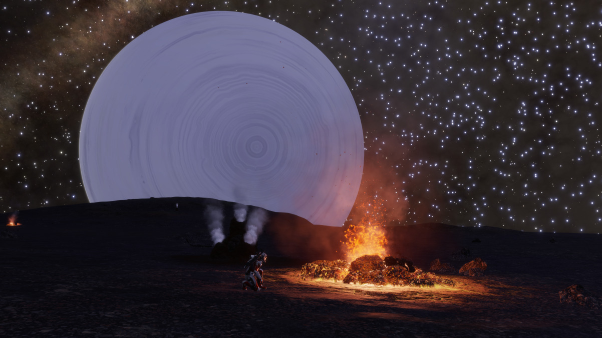 Description: This system, located at the Northern end of Odin's Hold, has a ringed white dwarf star in a binary orbit with an M class red dwarf star. Both are in orbit of a black hole that is the primary star of the system. There are eleven bodies orbiting them, making for some excellent views. The black hole itself is unremarkable, what is of interest here is the ringed white dwarf that orbits it. The star's rings are lit by its binary partner, which is an M class red dwarf star. There are multiple bodies orbiting it, most of them being rocky bodies with thick atmospheres, with one exception: a gas giant (1 f) with a moon, that's in a close and inclined orbit around the star. The gas giant is a pale white Sudarsky Class II gas giant. It completes an orbit around its parent in 3.3 days. It has just one moon, which orbits the gas giant closely. This nested moon (1 f a) is the only landable body in the system. There are only a few other known examples of a gas giant's moon orbiting this close to a ringed white dwarf's rings. Thankfully, the moon's orbit is inclined to the star's rings, so they are usually well visible. The moon also has surface volcanism, so explorers can enjoy even better views around the lava spouts and vents. Images by CMDR Richard Fluiraniz | |