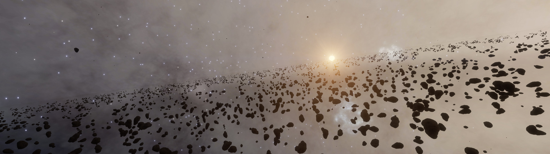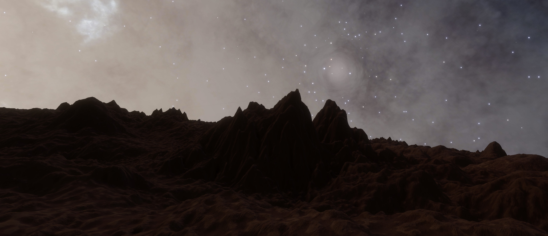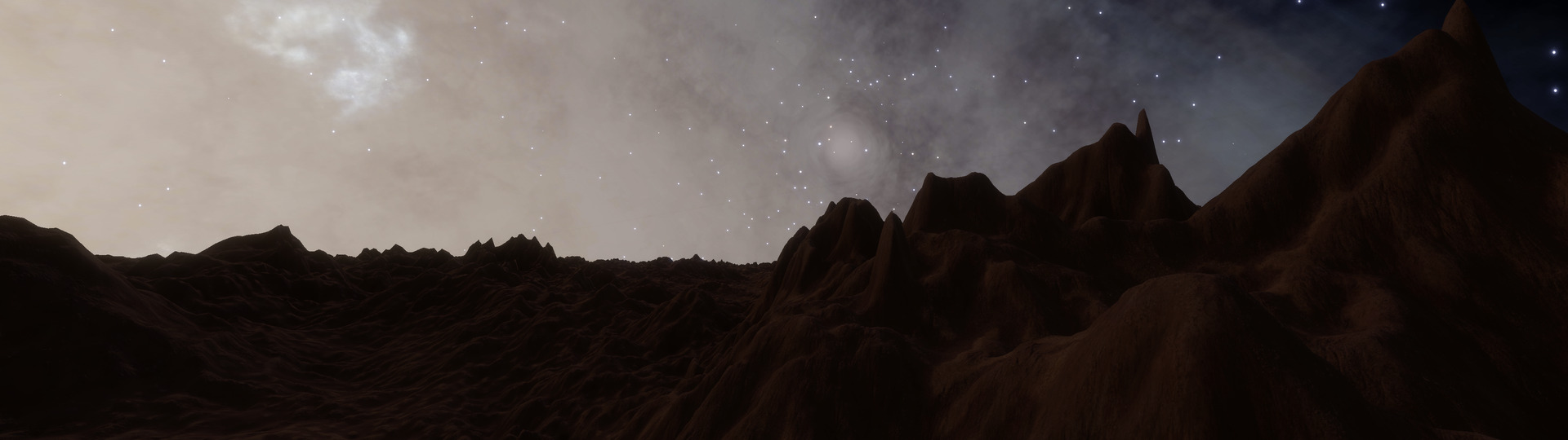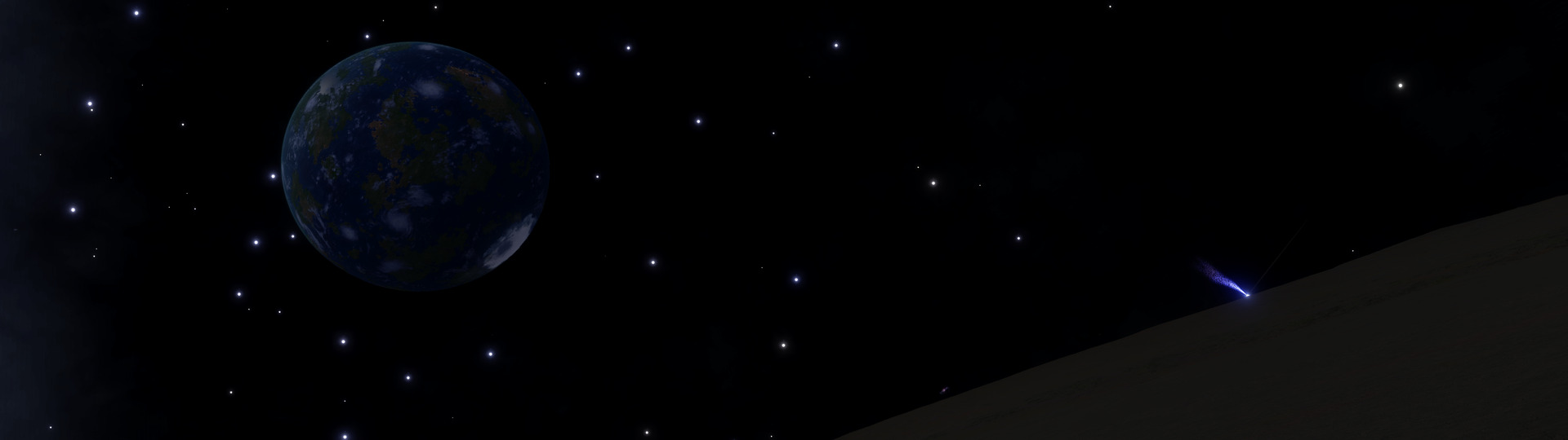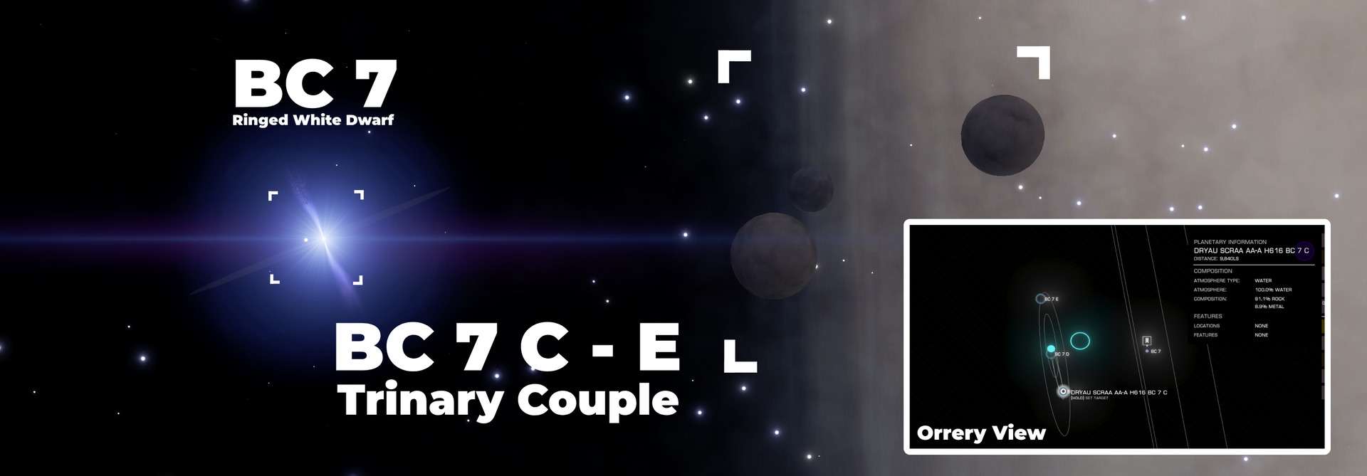 Description: This system, is located at the Western edge of the Empyrean Straits, slightly over two thousand light-years above the galactic plane. It contains a trinary black hole set, with the notable locations orbiting the barycentre of the second and third black holes. This part of the system contains a total of nine terraformable planets, among them a Water World and an Earth-like World. BC 7 is the white dwarf star that is the highlight of the system, and which contains some of the rarer types of bodies. A total of 8 bodies orbit this ringed white dwarf. These include one of the few examples of a trinary moon system on an inclined orbit around a ringed white dwarf star. All three of the bodies are candidates for terraforming. Moving along the other satellites, BC 7 f is an Earth-like World. It also has a nested moon (BC 7 f a), with an orbital inclination of 26.33 degrees. Its surface is landable, and there are nice views to be seen of both its parent and of the white dwarf star. The next is BC 8, which is a wide-ringed K class star. Its rings span 44,392,256 km, and weigh a total of 10.1 quadrillion MT, putting them in the upper ranges in that aspect. BC 8 d is a gas giant with a high orbital inclination of 84.60 degrees. However, as of 3310/12/08, the gas giant is opposite of the galaxy, and with little illumination, its rings are expected to remain barely visible for the next hundred days. BC 8 c is another point of interest because its terrain can be extremely jagged. While this might make it difficult to find a suitable landing site, it also makes for excellent opportunities for extreme mountain climbing. Sadly, the ring is barely visible from this moon's surface, as it orbits in nearly the same plane as the rings do. | |