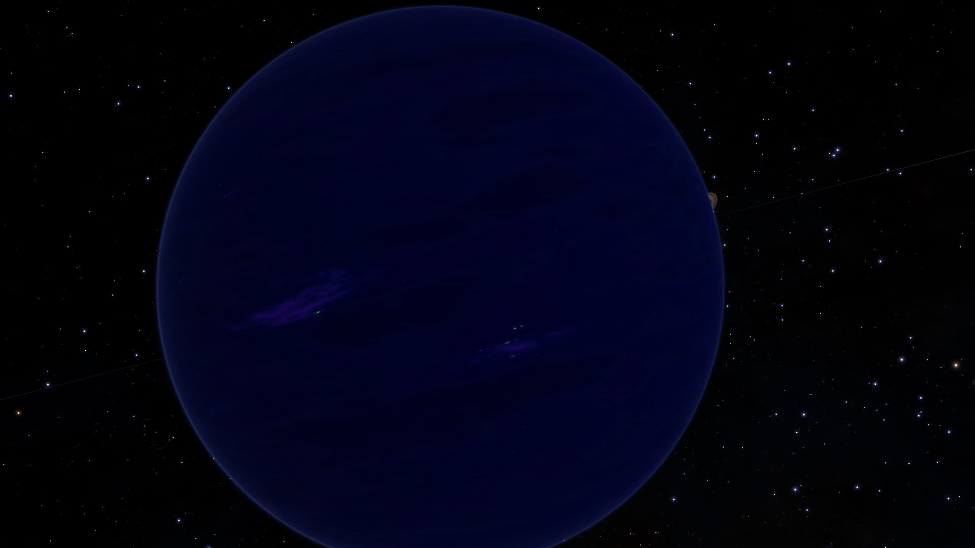 Description: Planet 1 is a blue Class III Gas Giant with small spots of green around its equator, so tiny that they resemble fireflies. There are areas of lighter blue and deep magenta around and near the clouds. From a distance, the green clouds are nearly invisible, but they can be seen up close. This is a Green Gas Giant for GGG enthusiasts. The entry's name comes from the Aztec legend of Xochitli, a sacred firefly who was tasked by the goddess Cihuacoatl to return light to a drought-ridden and withering world. | |