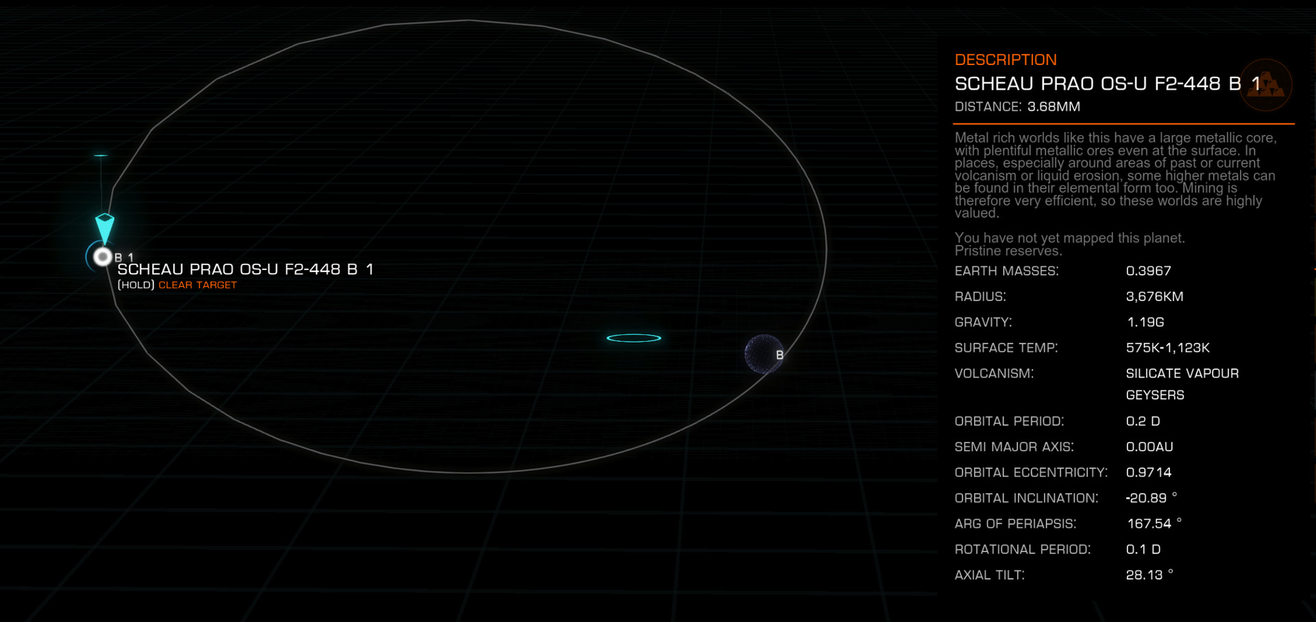 Description: The planet B 1 of this system is a landable metal-rich planet that orbits a white dwarf star on a highly eccentric trajectory, and at the closest approach, it passes extremely close to the star. A complete orbit takes 0.2 days (4.8 hours), so it's easy to land on the surface while the body is farther from the star - and then wait until it reaches periapsis. Bear in mind that days on the planet are only 2.4 hours long, so make sure the star is visible from your location at periapsis. During this time, the jets of the white dwarf light up the sky, producing spectacular sights. Keep in mind the danger, however! As of the time of discovery, 3311. January, this planet is the record holder for the closest approach to a white dwarf star. | |
