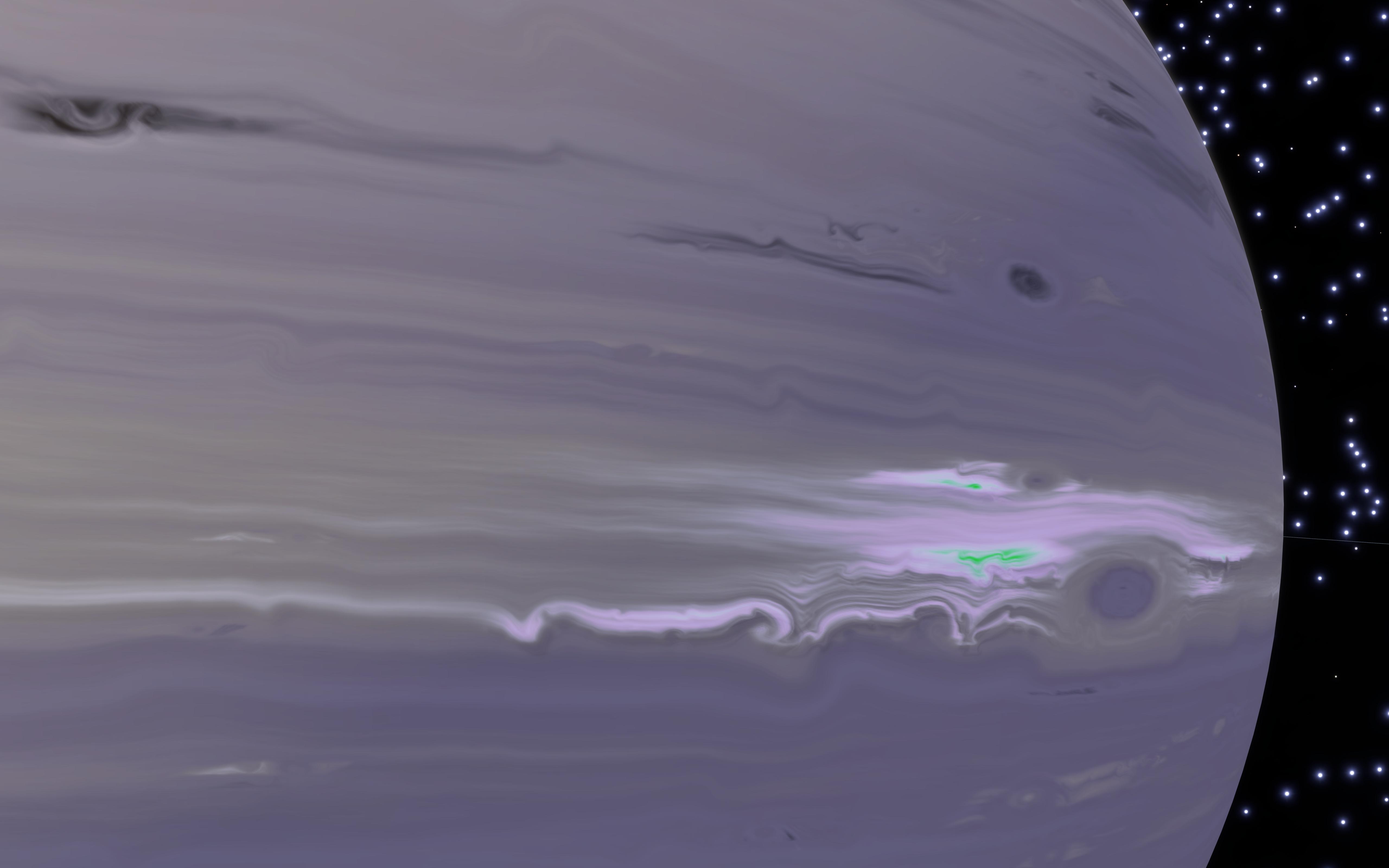 Summary: A subtle Green Gas Giant, displaying only three small islands of bright green clouds. | |
