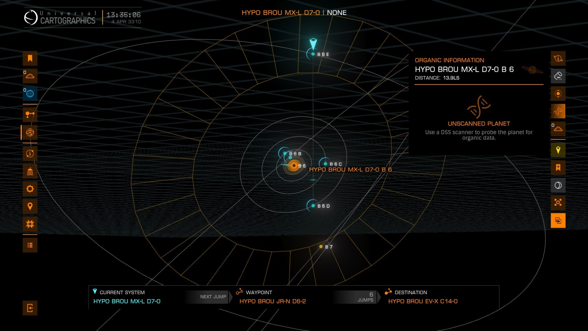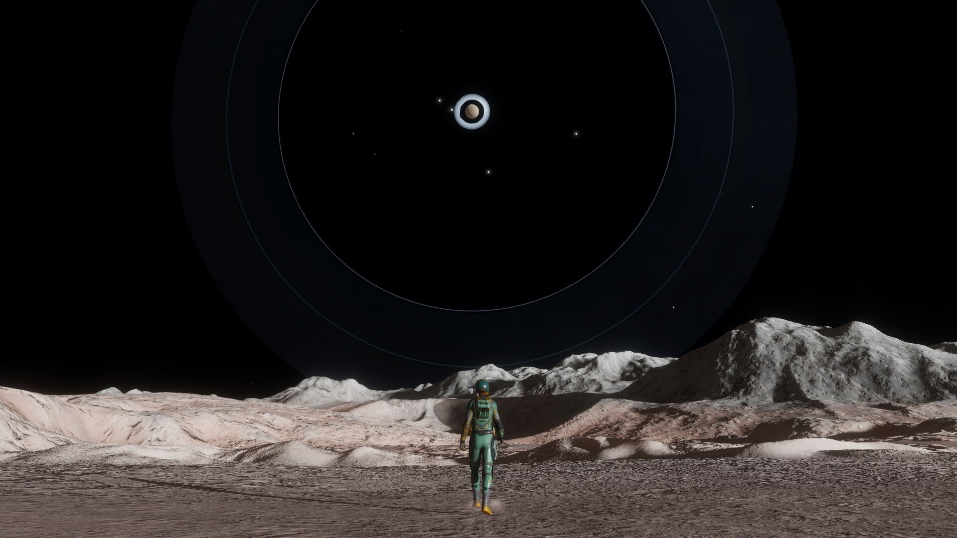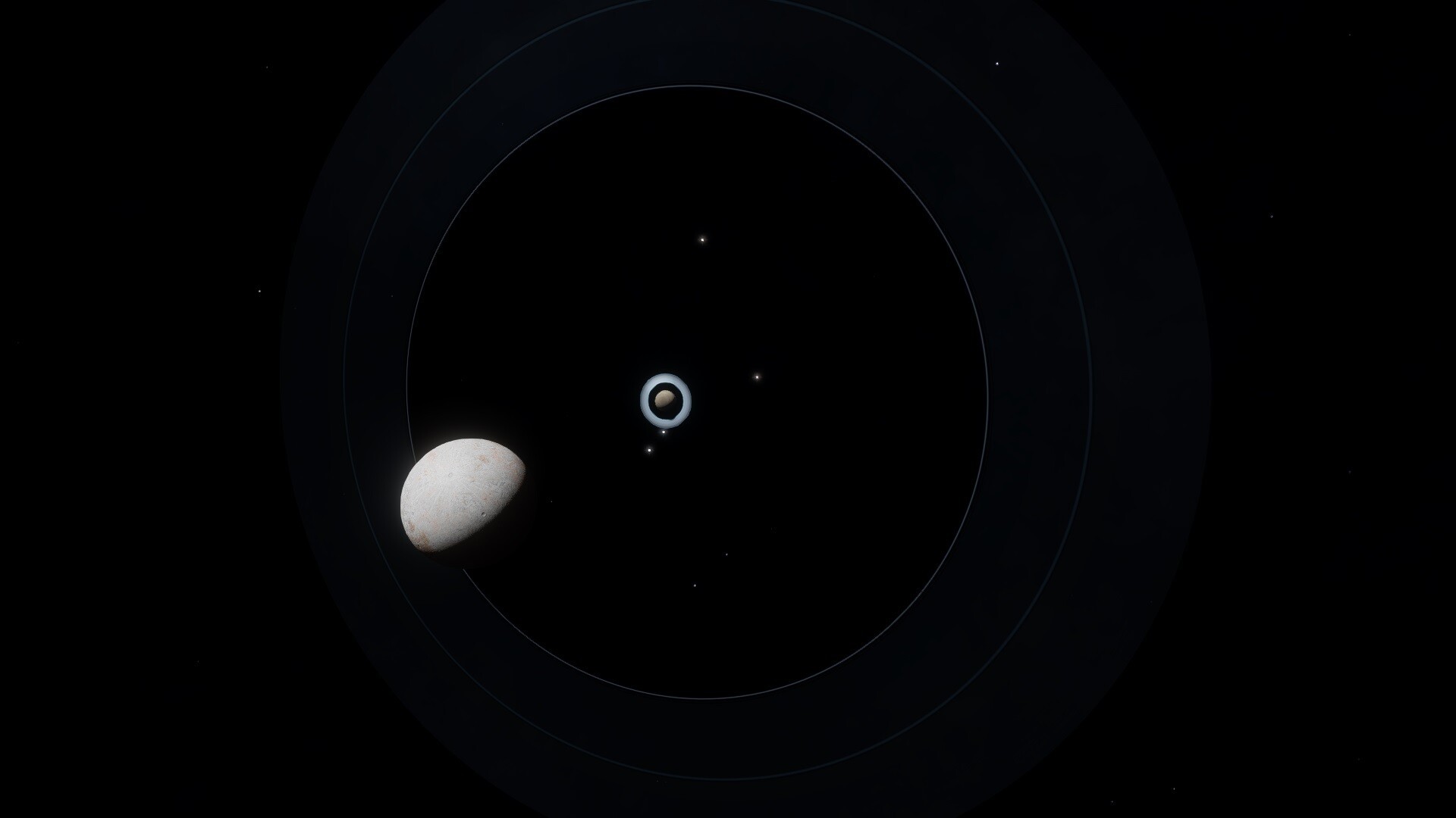 Description: This system contains a gas giant (B 6) with three rings, with the outermost one being about 3 ls wide, stretching out to 8.5 ls. There is a large gap of over 5 ls between the second and third ring, cleared out by four shepherd moons orbiting in between them. The orbit of the fifth moon (B 6 e) lies outside the outer ring and is inclined by over 85 degrees, providing a breathtaking view of the three ring systems and of the inner moons from its icy surface. Since the moon frequenty gets into a position directly above the wide gap in the rings, it has been nicknamed "Ice Shanty" by its discoverer after a temporary structure used for shelter that is built above a hole in the ice for fishing. | |