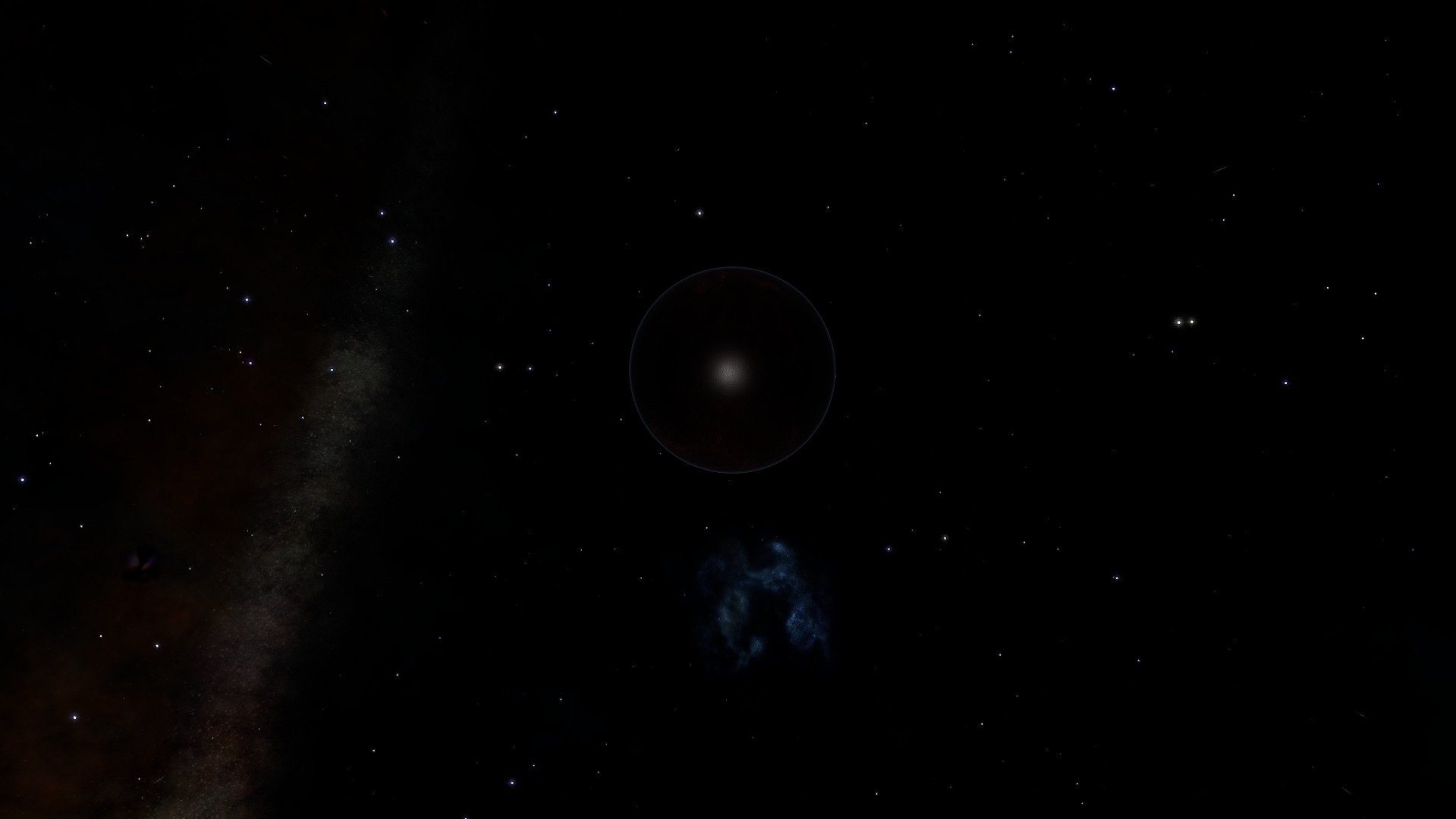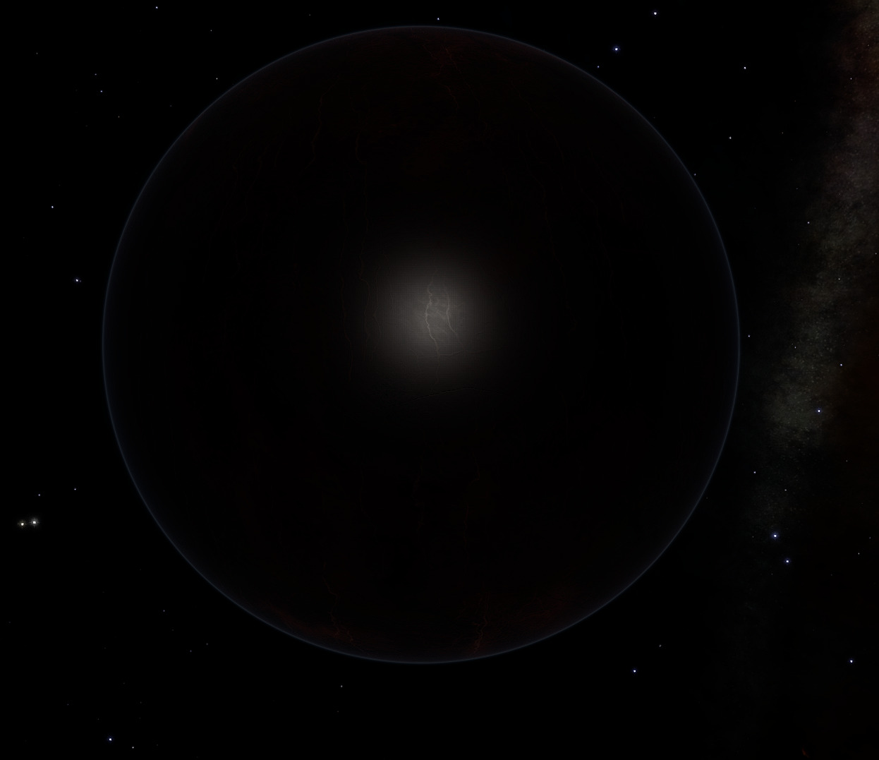 Description: The third planet of this system is classified as a Rocky Ice world. It has extreme characteristics, however: due to runaway greenhouse warming, its has a surface temperature barely lower than the red dwarf star it's orbiting. From above, the planet appears almost completely dark, with some red coloring: The atmospheric pressure is 142,626 atm, and the average surface temperature of 2,245 K is only slightly lower than its parent star, an M class red dwarf that is 49 ls away. In these conditions, nothing is visible of the surface. Note that despite all this, the planet shows no signs of volcanic activity. Scanners estimate a mixed composition of 32.2% Ice, 45.3% Rock and 22.5% Metal, hence the planet's classification. Whether surface volcanism is really absent or not might forever remain a mystery though, as these conditions make it virtually impossible to send down anything to the surface intact. | |
