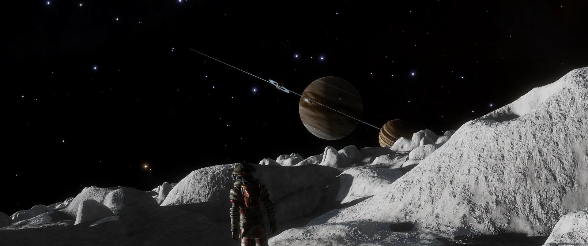 Description: The highlight of this high metallicity star system is its eighth planet, a ringed Helium-Rich Gas Giant that has six other Helium-Rich Gas giants as moons. The sight of these giant moons dancing around their parent planet is already remarkable, but Commanders can witness this not just from their spacecraft in orbit, but also landed on the ground: there are two nested moons (8 b a and 8 f a) which are both icy bodies. Explorers can land on these nested moons' surfaces, and keep watch from the ground on how the gas giants go through their cosmic dances in the sky. The name "Nested Wonders" refers to the orbital hierarchy of this place: moons around moons, within a family of giants, each nested like celestial Matryoshka dolls. To quote what the discoverer wrote in his journal: "I landed expecting a data point. I left with a picture for my cockpit's wall." There are many other gas giants here, likely owing to the high metallicity of the system. Three of the many moons here have thin Ammonia atmospheres, with life present on their surfaces. | |