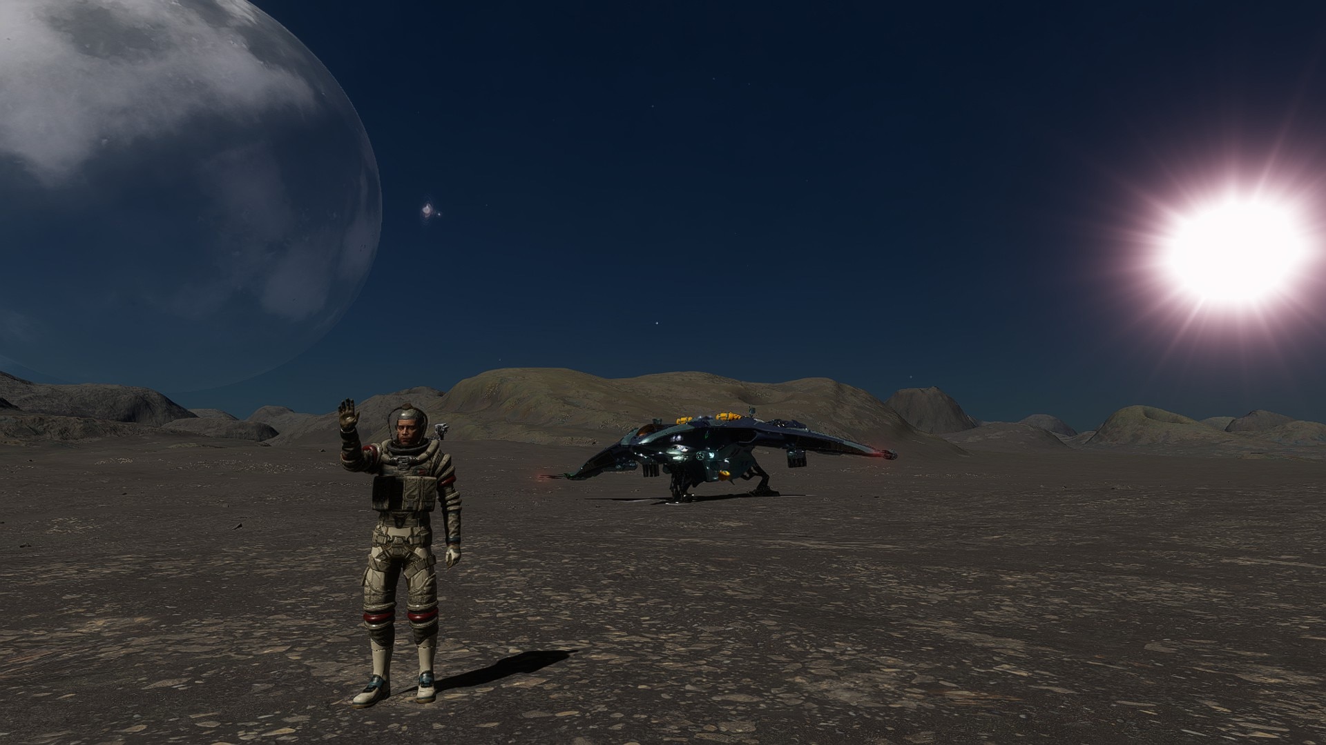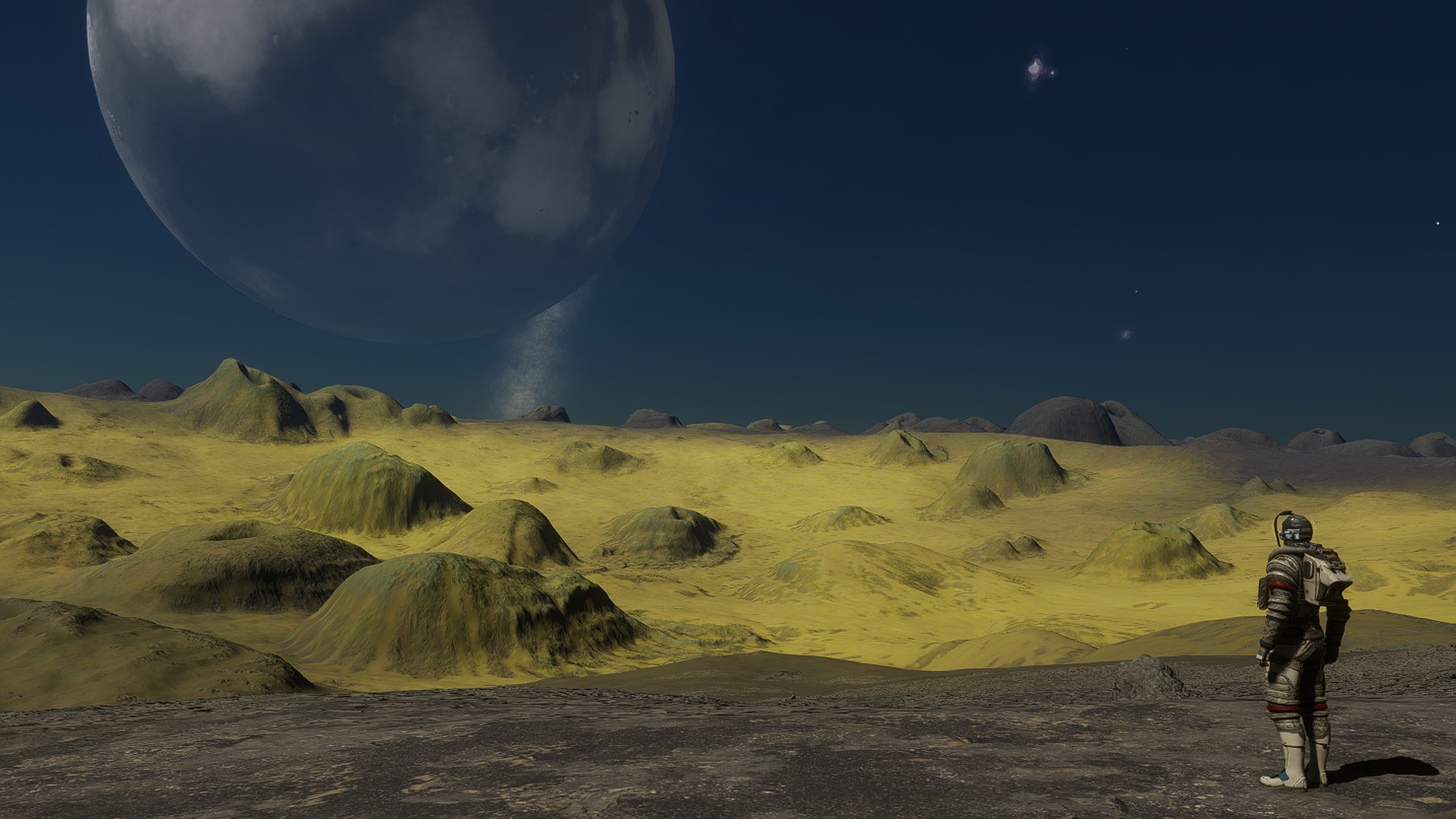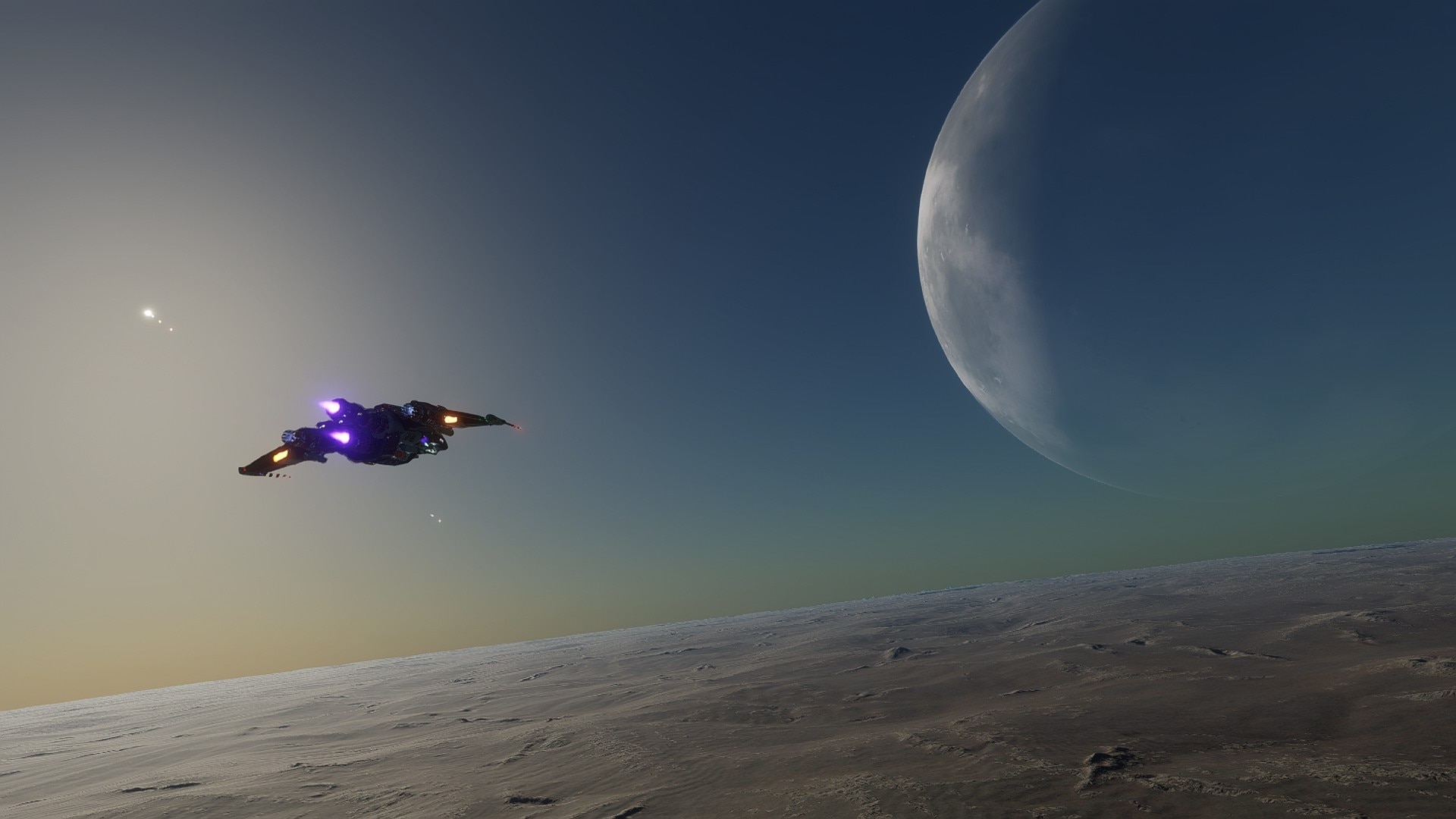 Description: This system is found along the usual way to Beagle Point, and explorers who are traveling there make a stop here to admire two closely orbiting binary moons, 10 b and 10 c. They are only 11 Mm apart, and one of the two moons is landable, with surface life and volcanism present on its surface. They were discovered during the Philairone Experience expedition, still underway at the time of writing. Zephyr and Boreas are the nicknames for the moons chosen by their discoverer, after two wind gods from ancient Greek mythology. There are several different stories about them, with the common theme being their love for Anemone, a beautiful nymph who was turned into a flower - in some stories, out of jealousy, in others, for protection. These two moons are 10 b and 10 c. As mentioned before, only the 10 b moon can be landed on, but it has both life and volcanism on its surface. The species found here are Stratum Cucumisis (Emerald) and Bacterium Cerbrus (Lime). The surface volcanism features fumaroles, lava flows, and volcanic vents, as well as volcanic areas typically containing sulfur, which helps explain the high mineral content of the atmosphere. Explorers who are patient enough to wait for both stars (the system's primary F star, and the brown dwarf star) to rise can find some scenic views to admire, and good opportunities for some photography. | |