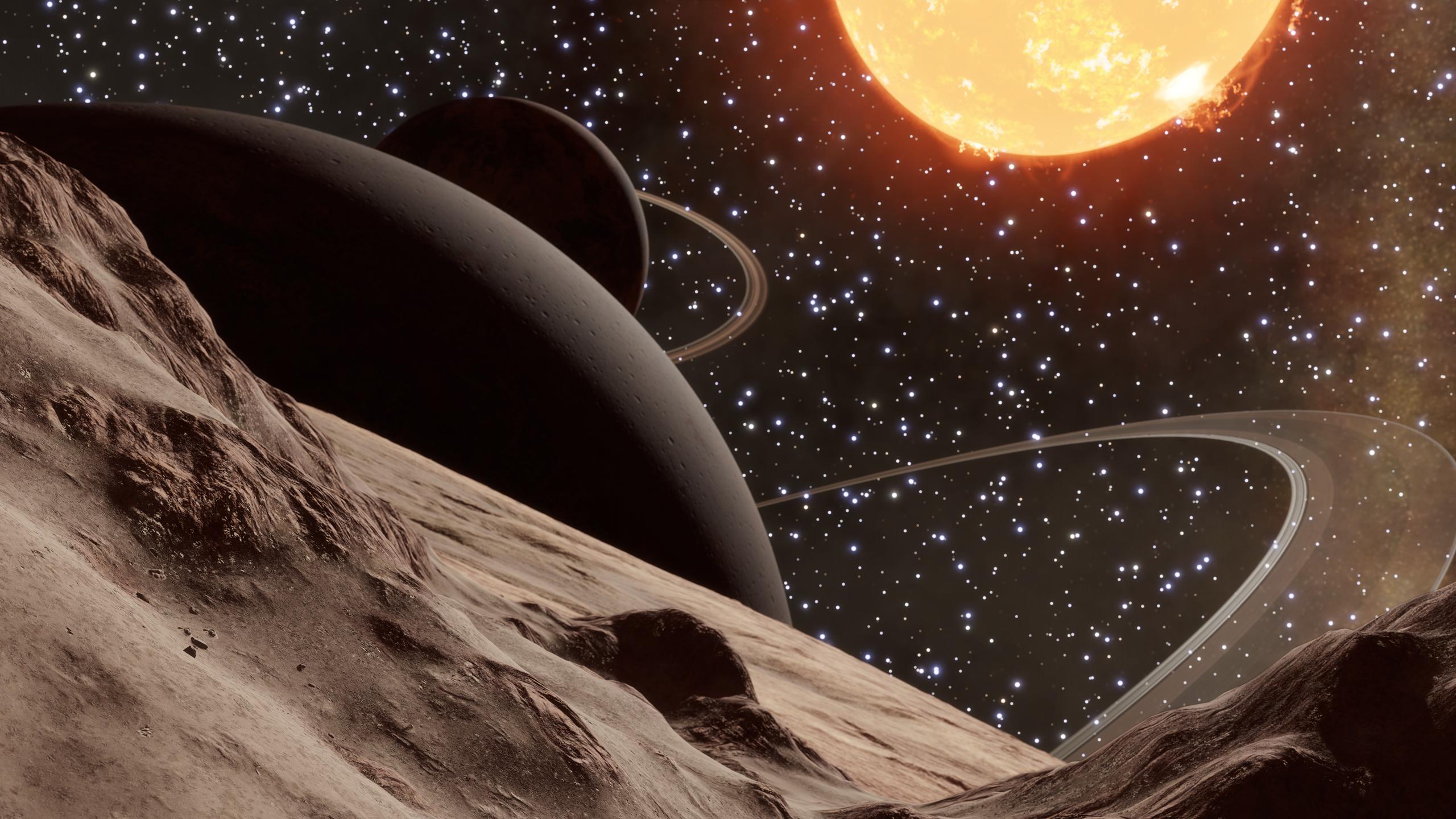 Summary: A system with fast-moving ring structures, hazardous approach zones, and stunning views, between two closely-orbiting Metal-Rich worlds and a small rocky moon passing near one of the rings. | |