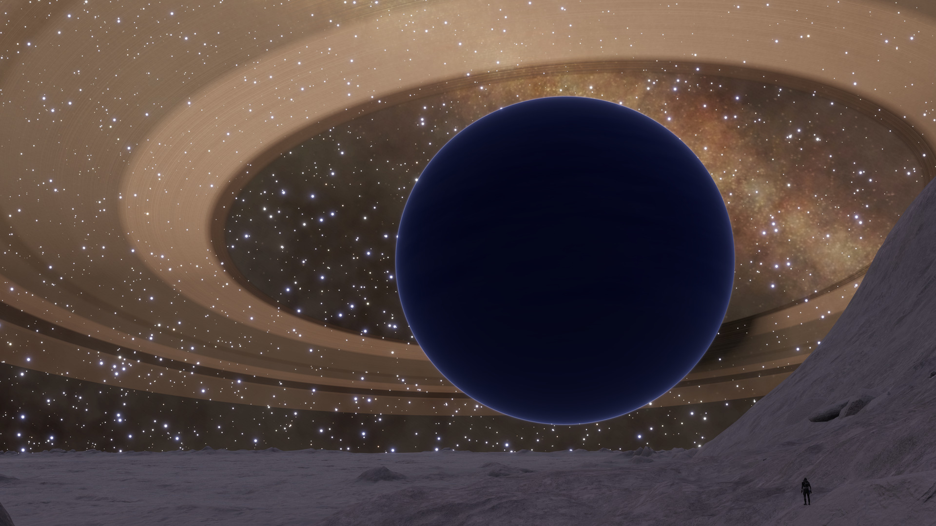 Description: In ancient Greek mythology, Ares and Athena were both gods of war, but they represented opposite aspects of warfare. Athena embodied wisdom, and utilizing cunning strategies in battle, whereas Ares embodied fury, the chaos and violence on the battlefields. Zeus, the head of the gods, stood above them both, always ensuring that none of the two gained lasting victory over the other. As an allegory to this tale, here in this system two ringed worlds are locked in eternal balance, overseen by a silent moon circling the pair. These two planets are closely-orbiting metal-rich worlds, each surrounded by narrow rings, and a small rocky moon that passes near one of the rings at a slight inclination. Between the three, Commanders visiting this system will find fast-moving ring structures, hazardous approach zones, and stunning views of all three bodies from the moon's vantage point. Ares (the first planet) and Athena (the second planet) circle one another in a tight 0.4-day binary orbit, both showing surface volcanic activity and blistering heat, with temperatures ranging from 705 to over 1,370 K. Each is encircled by two sharply defined rings: Ares' metallic inner band gleams between 13,389 and 14,014 km, while its rocky outer ring extends to 15,048 km. Athena's rings are more compact, they form a metal-rich belt from 10,864 to 10,989 km, and a rocky belt stretching to 11,852 km. Zeus (1 a) is a small rocky moon, just 441 km in radius, orbiting Ares every 0.2 days, with a slight inclination of 5.32°. From the moon's surface, Ares dominates the sky with Athena looming just beyond it, and both planets are framed by their shimmering rings. Further from the binary lies Poseidon, the fourth planet: a vast gas giant whose bulk dwarfs the inner worlds. According to legend, the gods were in a conflict over a precious city, and the two strongest contenders ended up being Poseidon and Athena. To resolve the conflict, Zeus decreed that the two should offer gifts to the inhabitants of the city, and the god who found more favor with the mortals would be their new patron. Poseidon brought forth a spring from the ground, but because he was the god of the seas, the spring's waters were salty. Seeing this, Athena planted olive trees over the spring instead: the people saw this as a more wise gift, as the trees and the fruits they bore were much more useful to them. The contest was thus decided, and the inhabitants then named the city as Athens. The gas giant's swirling bands evoke this rivalry, looming beyond the dueling pair. Orbiting close to Poseidon is Triton (4 a), highly inclined at nearly 90 degrees, a faithful moon named after the sea god's son and herald, forever bound to his father's side. The scenes in this system evoke a sense of suspended judgment from afar. Fury and precision locked in perfect opposition, and a silent overseer forever circling above. Here, their quarrel plays out under the distant gaze of Poseidon, whose presence reminds visitors that rivalries in myth, and in the stars, are rarely confined to only two parties. | |