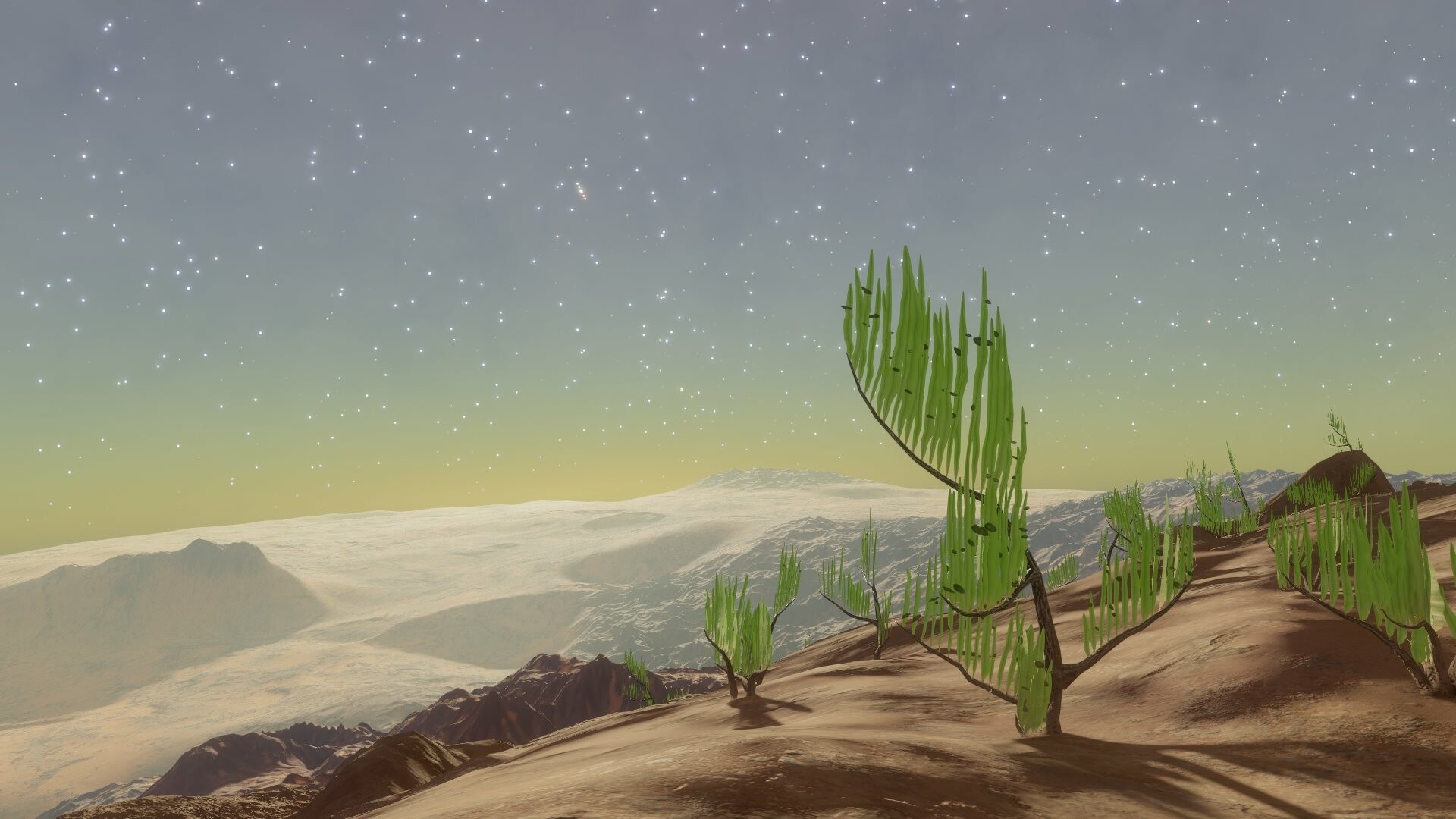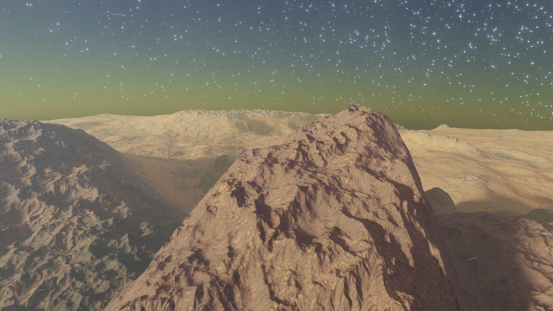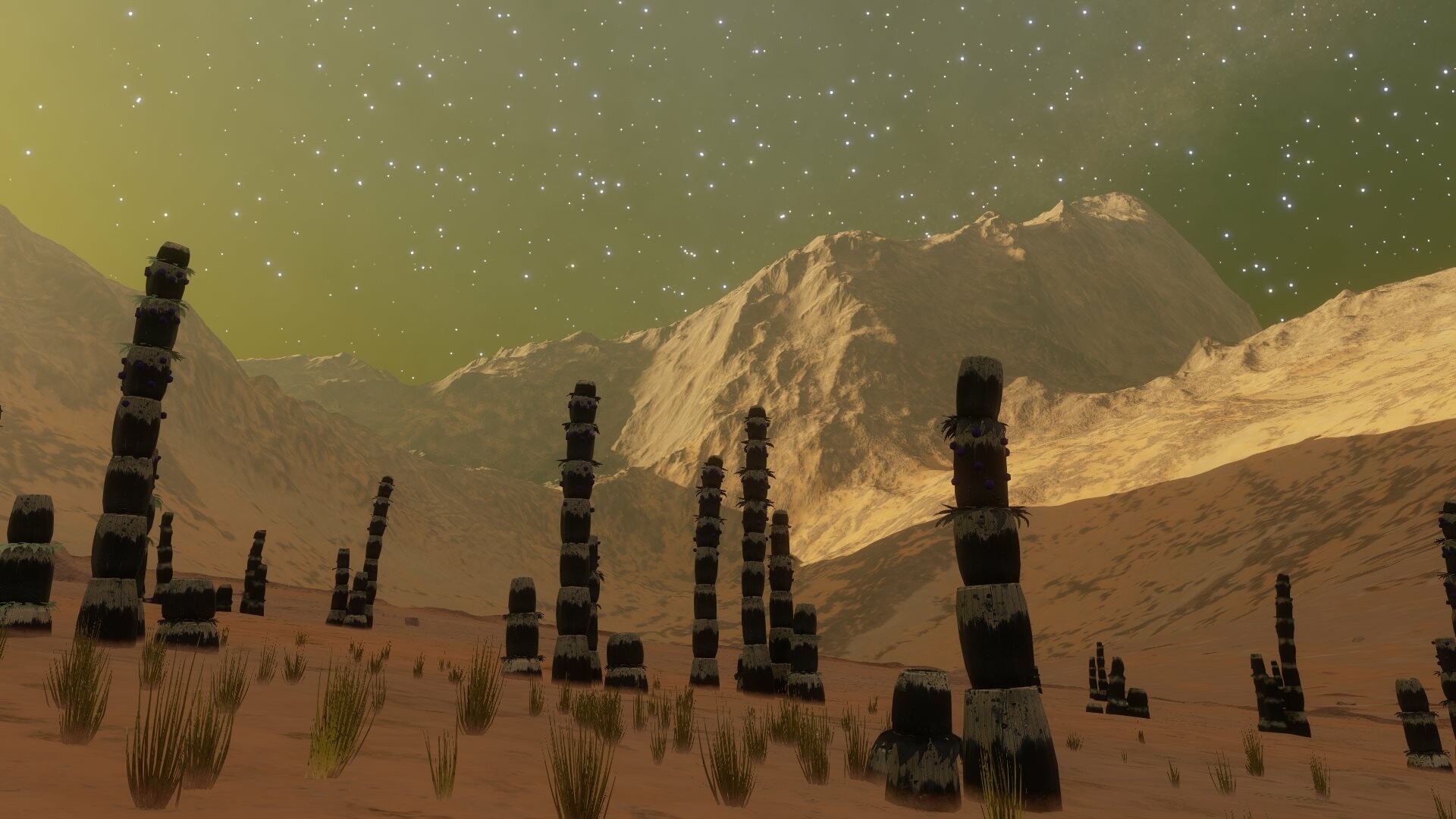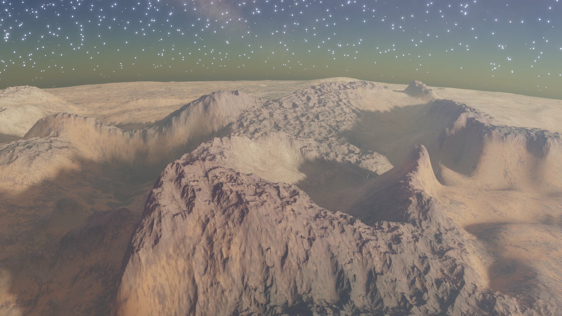 Description: Body ABCD 1 d, a thin Ammonia atmosphere rocky moon of a Class III gas giant, features a striking landmark: a mountain valley encircled by tall cliffs, home to multiple different lifeforms. The tallest and most massive of the mountains shaping the valley, named Blair Peak, is 8.86 km high. Although its summit appears rough and unwelcoming, there is still life to be found there: Fungoida and Frutexa, to be precise. Of course, these plants can be seen in the valley below too. | |