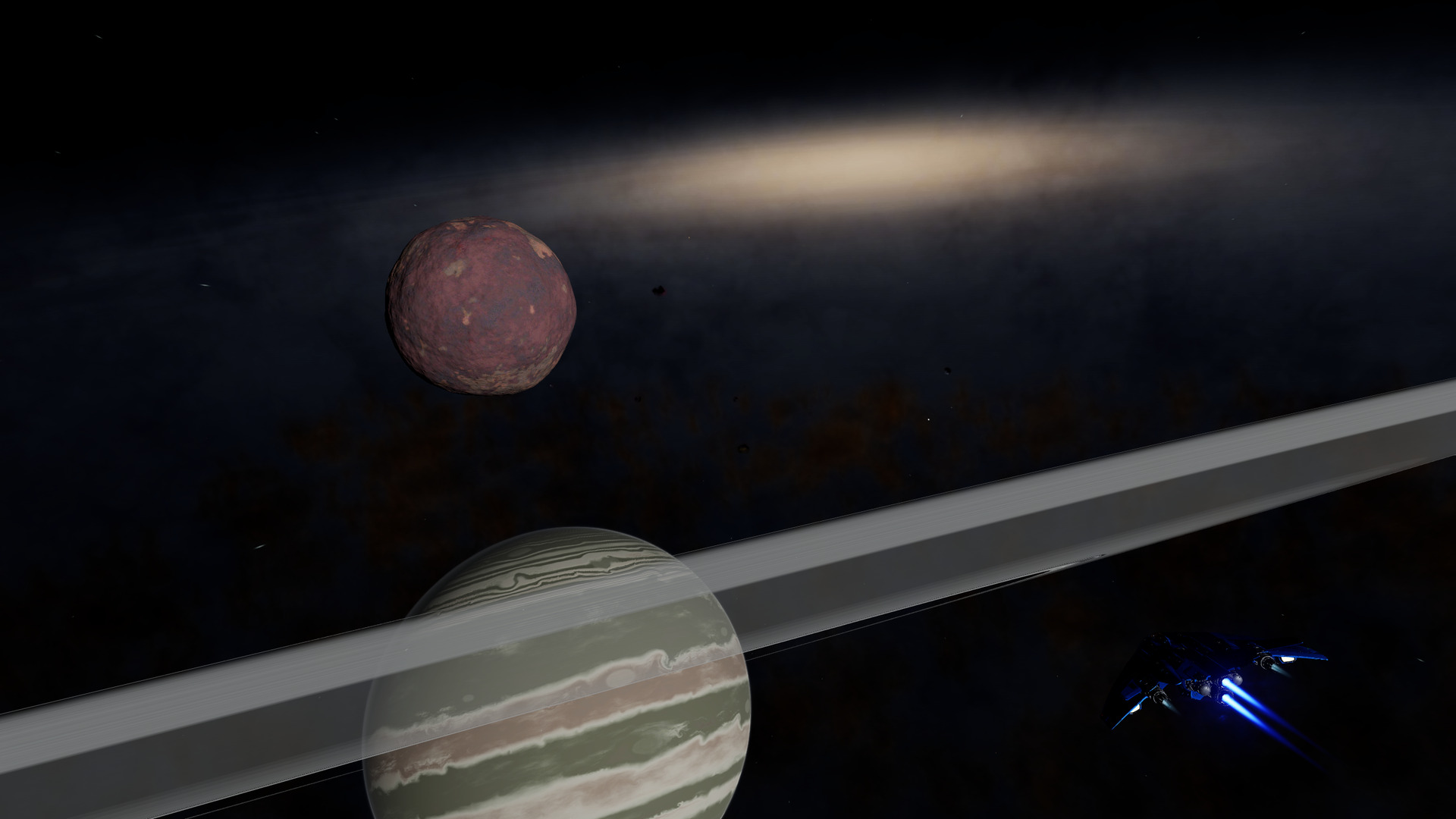 Description: PSR J1300+1240 is host to the first exoplanets discovered by astronomers. Polish astronomer Aleksander Wolszczan discovered the pulsar in 1990 and noted anomalies in its rotational period. He and Dale Frail published a paper in 1992 confirming the first exoplanets. An International Astronomical Union vote for new names resulted in the pulsar being named "Lich", and its three confirmed exoplanets being named Draugr, Poltergeist, and Phobetor. Reaching Lich requires a dedicated exploration ship or a fleet carrier, as distances between stars in the sparse Ushott sector can exceed 100 light-years. Returning is relatively easy via an FSD supercharge from the pulsar. CMDR Dagnarius, the first human to visit the system, uncovered three more planets and five moons, most of which orbit the third planet. All of the moons are irregularly shaped metal-rich bodies with radii between 164-281 km. Four of the five experience volcanic activity on their surfaces due to tidal forces from their parent gas giants. The system's distance from the galactic plane can make landing on the moons' surfaces disconcerting, as some views will provide a completely starless sky, with nothing visible apart from the other planets and moons in the same system. | |