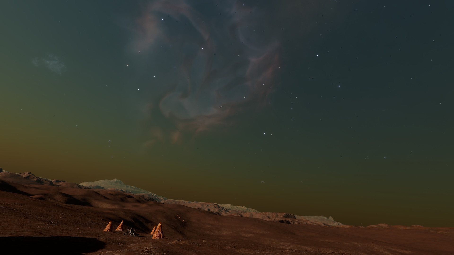 Description: The Statue of Liberty nebula, also known as NGC 3576, was first discovered by John Herschel in 1934. Dr. Steve Mazlin first suggested the nebula's name in 2009 after observing emission clouds within the nebula resembling the North American monument bearing the same name. Explorers on their way here can see the nebula from several hundred light-years away, and several bright stars in the IC 2944 cluster, such as HD 308816 and HD 308813, are visible as well. The landmark system for this Point of Interest is not spectacular in and of itself, though Bacterium Aurasus colonies grow on the surface of the second planet. However, as with other nebulae, explorers will find unique exobiological lifeforms in this region: Electricae Radialem are known to grow within about 100-150 light-years of a nebula, on icy bodies that have thin argon or neon(-rich) atmospheres. Bark mounds are also commonly found within 100-150 light-years of certain nebulae, such as this one. Their growth depends upon active volcanism on a planet's surface. Exobiologists can also find more common exoflora, such as Fonticulua Campestris and Bacterium Acies, in systems within and near the nebula. | |