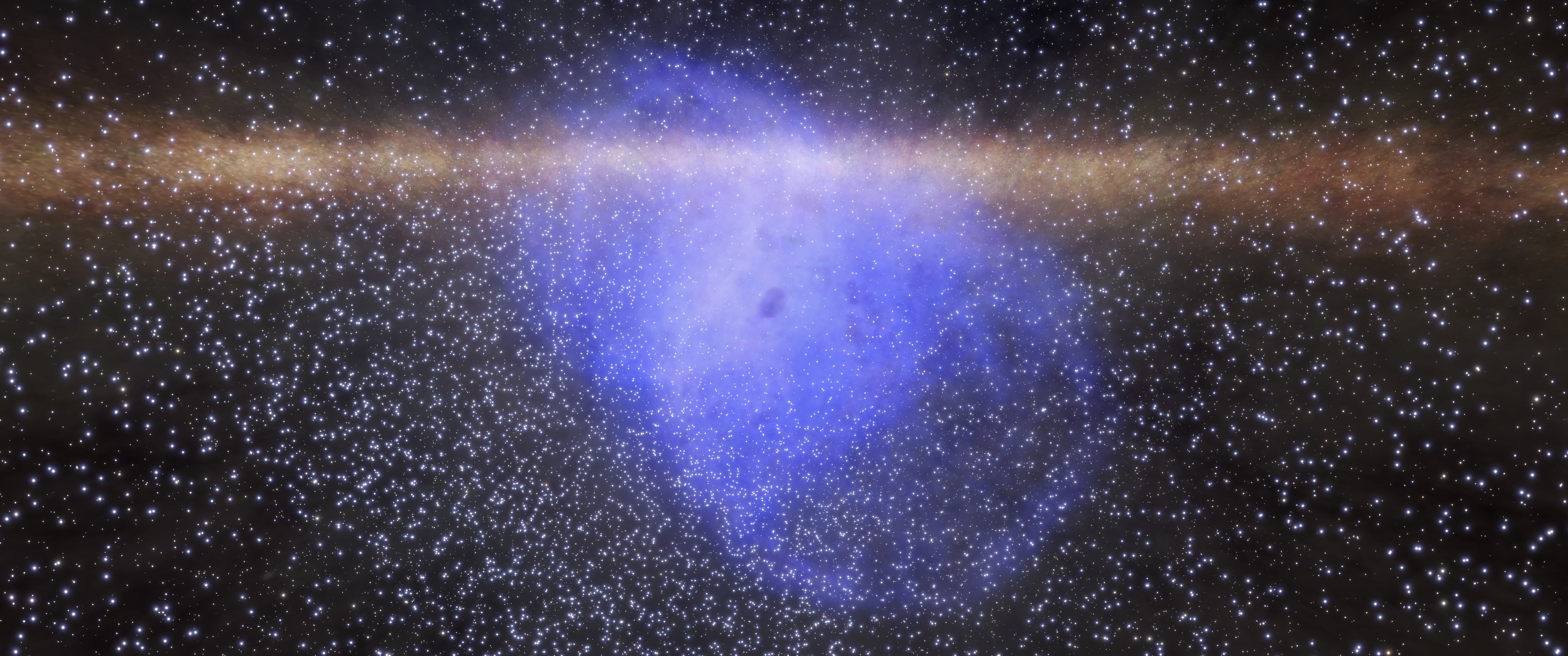 Compared to that moon, this planet's night sky is considerably darker (although it would still be something of a stretch to call it dark), and living here would be quite different. This is not just because of the temperature differences; the gravity is much higher here (1.2 g versus 0.66 g there) and days take longer. Both worlds have long years, which is not surprising for a system like this. However, since neither have an axial tilt to speak of, that doesn't make as much of a difference. The other planets of the nebula are quite unremarkable. Thanks to the system's location around the galactic core, there are plenty of sights to see and places to discover nearby, and the nearest star is only 1.19 ly away. Here is how the cloud looks when viewed from there: