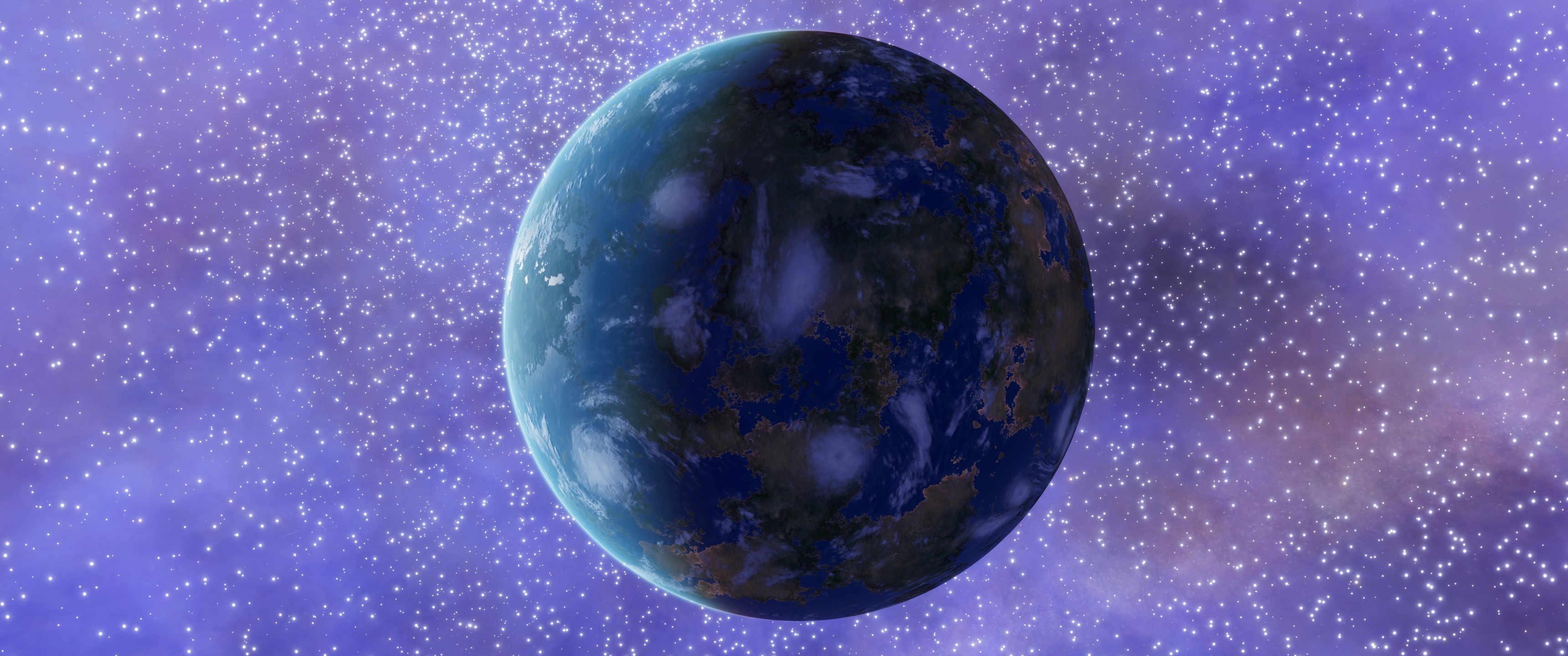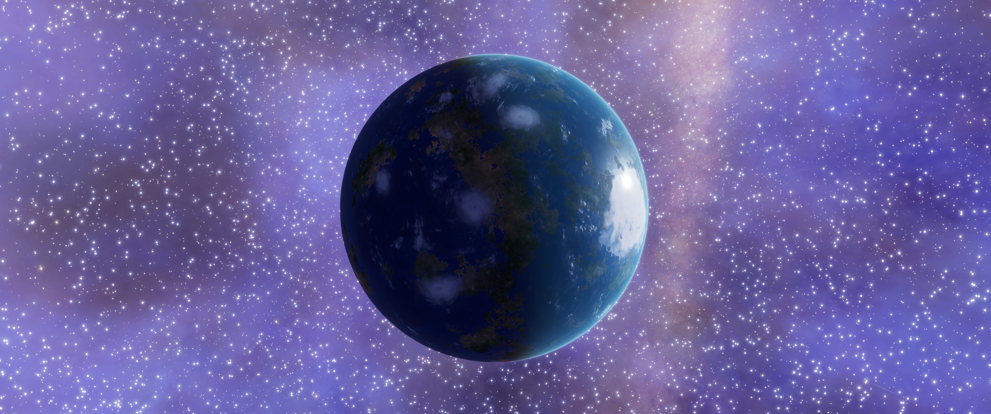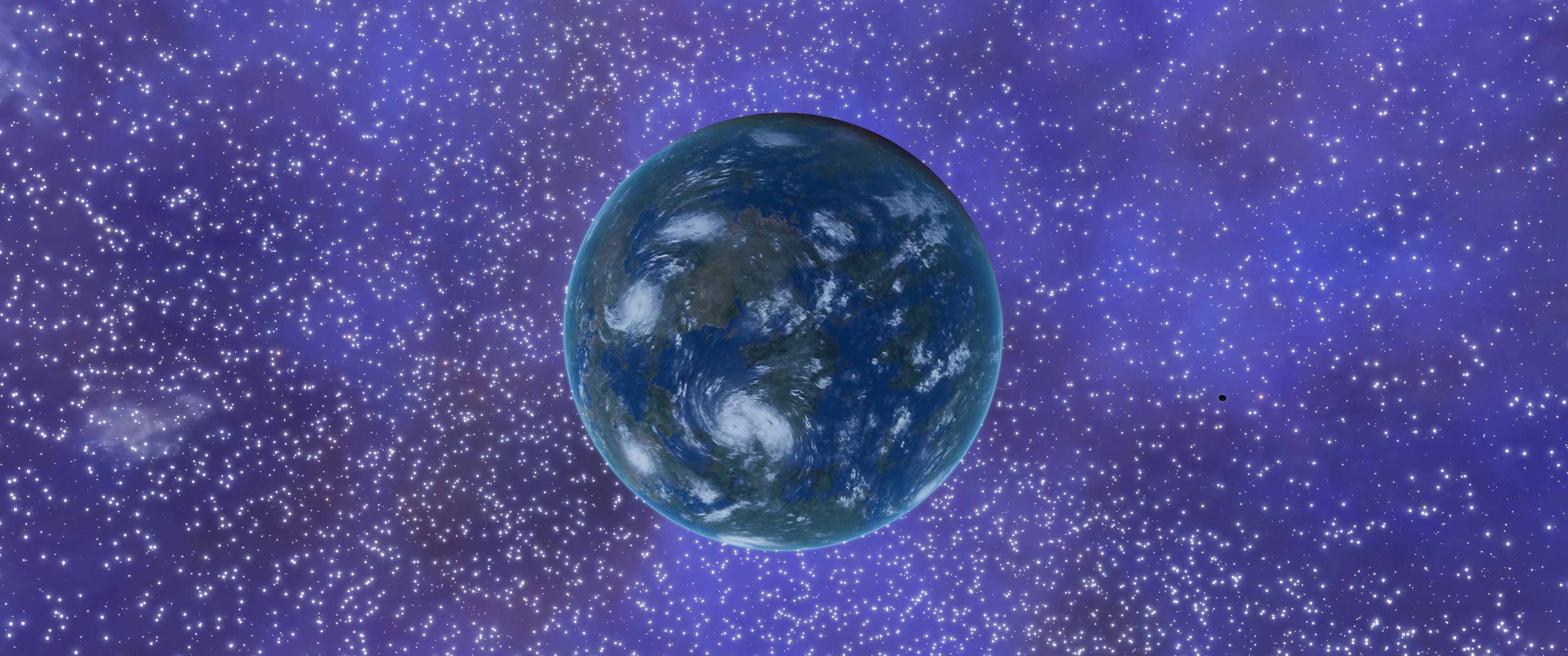 This 1 a moon is the first Earth-like in the system, and it's not a warm place: its average surface temperature is only 260 K, which is the limit of habitability as defined by Universal Cartographics. Thankfully, the moon's other characteristics are nowhere near as "uncomfortable". There is one thing that stands out from them though: the nights on this planet are still relatively bright (as seen in the image above), thanks to the light emitted by the ionized gas of the nebula. As this system is around the edge of the galactic core, the sky is filled with stars too.