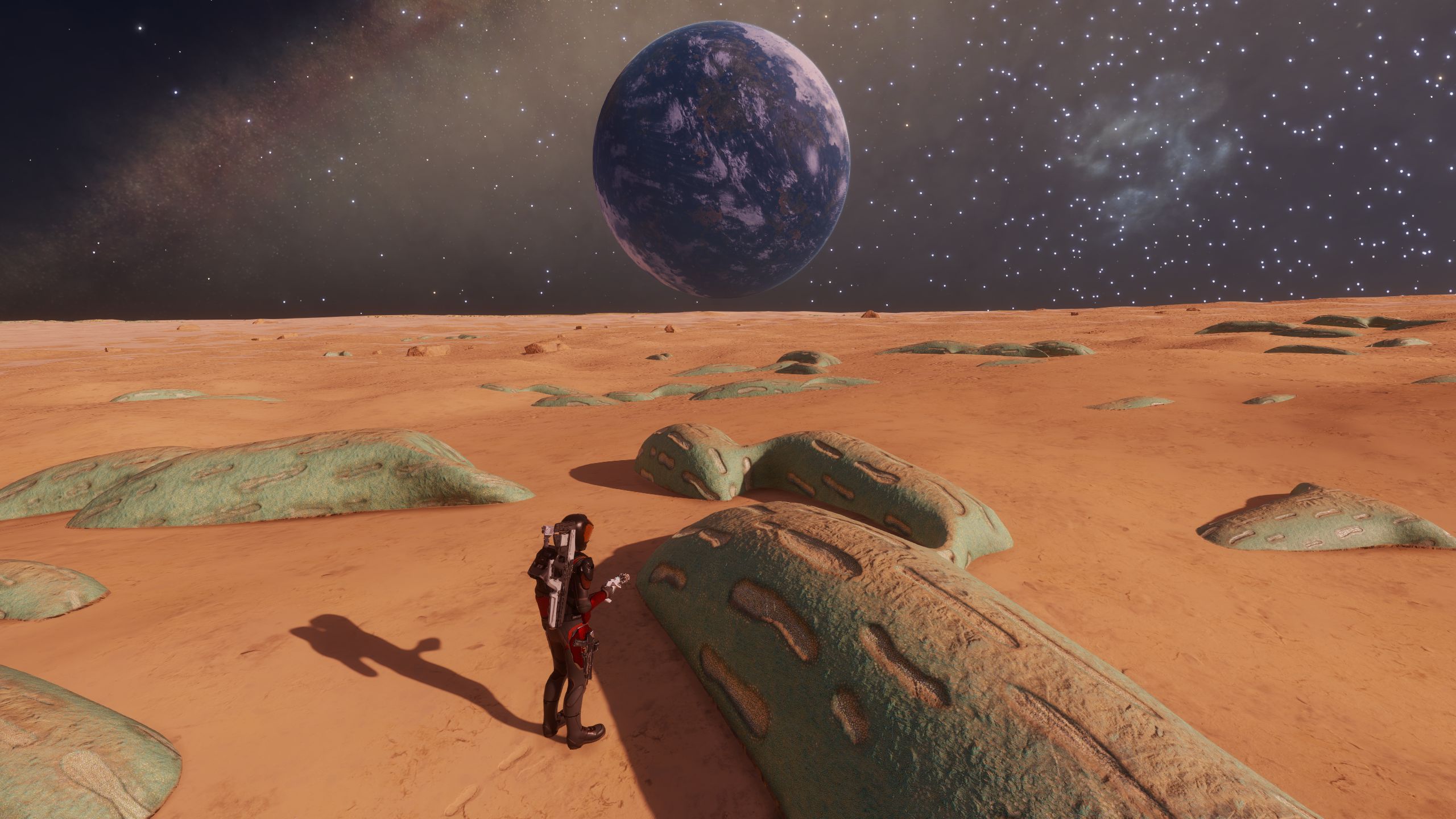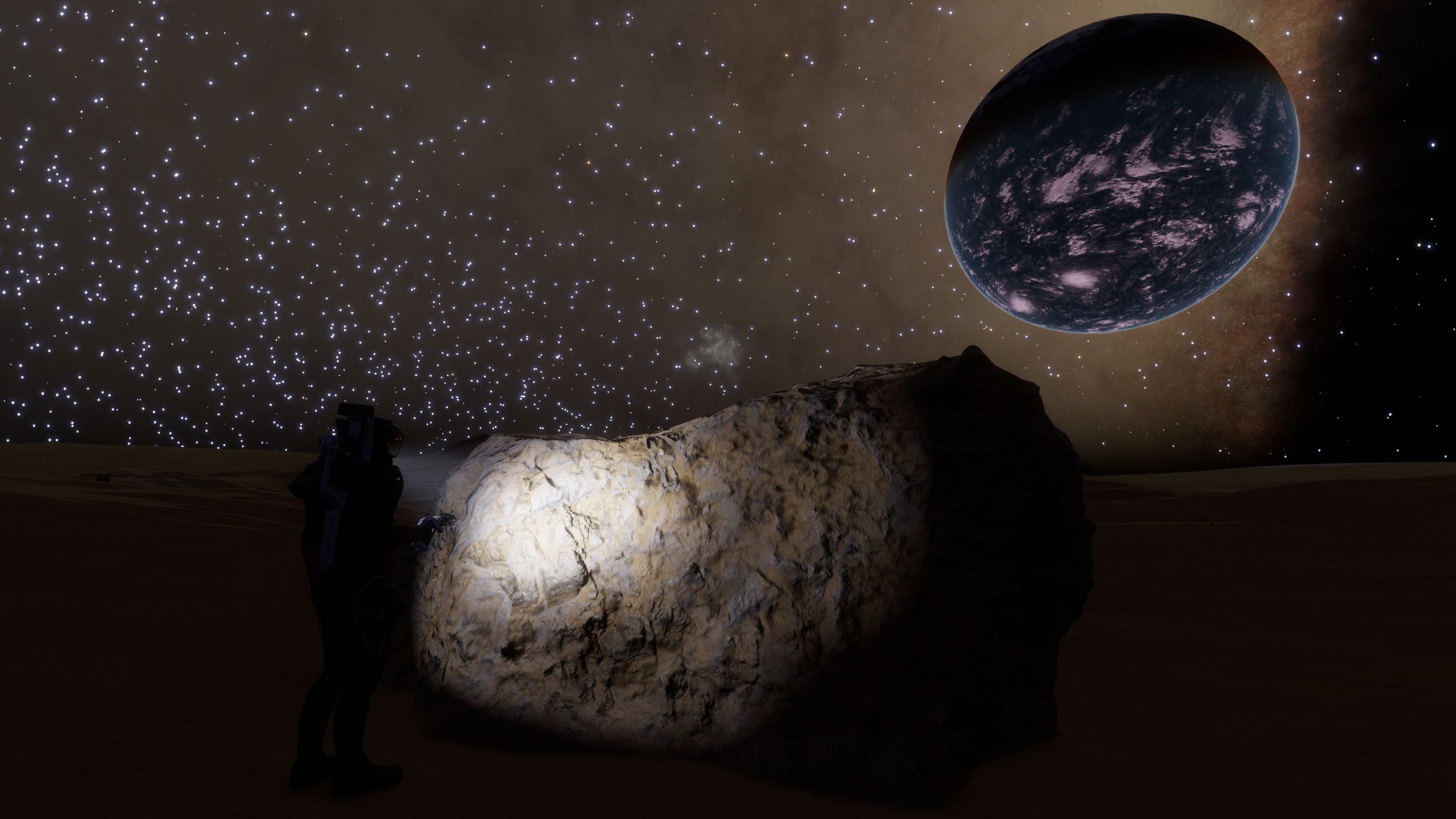 Description: A black hole, orbited by a brown dwarf star, orbited by a blue Earth-like moon, orbited by a thin atmospheric nested moon. As of 3308. May, this system is the only known example of such a configuration: thirty other atmospheric nested moons are known, but their atmospheres are all too thick for them to be landable. The nested moon 1 c a has a Sulphur Dioxide atmosphere and major Silicate Vapour geysers, and while there is life to be found here, the surface gravity (at 0.31 g) is too high for anything other than Bacteria and Strata to be present. In such orbital configurations, the parents tend to be much closer to their moon(s) than usual, so down from the surface, they appear large on the sky: Normally, explorers would see such Earth-like planets as blue and green, but as this system is bathed only in the dim red light of an L dwarf star, the green lands appear as a shade of brown instead. Even the day sides of the bodies are not much brighter than their night sides. There are also a number of other moons farther away from the dead star that have thin atmospheres of various kinds as well, but their surfaces are so cold and dark that only Bacteria survive on them. | |